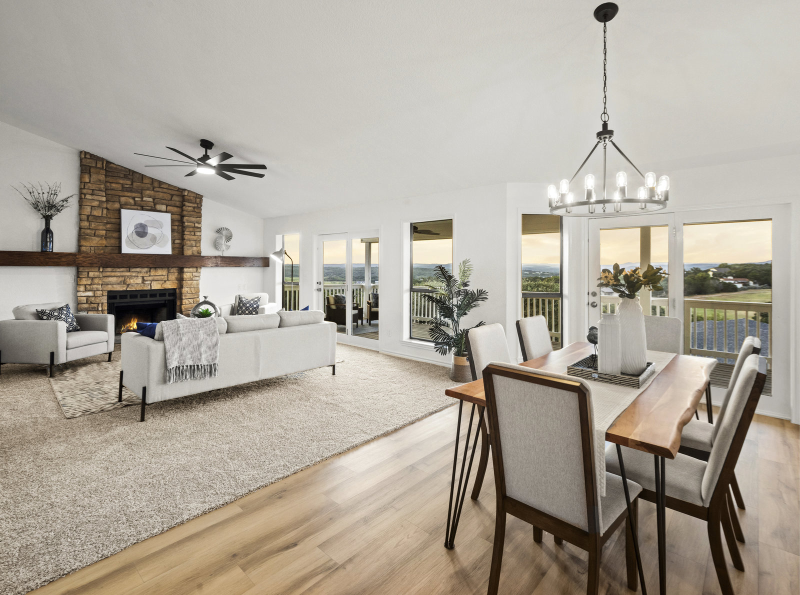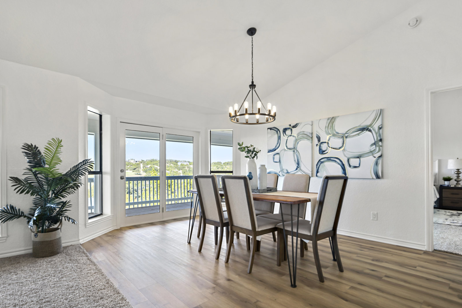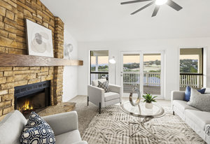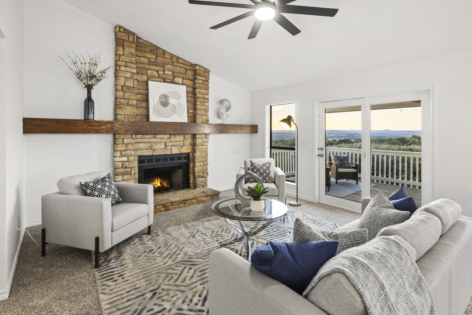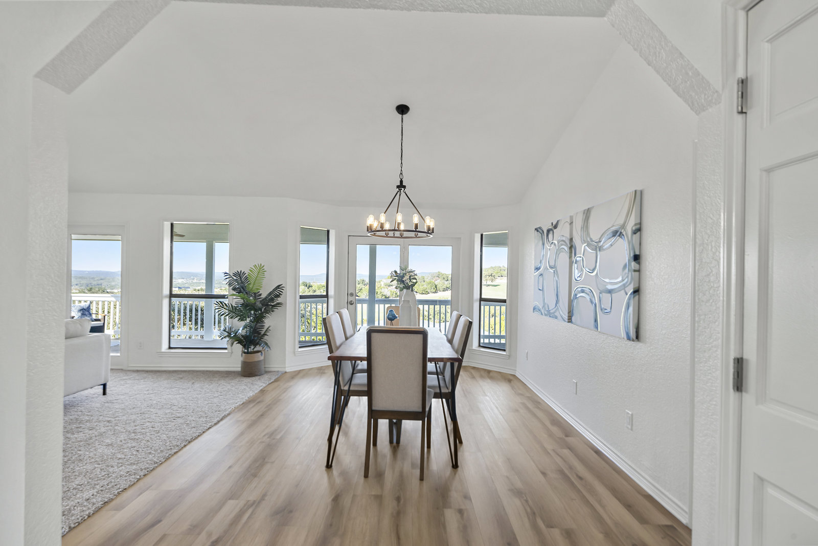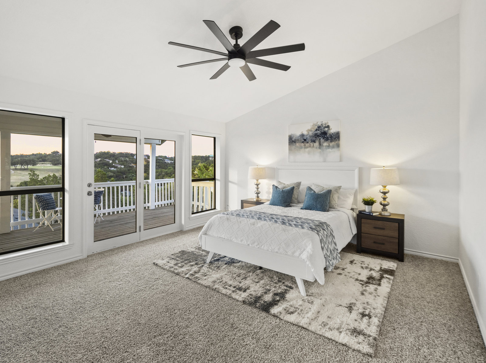 Beautifully updated 3 bedroom, 2.5 bathroom home on a large .336-acre lot with a private pool offering panoramic views of the Lago Vista Golf Course’s 15th fairway and green, Pace Bend Park, Lake Travis, and hill country sunsets! Set back from the street with a private extended driveway and a 2-car side-facing garage, this residence ensures both privacy and convenience. Step inside to an open-concept living space adorned with high vaulted ceilings and abundant natural light. The spacious living area features a modern ceiling fan and a floor-to-ceiling stone fireplace with a custom wood mantel, creating a warm and inviting atmosphere. Adjacent to the living area is a dining space highlighted by a stunning chandelier, perfect for entertaining guests. The chef’s kitchen boasts white cabinetry, quartz countertops, ample storage, and sleek stainless-steel appliances, making it a culinary haven just steps away from the dining area. Upstairs, the primary suite offers a serene retreat with a vaulted ceiling, two walk-in closets, and a private en-suite bath featuring a quartz-topped dual vanity and a luxurious jetted tub/shower combo. Both the living area and primary bedroom have direct access to the covered terrace, where you can unwind underneath the ceiling fans and take in incredible views of the Lago Vista Golf Course’s 15th fairway and green, Pace Bend Park, Lake Travis, and spectacular hill country sunsets. The expansive backyard is an outdoor oasis, complete with a terraced covered patio and composite decking that surrounds the private above-ground pool. The extended driveway provides ample parking space for RVs, boats, or jet skis, accommodating all your outdoor recreational needs. Other features include a recent roof, interior/exterior paint, lighting, appliances, fencing, drainage, water heater, and more. Situated on a large lot, this home offers unparalleled privacy and a prime location to enjoy stunning views and serene living. Schedule a showing today!