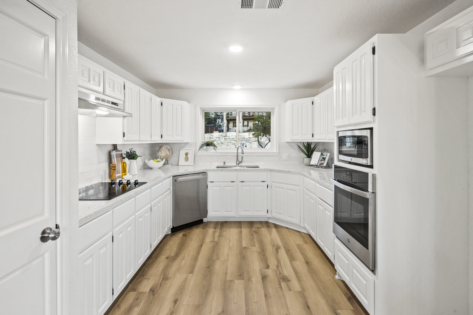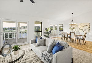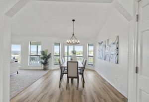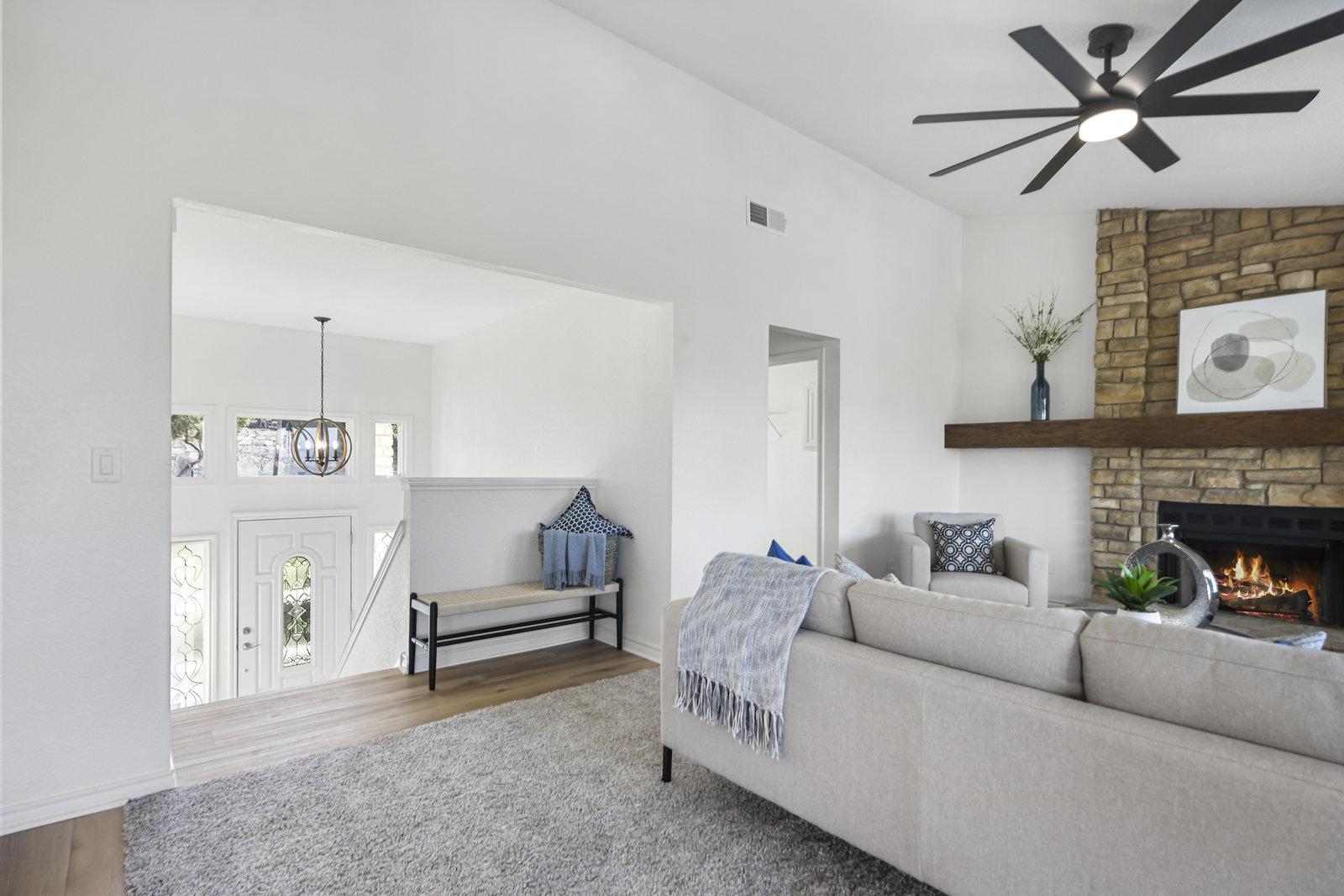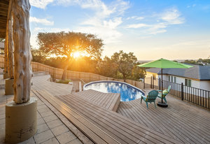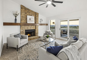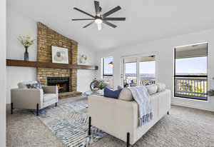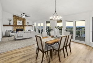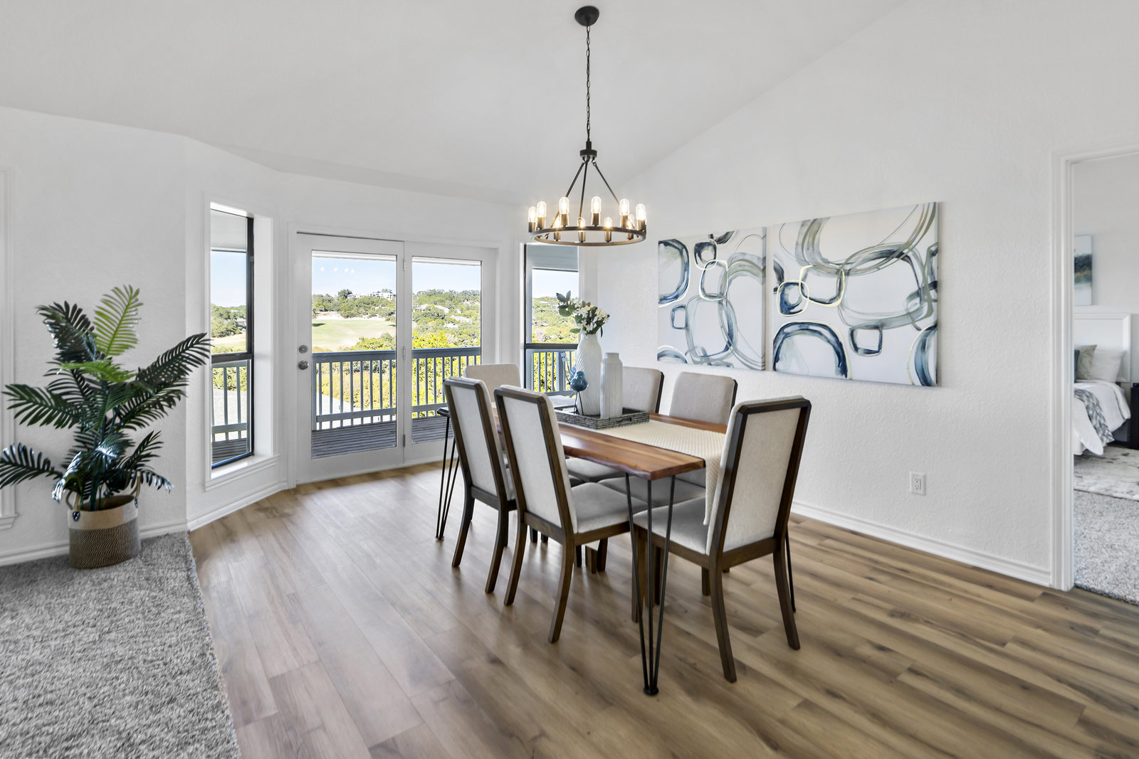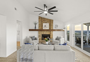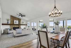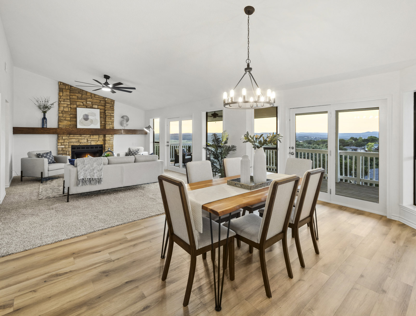 Beautifully updated 3 bedroom, 2.5 bathroom home on a large .336-acre lot with a private pool offering panoramic views of the Lago Vista Golf Course’s 15th fairway and green, Pace Bend Park, Lake Travis, and hill country sunsets! Set back from the street with a private extended driveway and a 2-car side-facing garage, this residence ensures both privacy and convenience. Step inside to an open-concept living space adorned with high vaulted ceilings and abundant natural light. The spacious living area features a modern ceiling fan and a floor-to-ceiling stone fireplace with a custom wood mantel, creating a warm and inviting atmosphere. Adjacent to the living area is a dining space highlighted by a stunning chandelier, perfect for entertaining guests. The chef’s kitchen boasts white cabinetry, quartz countertops, ample storage, and sleek stainless-steel appliances, making it a culinary haven just steps away from the dining area. Upstairs, the primary suite offers a serene retreat with a vaulted ceiling, two walk-in closets, and a private en-suite bath featuring a quartz-topped dual vanity and a luxurious jetted tub/shower combo. Both the living area and primary bedroom have direct access to the covered terrace, where you can unwind underneath the ceiling fans and take in incredible views of the Lago Vista Golf Course’s 15th fairway and green, Pace Bend Park, Lake Travis, and spectacular hill country sunsets. The expansive backyard is an outdoor oasis, complete with a terraced covered patio and composite decking that surrounds the private above-ground pool. The extended driveway provides ample parking space for RVs, boats, or jet skis, accommodating all your outdoor recreational needs. Other features include a recent roof, interior/exterior paint, lighting, appliances, fencing, drainage, water heater, and more. Situated on a large lot, this home offers unparalleled privacy and a prime location to enjoy stunning views and serene living. Schedule a showing today!