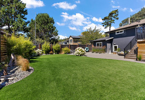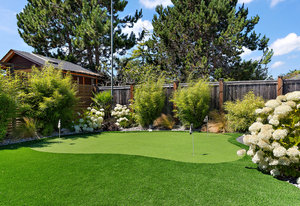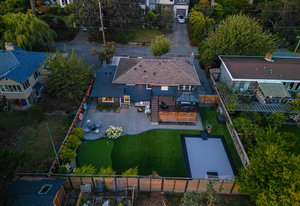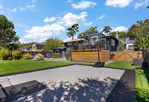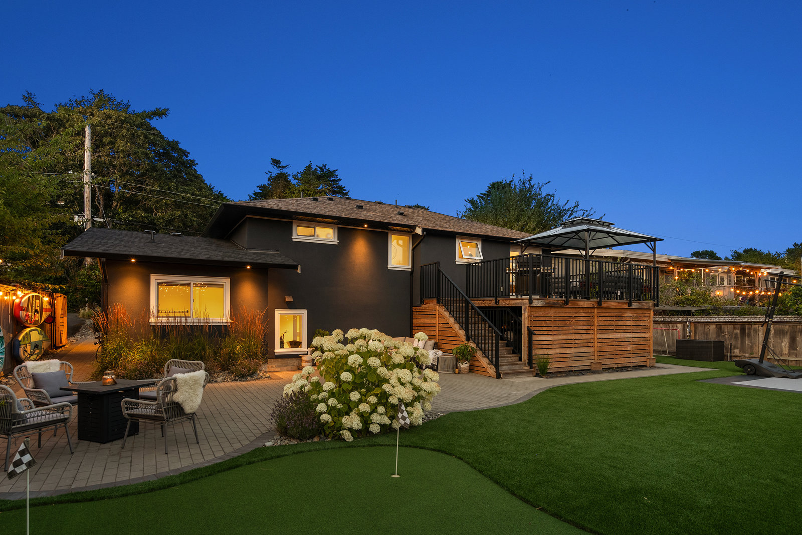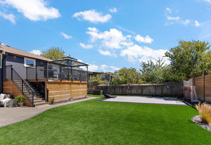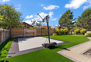 The exterior is an absolute haven for the active family. The flat, south-facing, and fully fenced backyard has been professionally landscaped to include a custom turf sport court—ideal for basketball, tennis, hockey, or pickleball—and a charming chip-and-putt green. For those prioritizing practicality, the property includes convenient RV parking and an EV charger, alongside significant system updates including new perimeter drains.