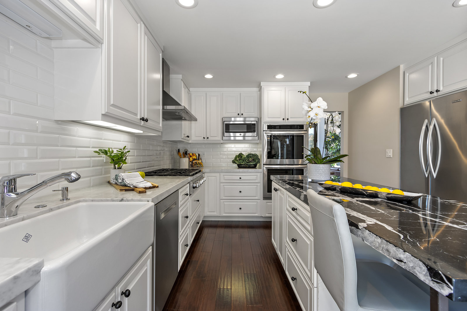 - Gorgeous Chef’s Kitchen with carrera countertops with subway tile backsplash and Shaw’s farmhouse sink. Stainless steel appliances: KitchenAid refrigerator, KitchenAid built-in double ovens, Dacor six burner gas range, Bosch dishwasher. Full panty, island with black marble countertop including seating for casual dining, and wood flooring. Sliding door opens to the charming rear patio.