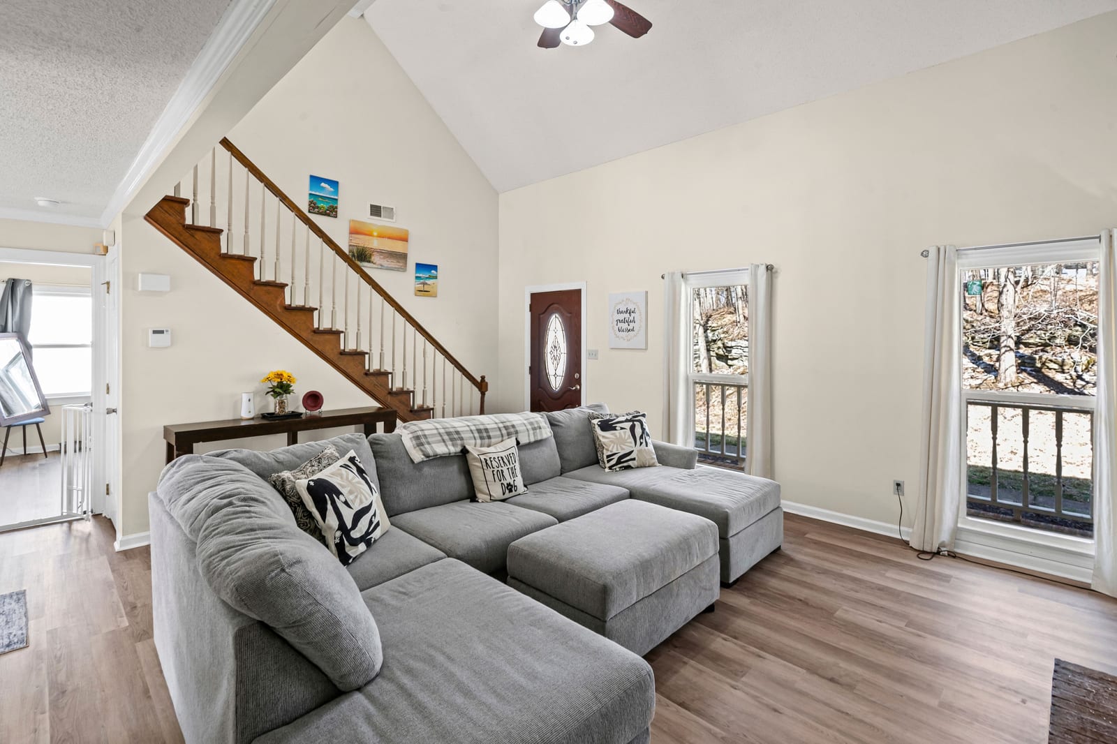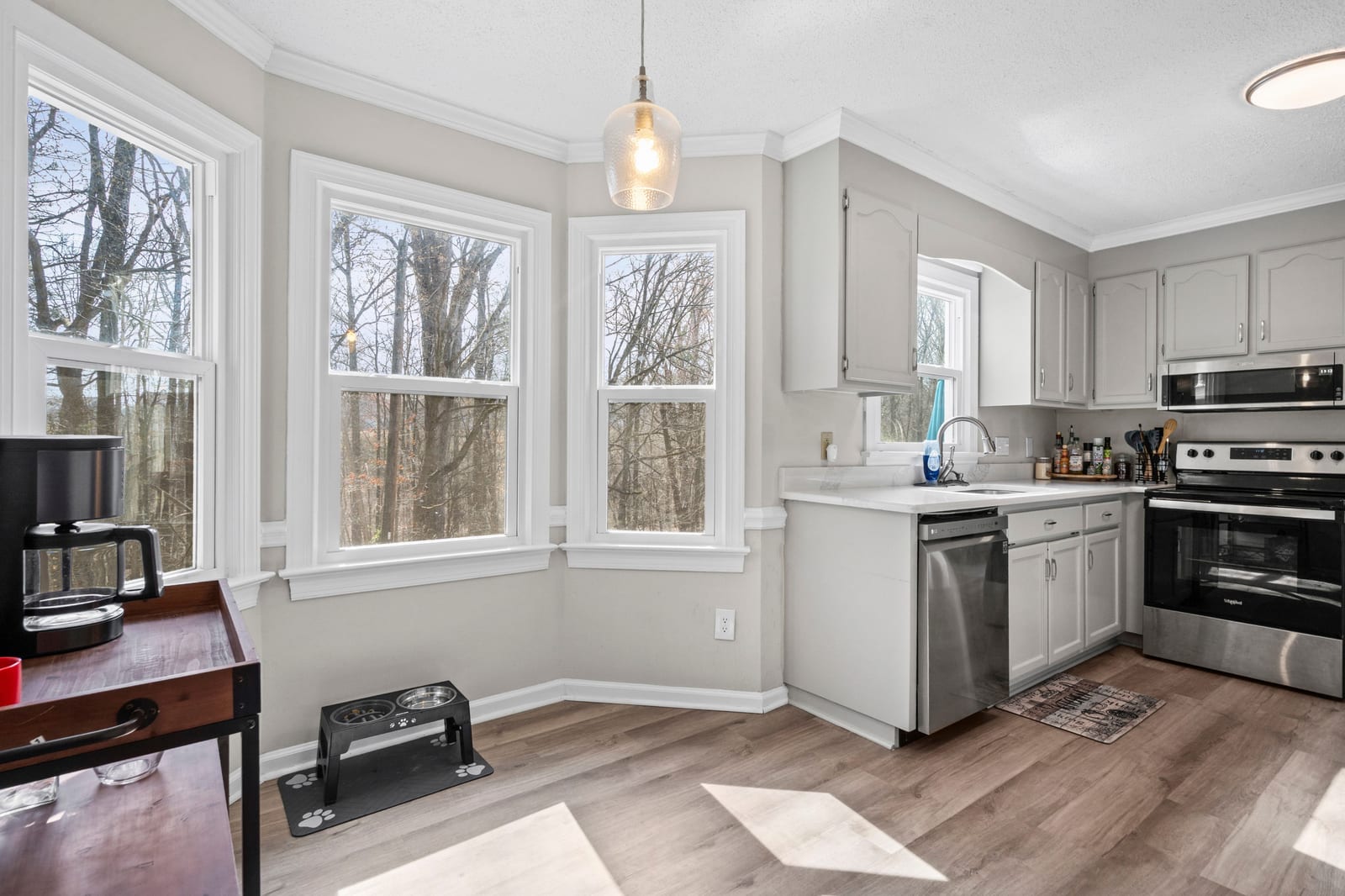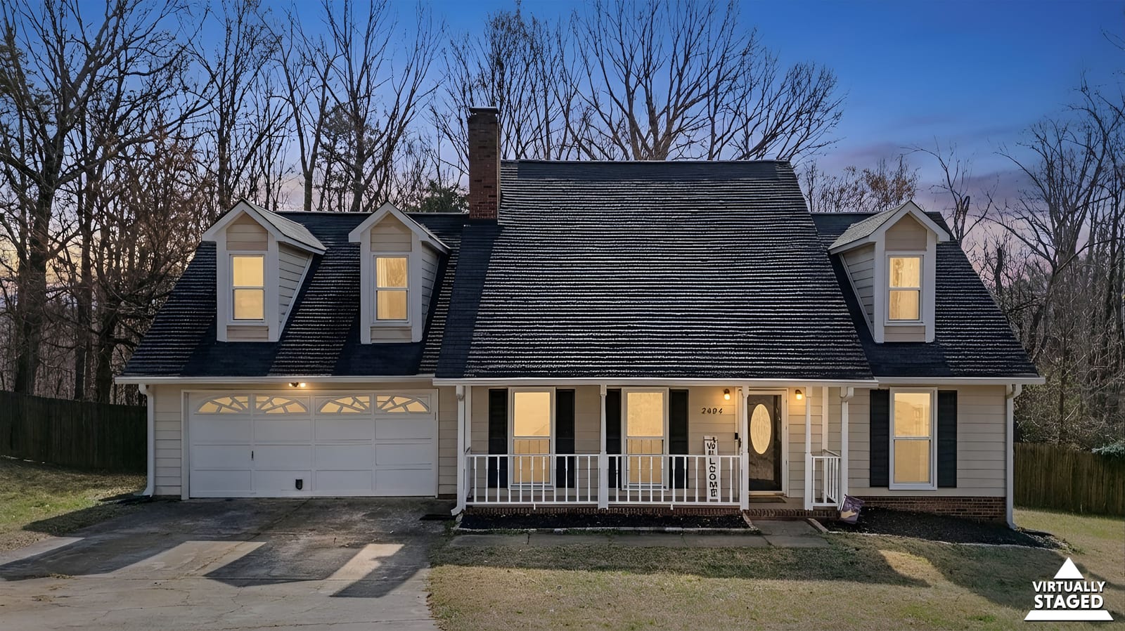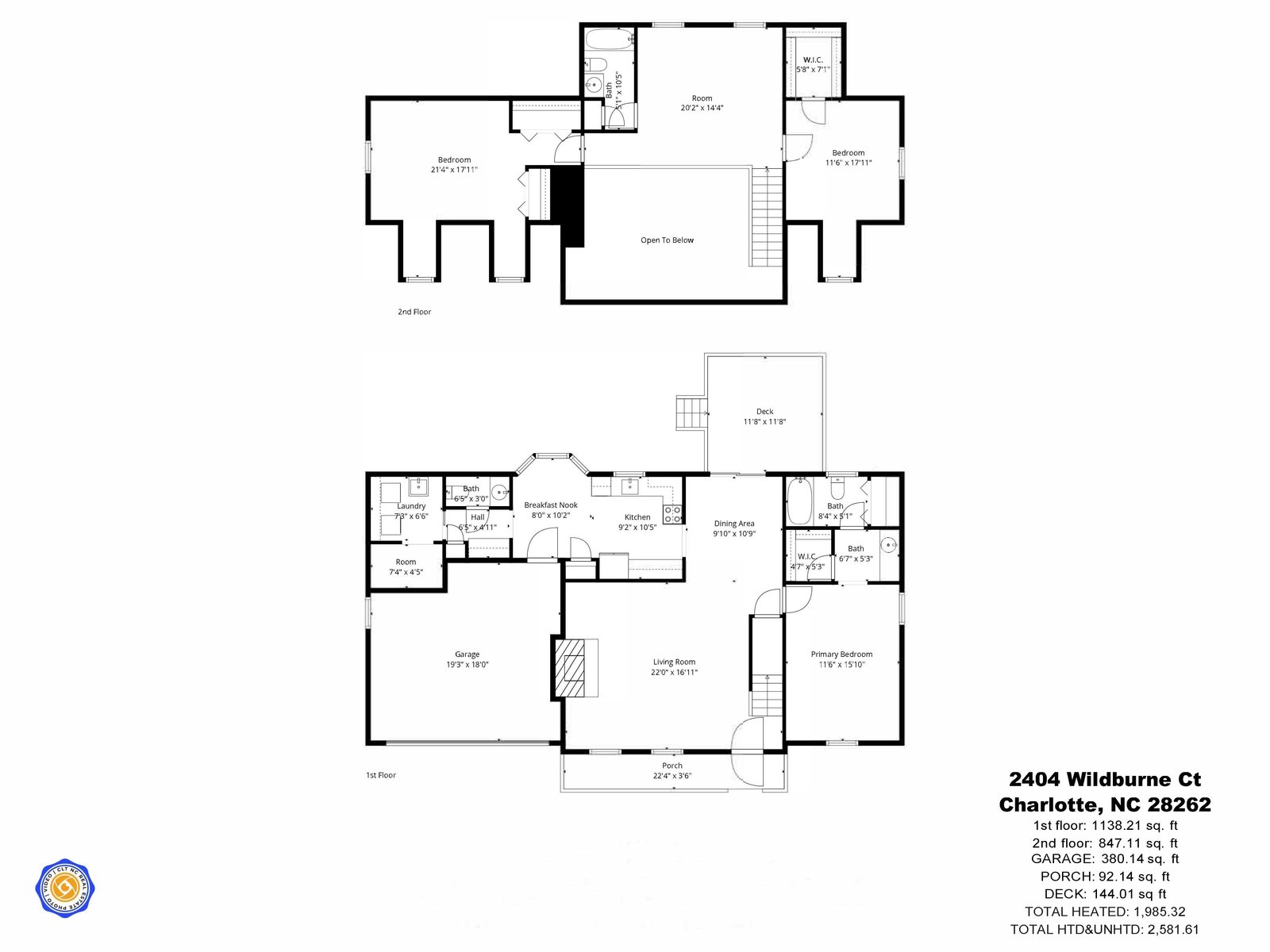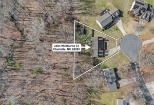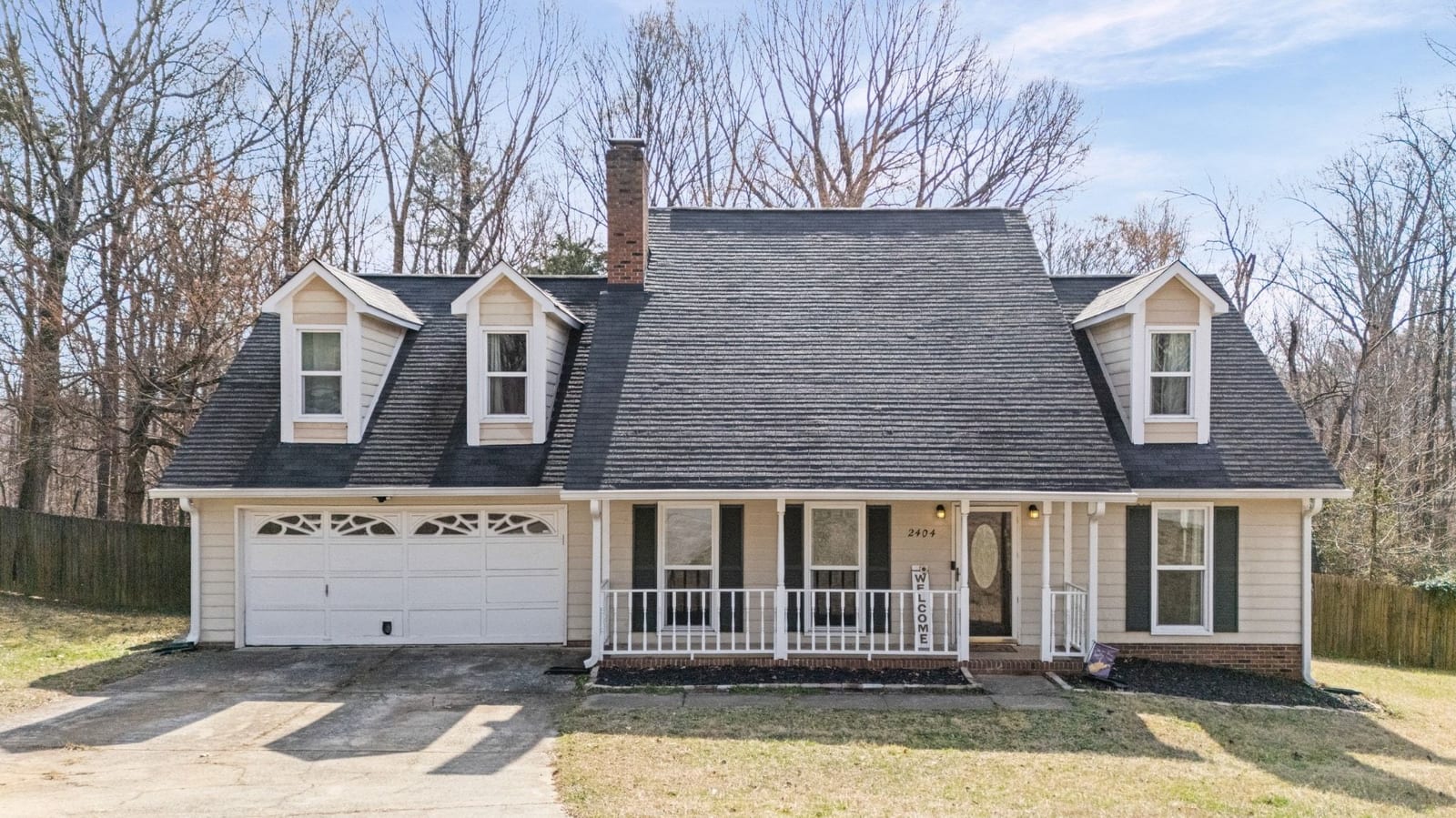 Welcome to 2404 Wildburne Court, a beautifully updated 3-bed, 2.5-bath single-family home nestled on a quiet cul-de-sac in the highly desirable Houston Farms subdivision of Charlotte. Built in 1990, this classic residence combines charm with thoughtful modern upgrades and offers 1985 sq ft of well-designed living space on a 0.26-acre level, wooded lot, perfect for both everyday living and entertaining. Inside, discover a spacious vaulted two-story great room centered around a wood-burning fireplace, creating an open and inviting atmosphere. The heart of the home is the modernized kitchen, featuring quartz countertops, painted cabinetry, stainless-steel appliances, and abundant storage. A convenient coffee bar, large pantry, and dedicated laundry room add to the functional layout. The primary bedroom on the main level enhances accessibility and comfort, while two additional upstairs bedrooms, a full bath, and a versatile loft space provide flexible living or work-from-home options. Outdoors, enjoy a covered rocking-chair front porch overlooking the cul-de-sac and a fenced, private backyard with a generous deck, ideal for barbecues, relaxing, or play. A large storage shed adds practicality for yard tools and outdoor gear. New gutter guard gutters installed in 2024. Additional highlights include an attached two-car garage, no HOA restrictions, and proximity to major highways, shopping, dining, and parks, combining convenience with peaceful neighborhood living.