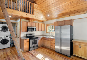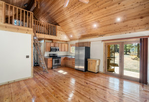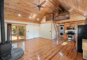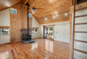 A separate cabin with its own septic system adds even more charm. Rustic wood finishes, soaring vaulted ceilings, one bedroom, one bath, a full kitchen, and a fun ladder loft make this space perfect for guests, hobbies, or a cozy mountain getaway.