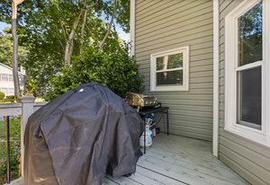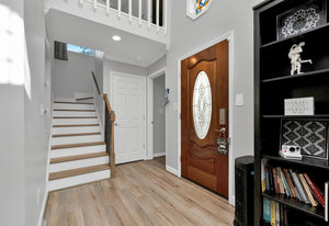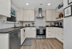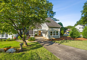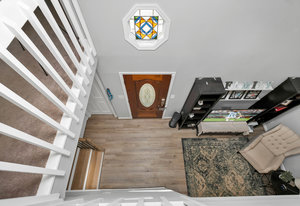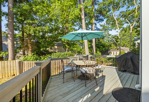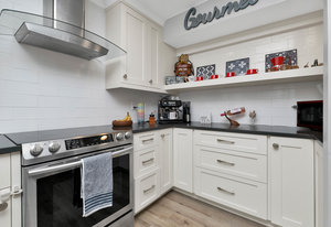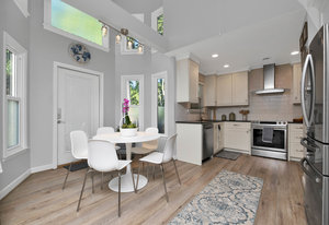 The moment you step through the front entrance, you'll be greeted by an open foyer, vaulted ceilings, and an abundance of natural light, creating an atmosphere of warmth and openness. The interior of the home presents a spacious living area that effortlessly connects to the kitchen, offering convenient patio access. Prepare to be delighted by the fully updated eat-in kitchen, complete with new designer stainless-steel appliances, quartz countertops, stylish tile backsplashes, and custom cabinetry that provides ample storage, including a large built-in pantry. The expansive eating area boasts a charming deep walk-out bay, a cathedral ceiling with plenty of windows for abundant natural lighting, and grants easy access to the deck and backyard, perfect for hosting gatherings or enjoying quiet moments outdoors.