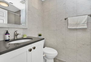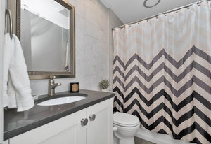 The lower level encompasses a master bedroom with an en-suite bathroom and generous closet space, providing a serene and private retreat. Upstairs, you'll find two additional bedrooms with ample closet space, all sharing a full bathroom. The house showcases new flooring throughout, modern light fixtures, updated windows, tiled bathrooms with quartz countertops, new vinyl siding, and plenty of storage options both inside and outside the home.