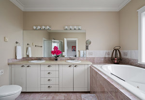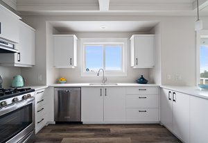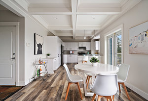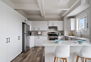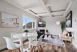 Inside, high-quality luxury laminate floors and tile flow seamlessly through the home, complemented by elegant crown moulding, wainscoting, and custom cabinetry with a built-in pantry. The kitchen features a gas stove, while the living area is warmed by a gas...