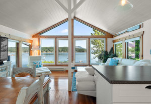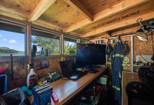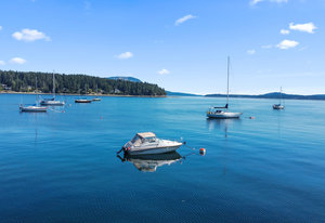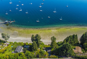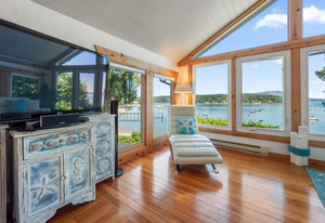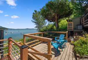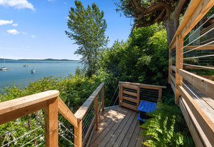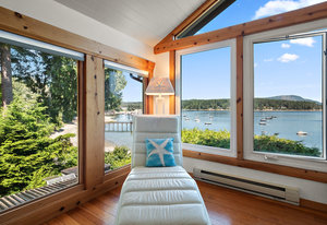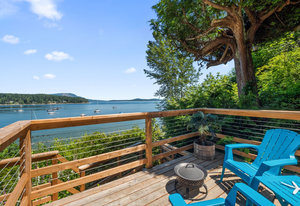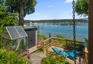 Outside, you'll find multiple sitting areas with views, an outdoor shower, a workshop, a wired bunkhouse, sheds, and a greenhouse. Private access to the beach is made easy with a newly constructed custom aluminum staircase. Additionally, a new 4,200-pound mooring block is located directly in front of the property on the water, perfect for boating enthusiasts. The property is equipped with a septic system and municipal water, ensuring all your needs are met.
