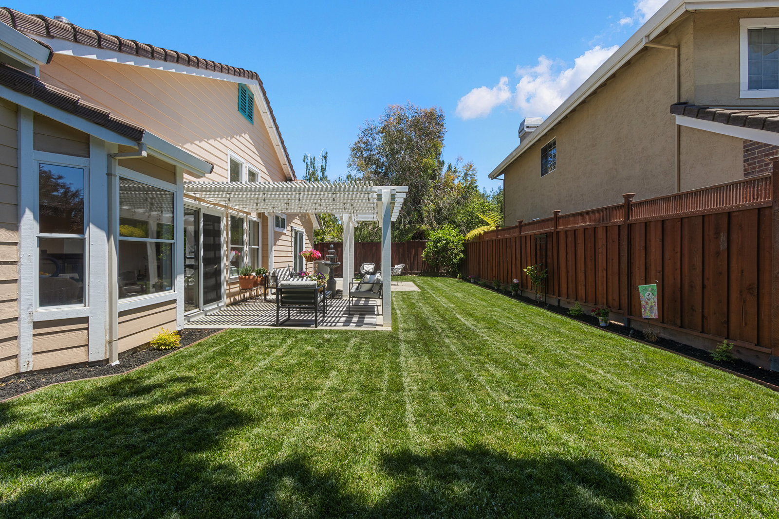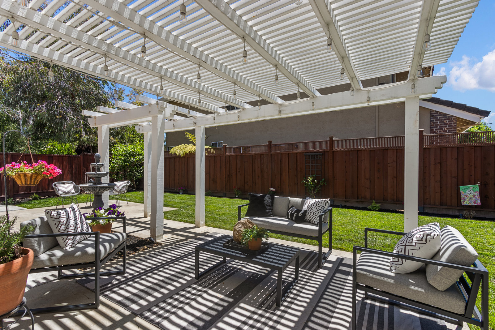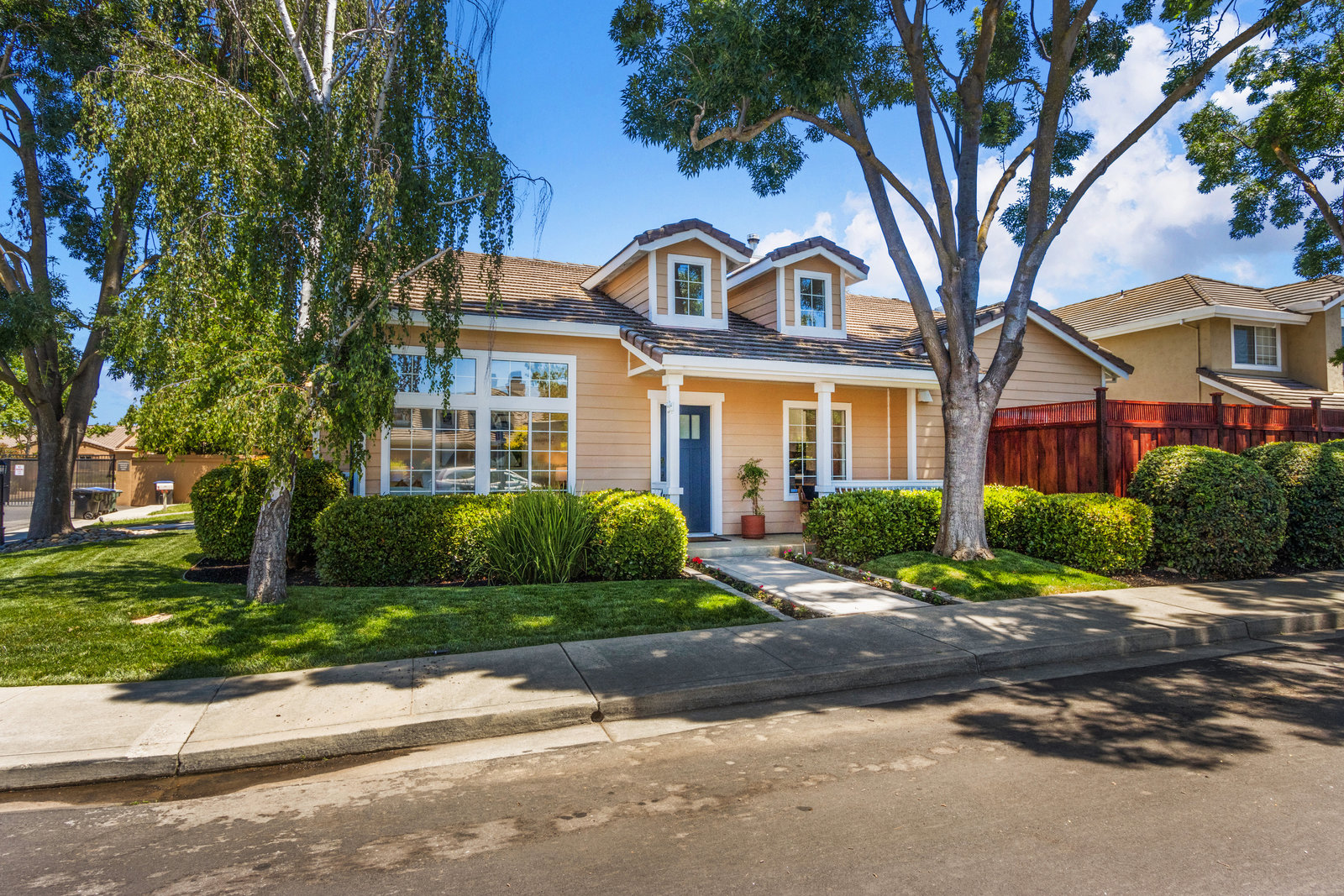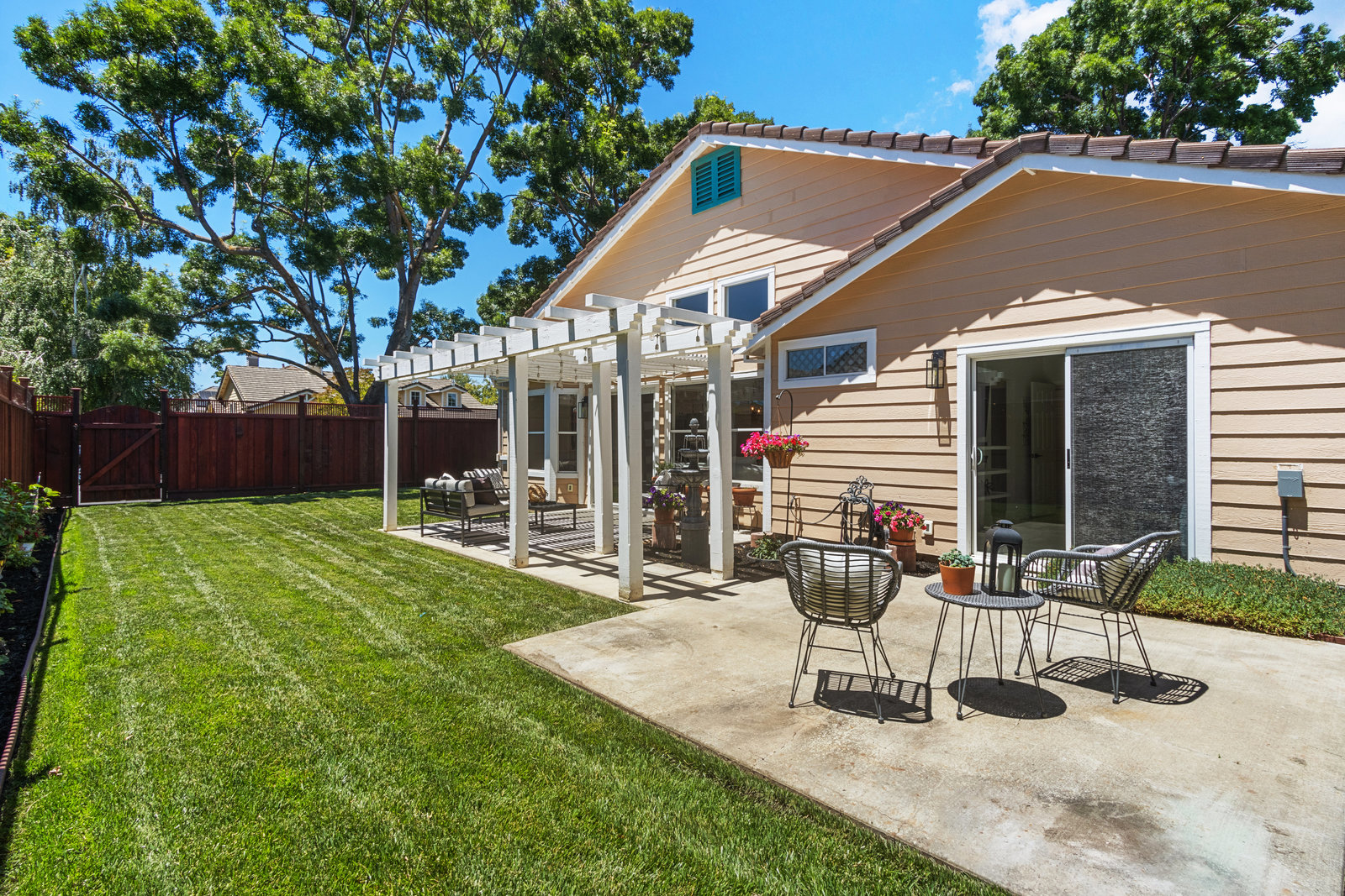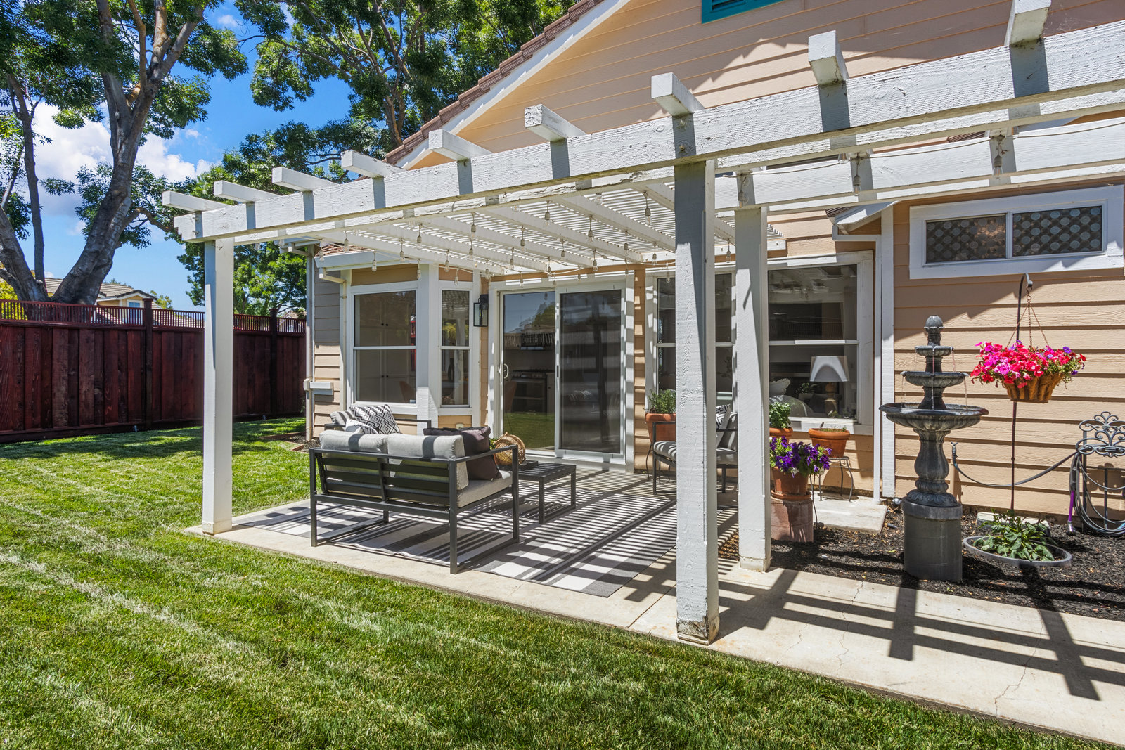 Beautifully updated home in a fantastic neighborhood! Built in 1994 with great curb appeal! Charming front porch, new front door and stamped concrete, cement tile roof. Near Fairlands Elem, Thomas Hart, shopping and quick walk to popular Meadows Park. Great ambiance with light filled spaces, vaulted ceilings, and an open floor plan that makes the home feel spacious yet comfortable. Newly refinished engineered hardwood floors throughout. Large formal living room with separate dining area. Open kitchen/family room combination with new stainless-steel appliances, kitchen nook, pantry, quartz counters. Welcoming great room enhanced by a modern see-through peninsula gas fireplace and built-in speakers. The primary suite features a built-in bookcase and two closets. Updated primary bath with new vanity, dual sinks, quartz, and new fixtures. Oversized tub, tile floor. Total of three bedrooms, all with closet organizers. Two full baths. Fun home for entertaining and relaxing with a pretty and private yard with a lush lawn. Recent fence replacement, remote controlled outdoor lighting and electric fountain. Patio is covered by a wood pergola. Recently painted interior, updated light fixtures and recessed lighting, Leviton smart home system.Newer central heat, AC, hot water heater.