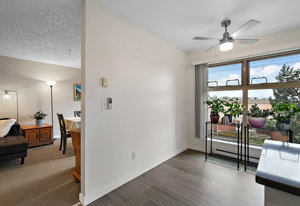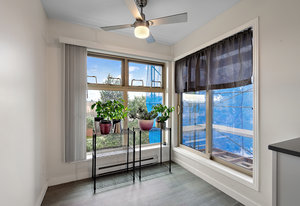 This captivating corner unit, bathed in natural light from its southwest-facing windows, is a rare find in today's competitive market. Start your day by preparing your favorite brew in the bright and airy U-shaped kitchen, equipped with pristine flooring, stainless steel appliances, and a stylish glass-tiled backsplash. Then, savor your morning meal in the inviting eating area, which seamlessly flows out to your own private, covered balcony.