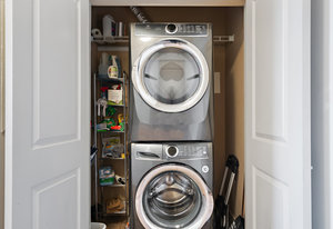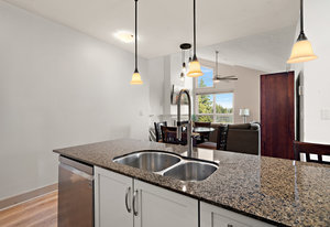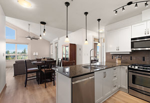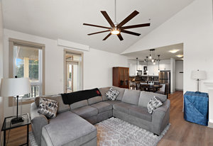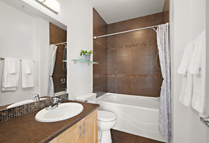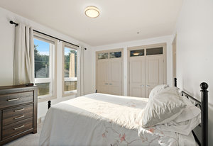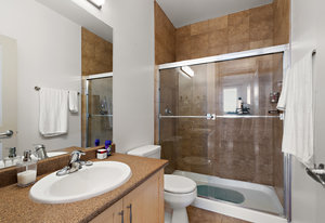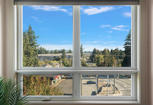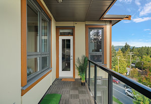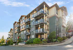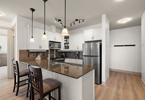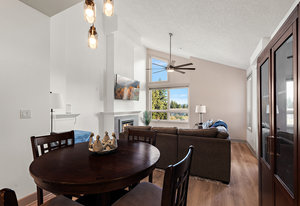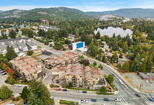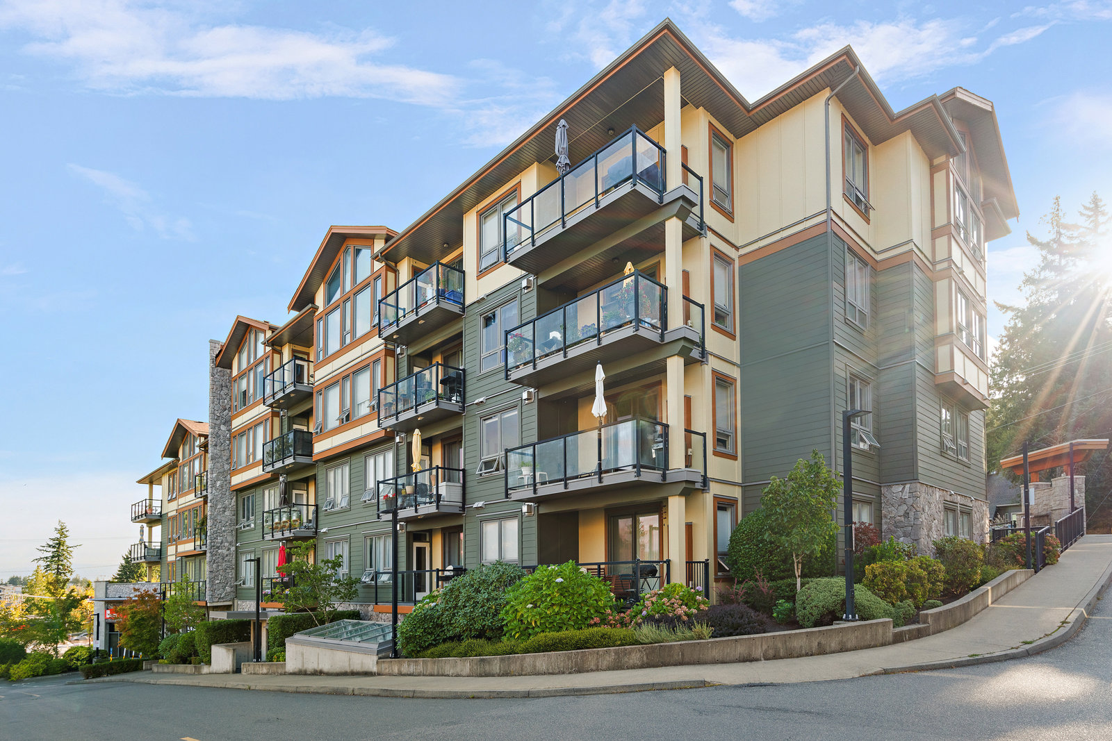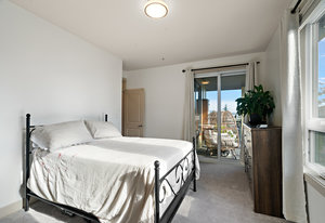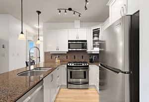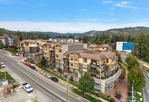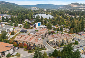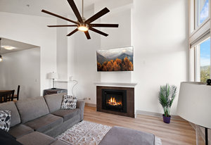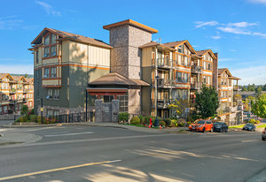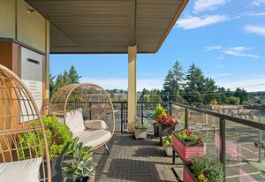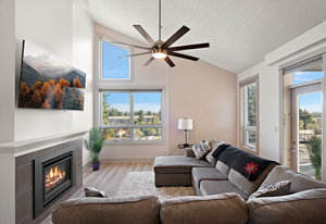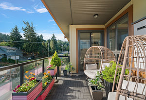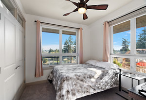 Beautiful top-floor corner unit with wrap-around patio offering great views and seamless outdoor living from the living area to the primary suite. Bright and airy with vaulted ceilings, this home boasts upgrades including modern ceiling fans, closet organizers, deck tiles, natural gas BBQ hook-up, in-floor heating in both bathrooms, upgraded lighting, granite counters with elegant cabinetry, and surround sound wiring. Enjoy two generous sizes bedrooms, two full bathrooms, a cozy gas fireplace, hot water on demand and full-size laundry in this nearly 1000 sq/f suite. The well-managed complex offers a gym, pool, meeting room, secured underground parking, bike racks, pet-friendly policies (no size ...