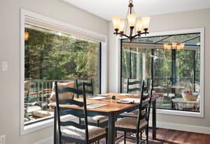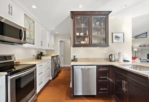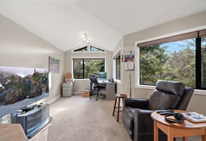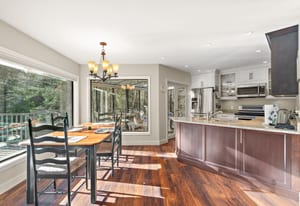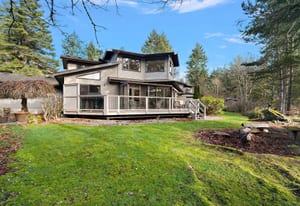 The main level captivates with wood floors and vaulted ceilings in the living and dining areas, complemented by a cozy wood-burning fireplace. Step out onto your expansive south-facing wrap-around deck and soak in serene park-like views. The updated open kitchen features solid surface countertops, cork flooring, and stainless steel appliances, flowing seamlessly into a bright sunroom that frames the stunning natural surroundings.