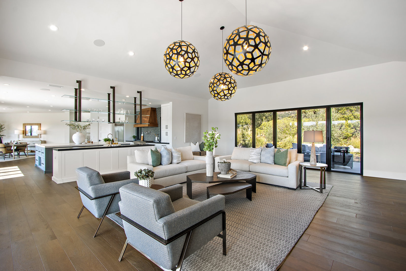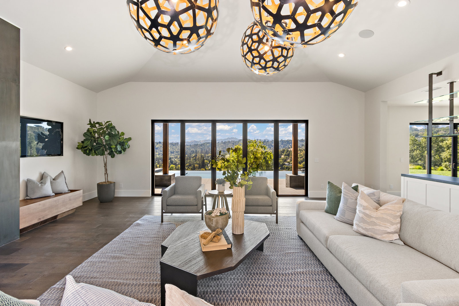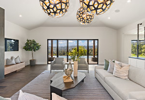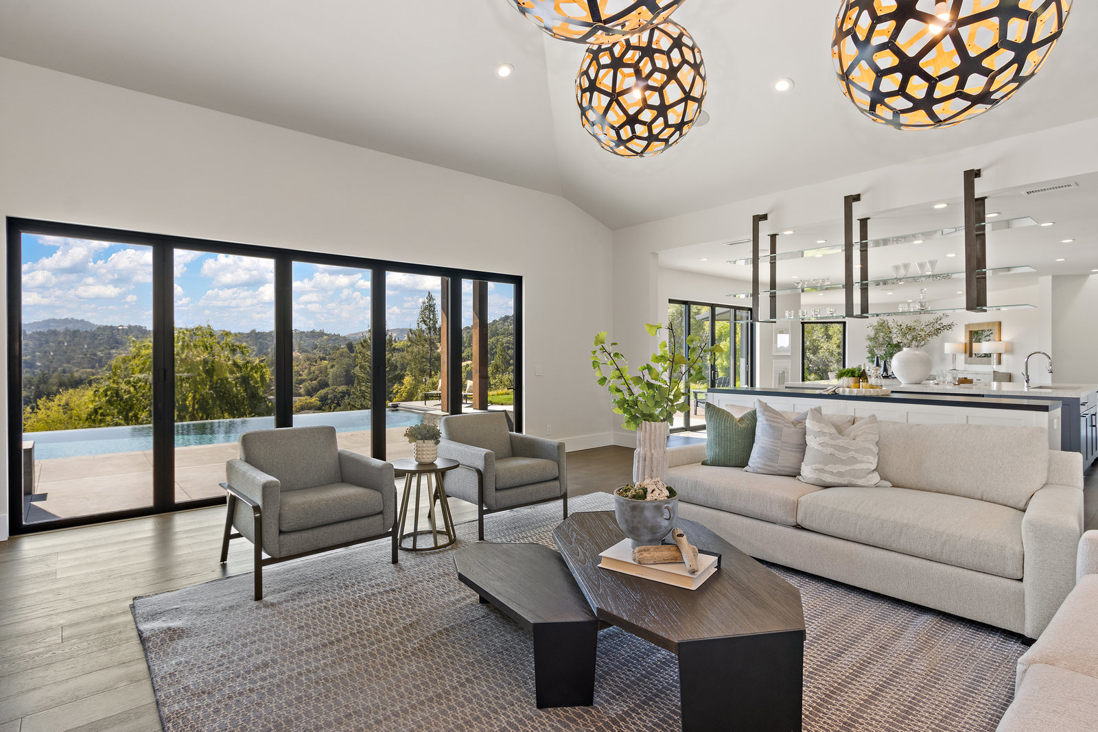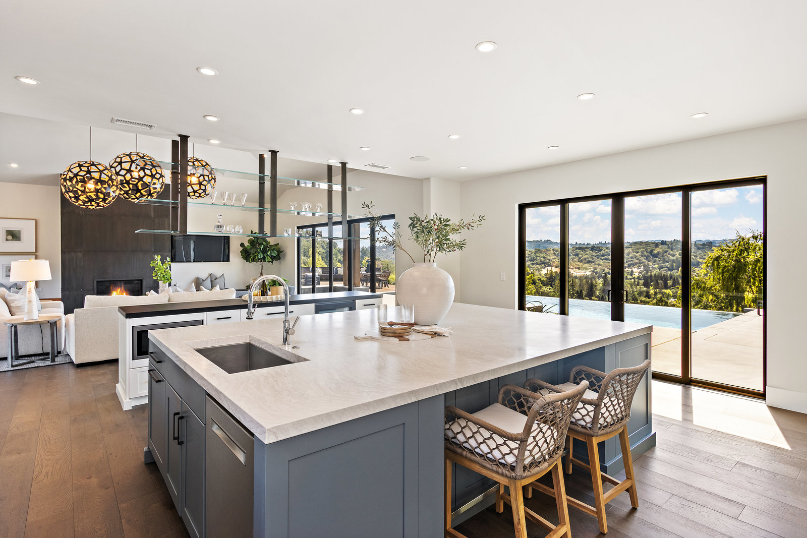 The spacious open floor plan is flooded with abundant natural light. Walls of glass highlight the captivating views from every living space and showcase the thoughtfully and professionally designed landscaping. Multiple outdoor seating areas are ideal for both relaxing and entertaining.