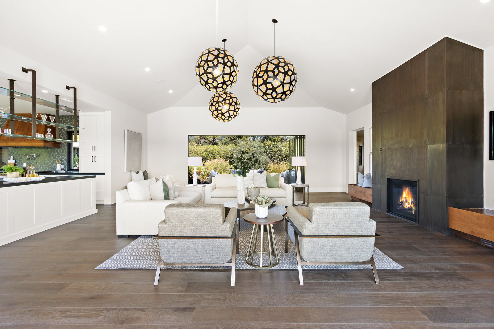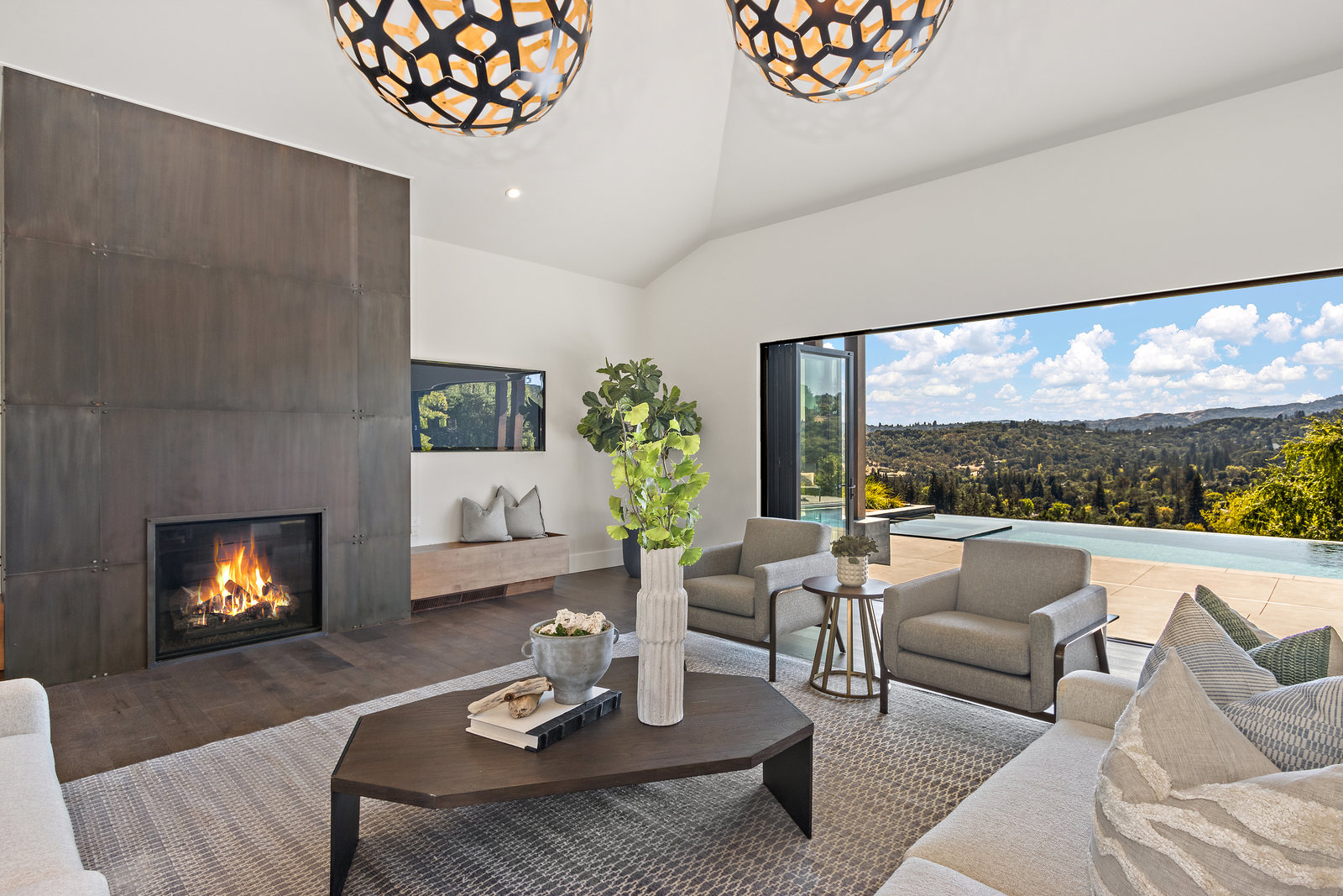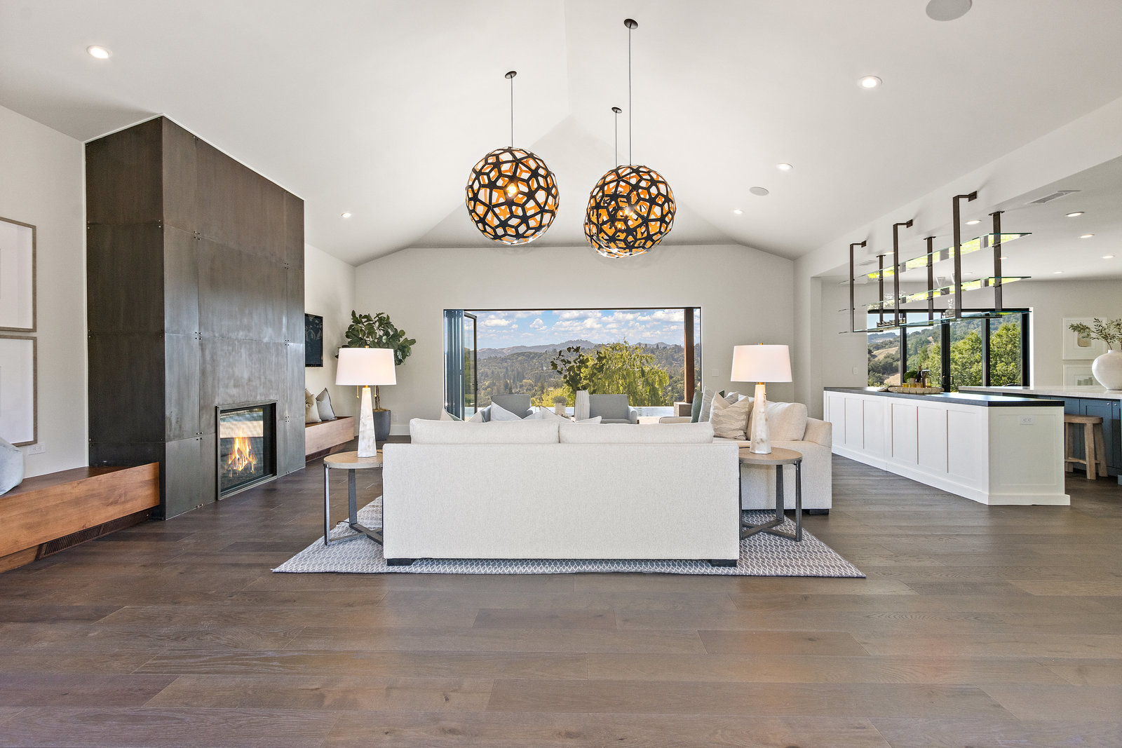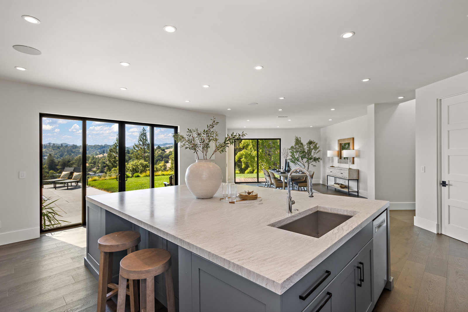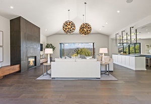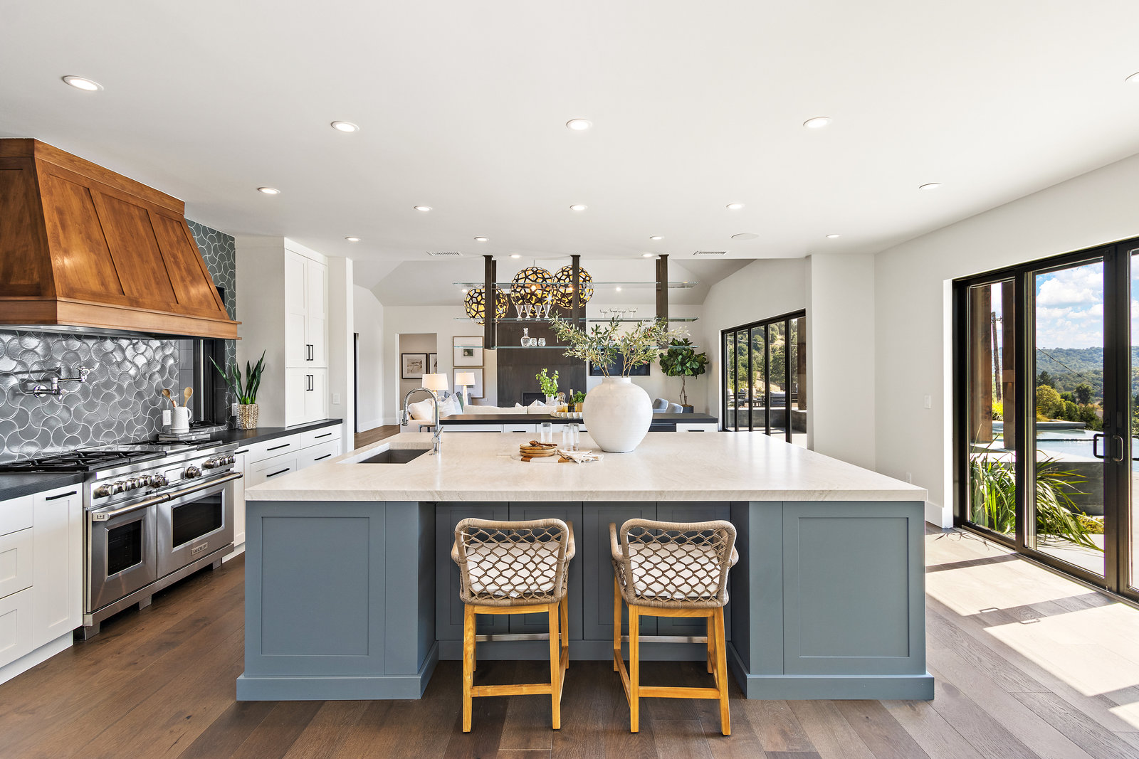 The spacious open floor plan is flooded with abundant natural light. Walls of glass highlight the captivating views from every living space and showcase the thoughtfully and professionally designed landscaping. Multiple outdoor seating areas are ideal for both relaxing and entertaining.