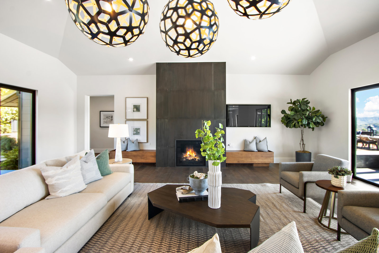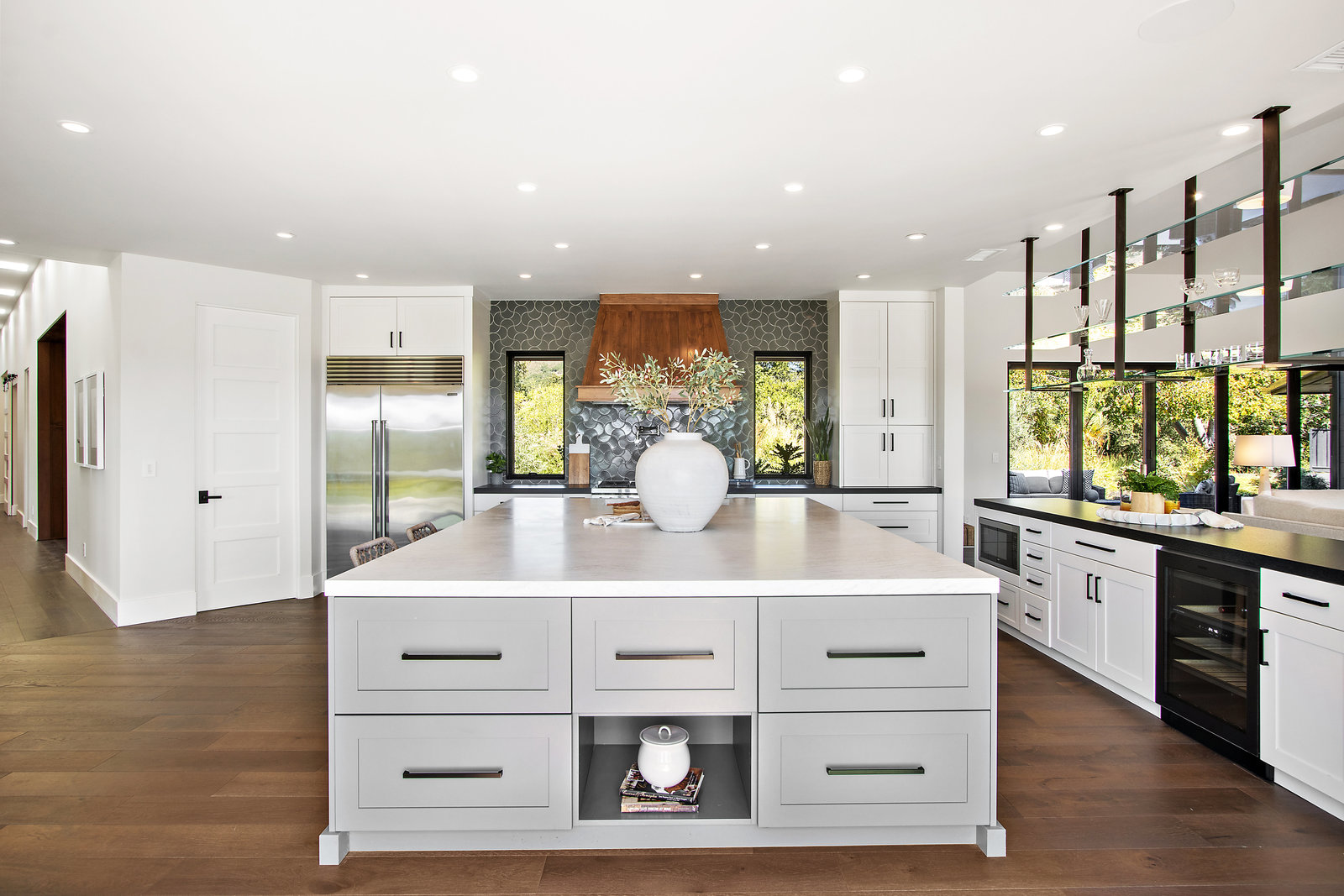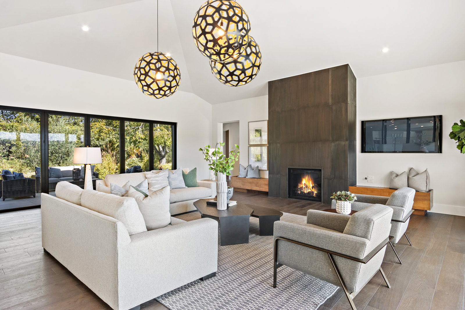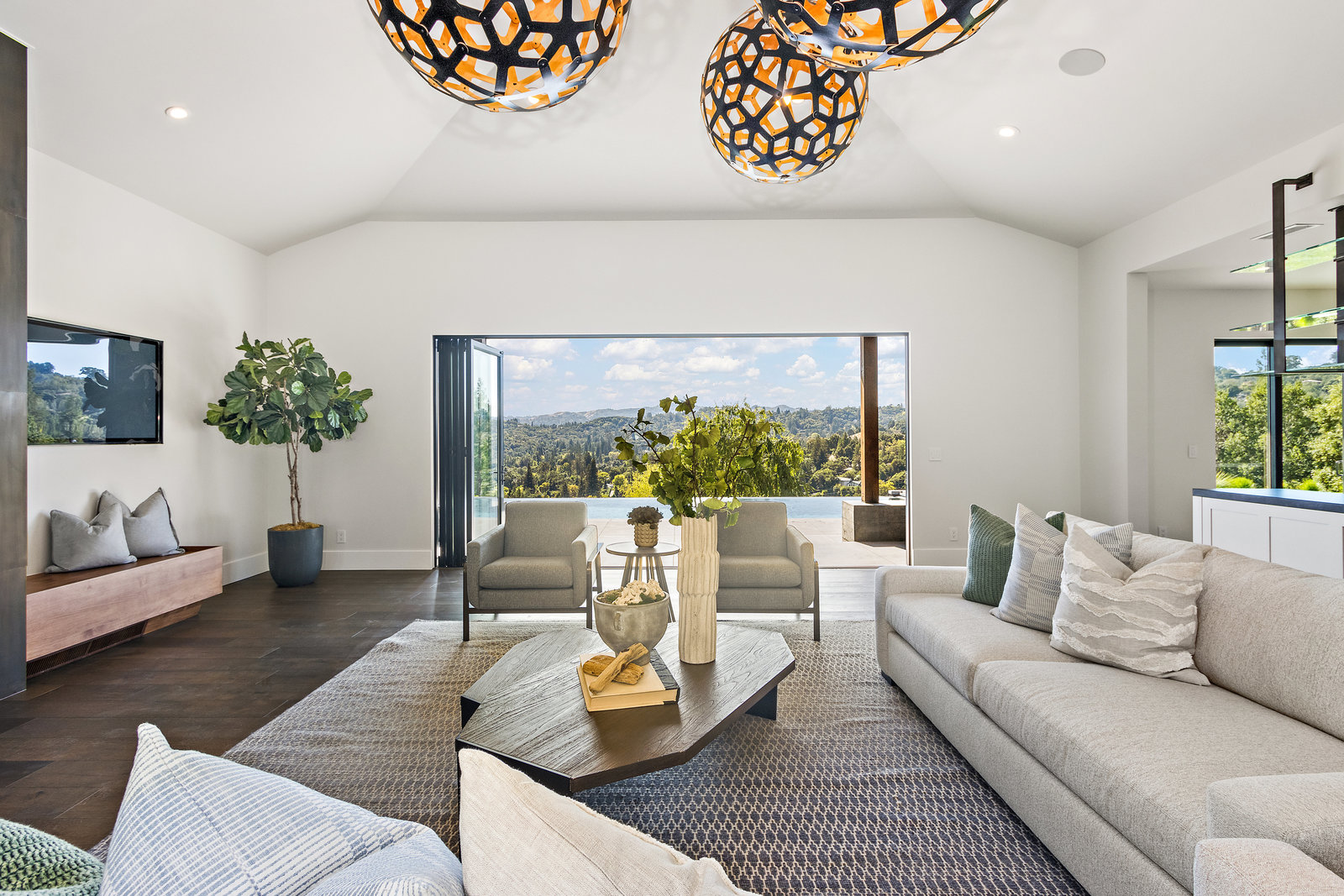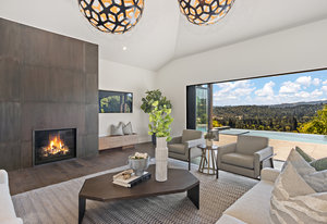 The spacious open floor plan is flooded with abundant natural light. Walls of glass highlight the captivating views from every living space and showcase the thoughtfully and professionally designed landscaping. Multiple outdoor seating areas are ideal for both relaxing and entertaining.