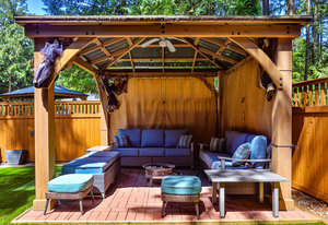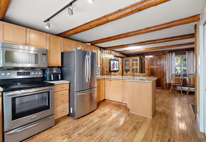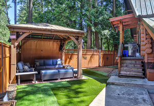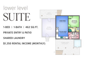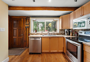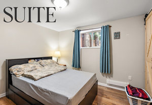 The suite has exceptional soundproofing, a private entrance, and a covered patio. It is an excellent mortgage helper - currently rented to great tenants for $1,350/mo. The kitchen features stainless steel appliances, solid maple cabinets, and a bar seating area. The living area has a cozy pellet stove for efficient heating and ambiance. Two bedrooms upstairs offer a functional layout, while the rear patio is a serene retreat with a covered gazebo & BBQ area for year-round enjoyment. Recent upgrades include newer windows, gutter guards, a metal roof, and a 50A generator outlet for backup power.
