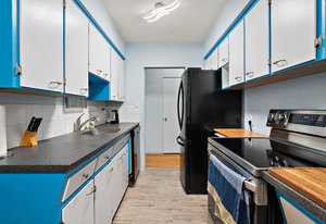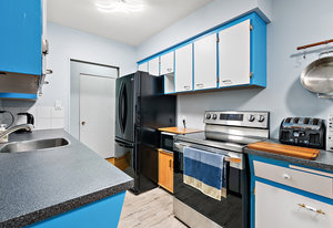 Welcome to Parkside Place. This charming top-floor, west-facing condo offers 2 bedrooms, 1 updated bathroom and a spacious living room for relaxing with hardwood floors. Recent updates include fresh paint throughout, new light fixtures, new flooring in the kitchen and bathroom, and vinyl windows with a new sliding patio door leading to a large balcony where you can BBQ. Treed outlook for privacy and located only steps away from your own parking spot. Enjoy the convenience of a full-sized laundry room and a large in-suite storage room.