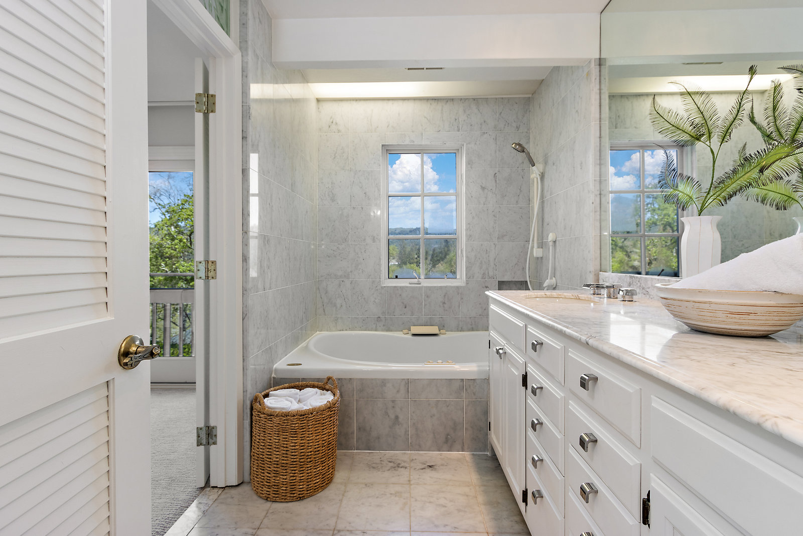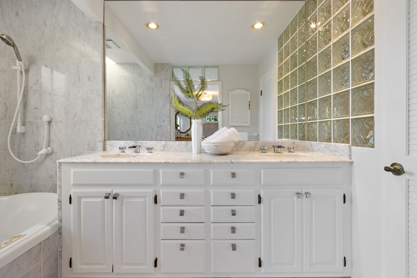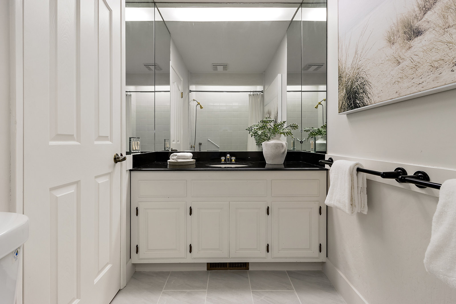 The bright kitchen has a skylight, granite countertops and backsplash, and plenty of storage, including upper and lower cabinets and a pantry. Adjacent to the kitchen is a spacious family room with a cozy double fireplace. Designed for indoor-outdoor living, the home features sliding doors that grant access to a wrap-around balcony, which connects to a large deck that provides an ideal setting for lounging and entertaining.