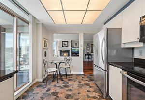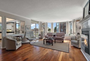 Enjoy hardwood floors, harbour views, and an open-plan living area. The residence features two large bedrooms, two bathrooms, and a versatile office/den that could serve as a third bedroom. A cozy gas fireplace adds warmth to the living room.