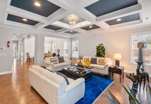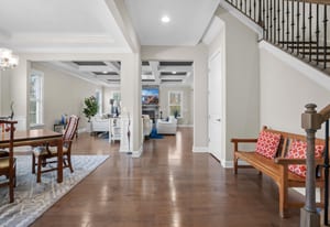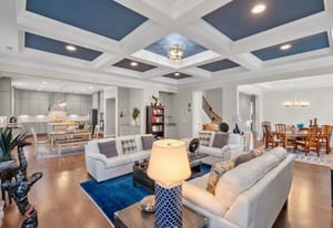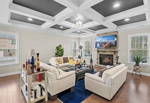 The kitchen flows seamlessly into a coffered-ceiling great room with a warm, inviting fireplace—perfect for everyday living and entertaining. With 5 bedrooms and 4.5 baths, this home offers exceptional flexibility and privacy. Four of the five bedrooms include their own attached ensuite bathrooms, creating comfortable retreats for family and guests.