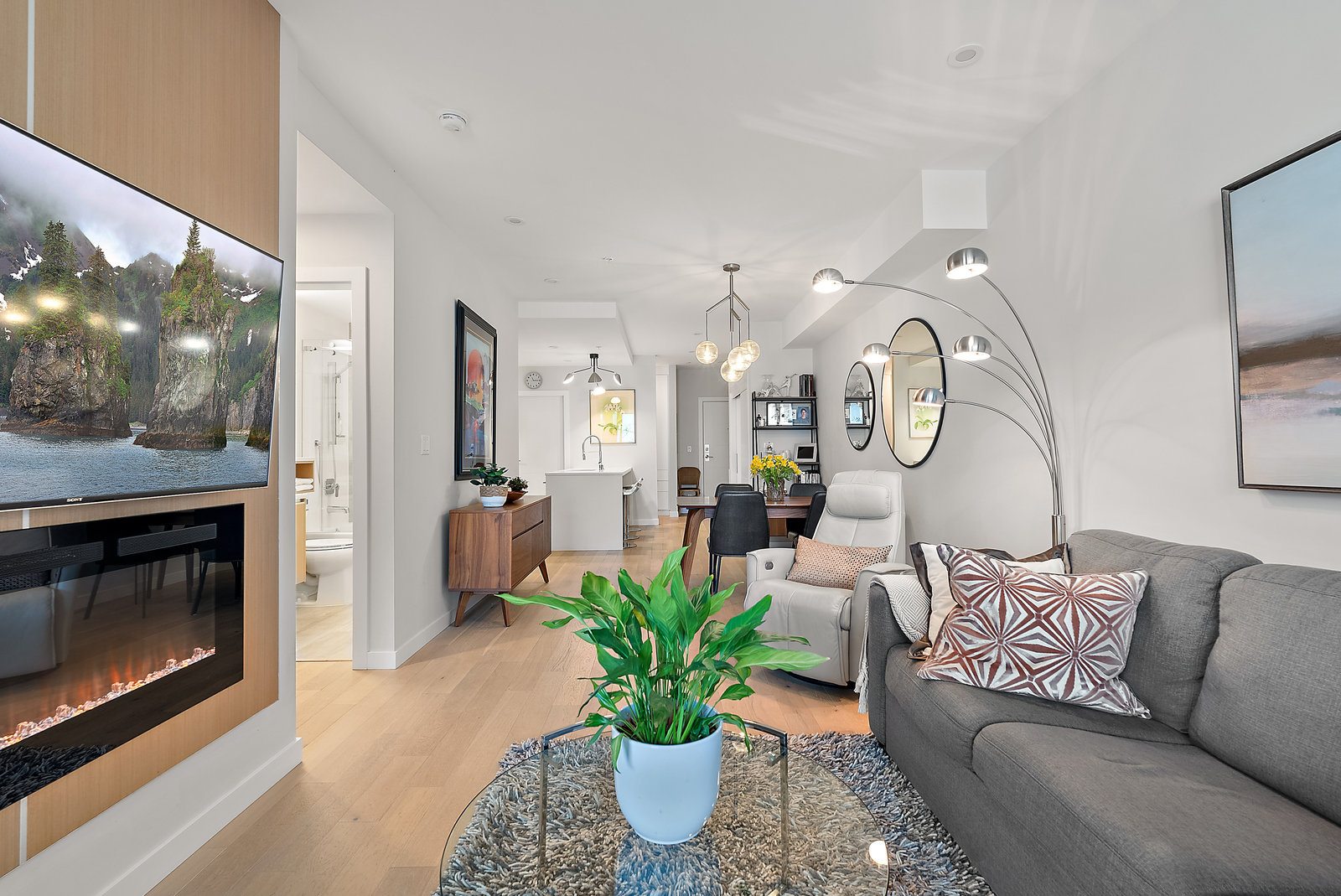 The stunning kitchen features ample counter space, premium appliances, and thoughtfully placed lighting. An electric fireplace adds warmth and ambiance, while a full-size washer and dryer provide everyday convenience. Thoughtfully added cabinetry and storage enhance style and functionality.