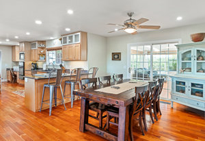 Wonderful Sonoma County country living is defined by homes like this. The tree-lined street reveals the spacious driveway and an incredible nearly ¾ acre lot. Recent landscaping provides a serene garden full of fruiting trees, blossoming flowers, raised garden beds, and a sweet pond with water feature. Pure comfort is found just inside with gorgeous flooring running throughout and the open living room, dining room, and kitchen area. Here you’ll enjoy the granite countertops, a wall oven, recessed lighting, gas fireplace, additional oven range, and bartop seating. A butler pantry with additional refrigerator, laundry area, and two-car garage complete this wing of the home. The living areas include two view-filled guest rooms, a full bath, and the primary suite with large closet, French doors to a backyard deck, and sliding barn door to the bathroom with walk-in shower. Two enclosed sunrooms provide perfect areas for a tranquil workout. Explore the expansive lot with decks, soothing swim-spa primed for relaxation and exercise, and animal enclosures for the budding farmer. Even better is the barn with finished flooring, updated lighting, bonus storage room, and convenient animal feed system. Everything enjoys a serene country setting, still conveniently close to town!