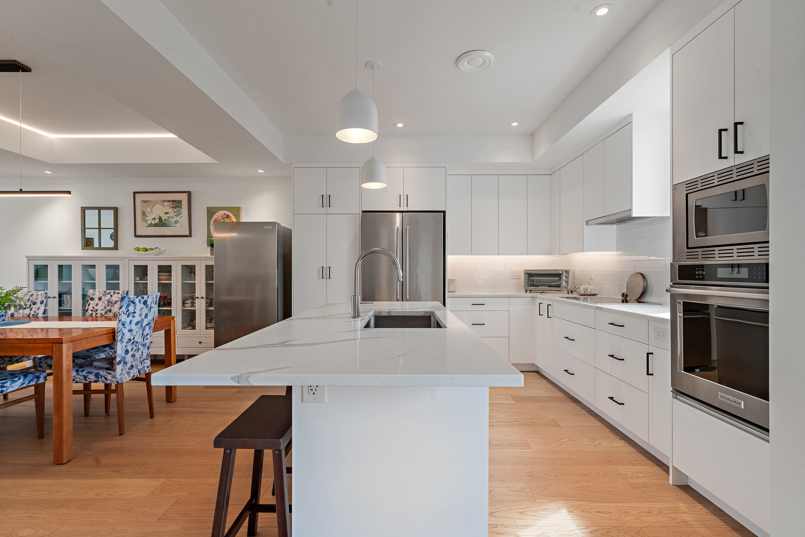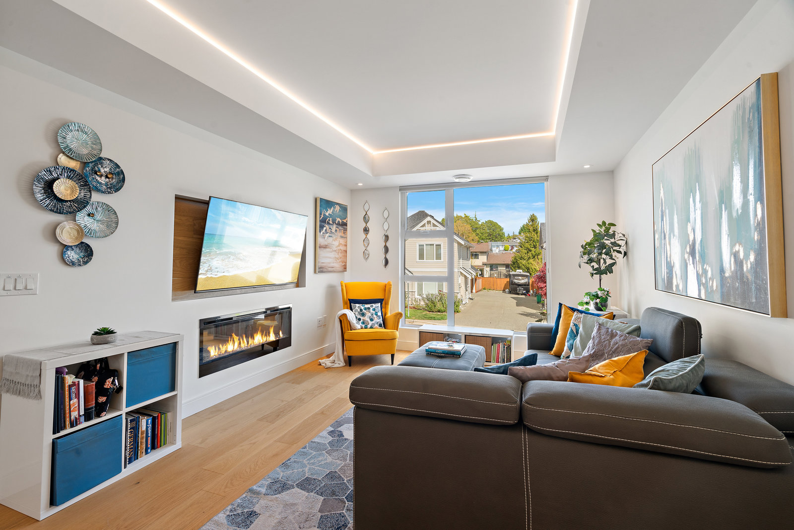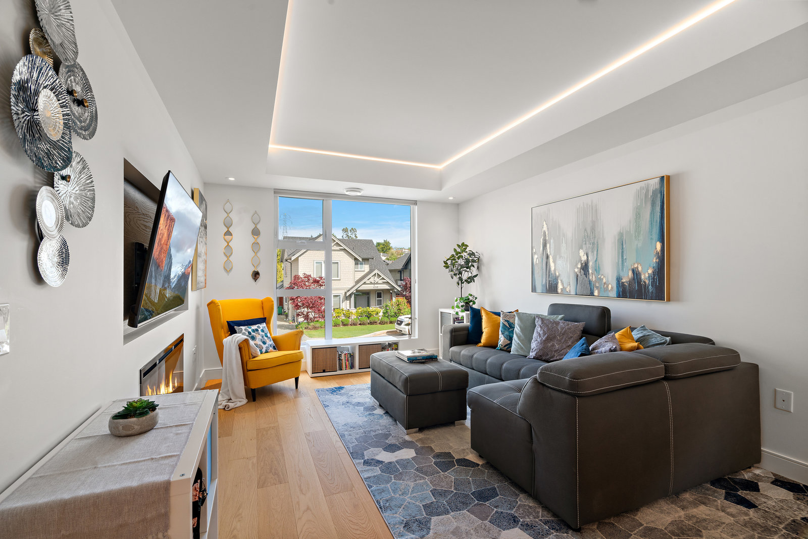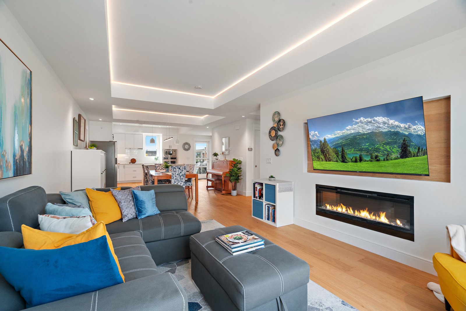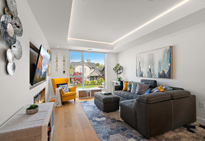 The open-concept main floor features engineered oak hardwood, elegant tray ceilings, and a gas fireplace with a sleek TV feature wall. The gourmet kitchen is a chef’s dream, boasting quartz countertops, premium KitchenAid appliances, an induction cooktop, wall oven, built-in microwave, and an island with ...