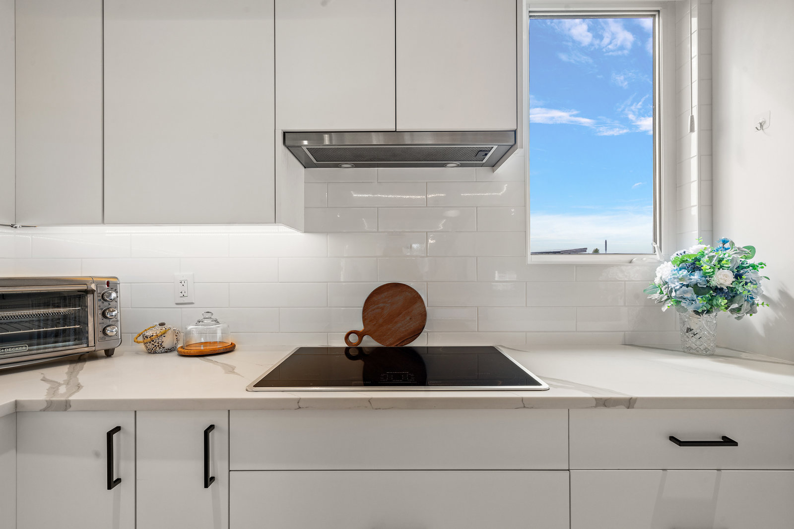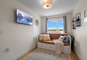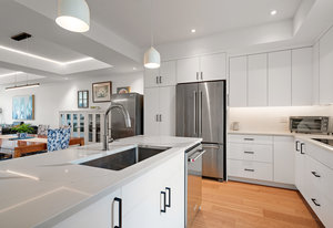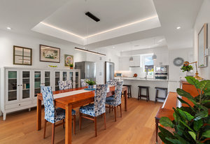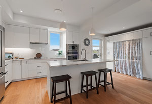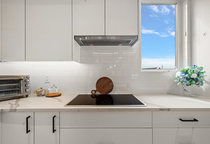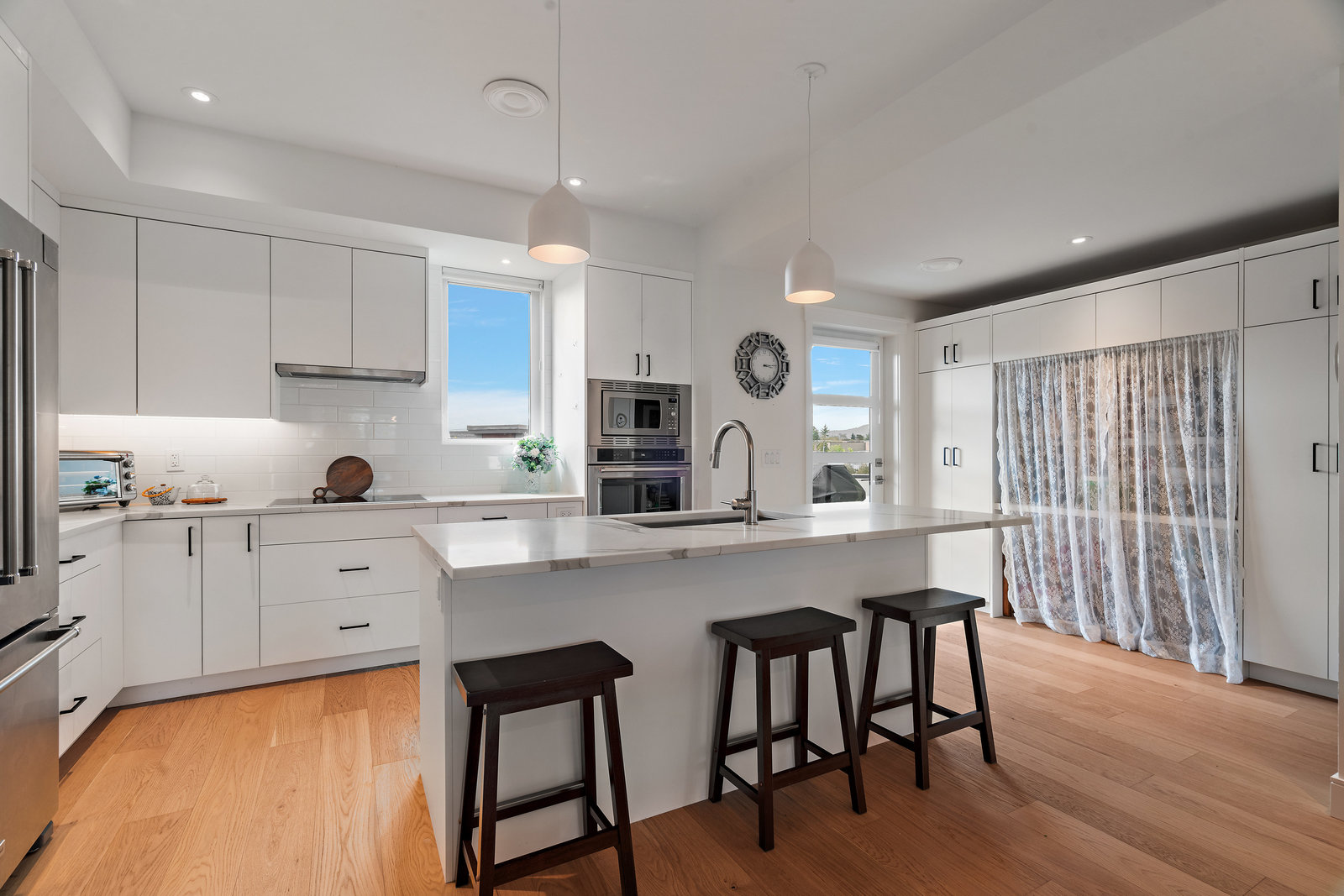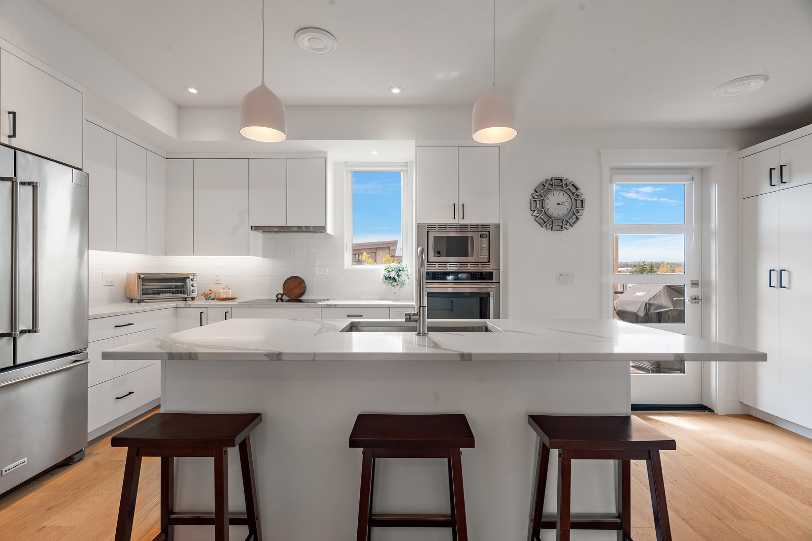 The open-concept main floor features engineered oak hardwood, elegant tray ceilings, and a gas fireplace with a sleek TV feature wall. The gourmet kitchen is a chef’s dream, boasting quartz countertops, premium KitchenAid appliances, an induction cooktop, wall oven, built-in microwave, and an island with ...