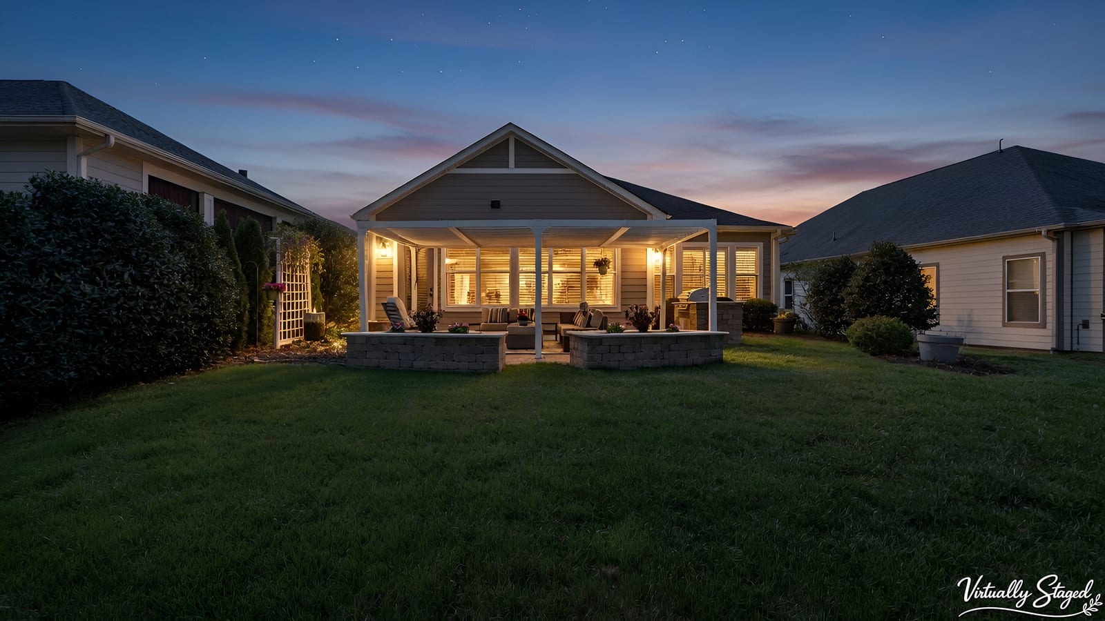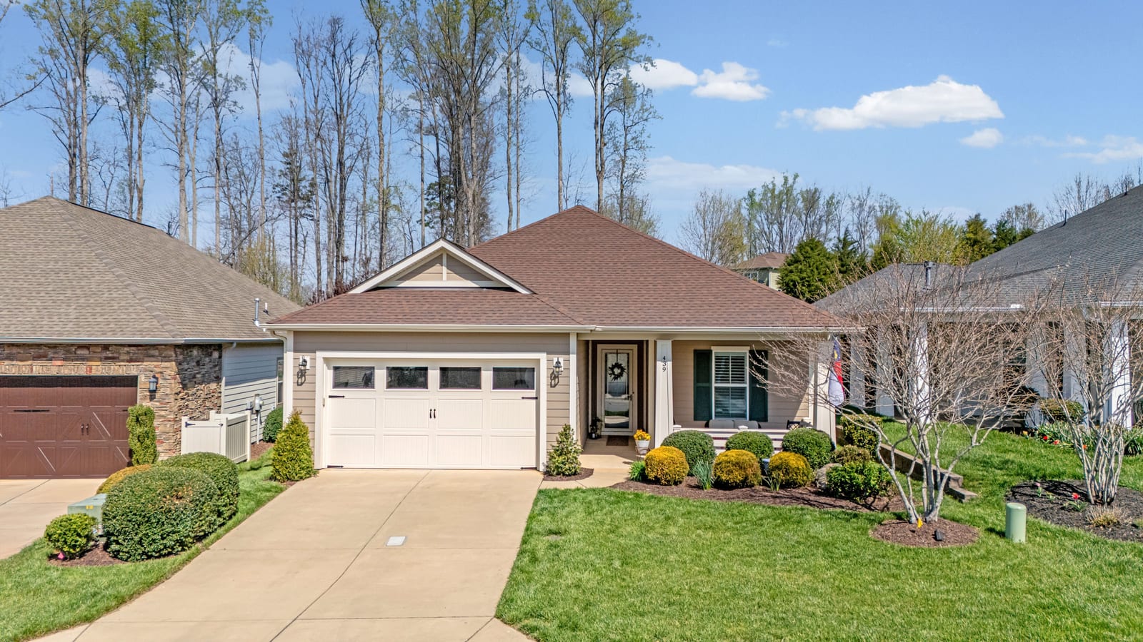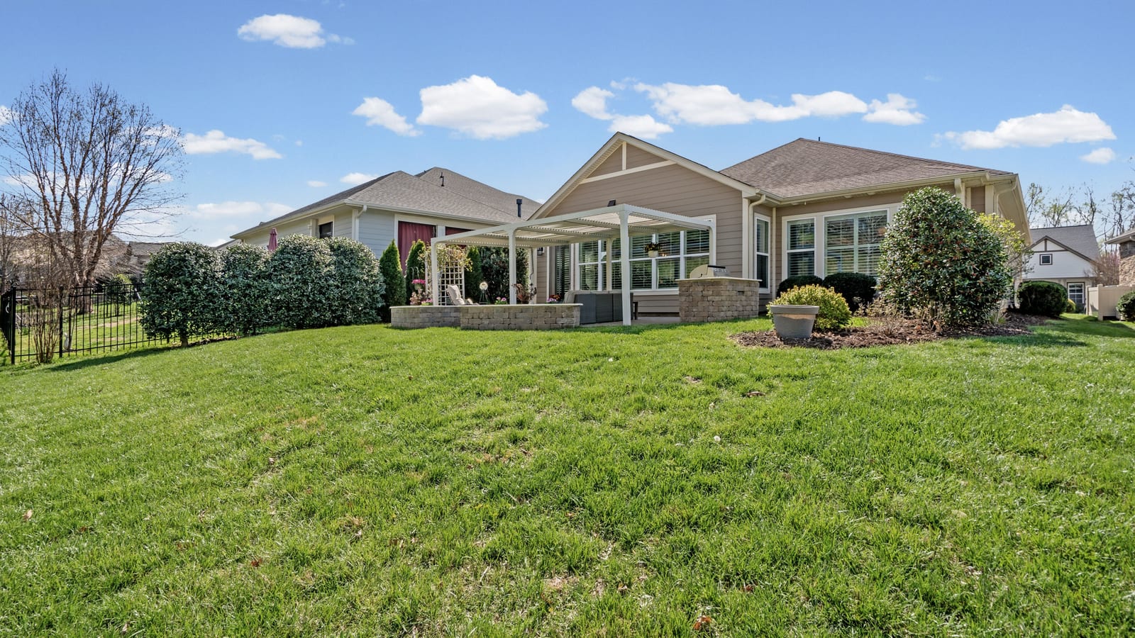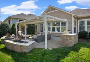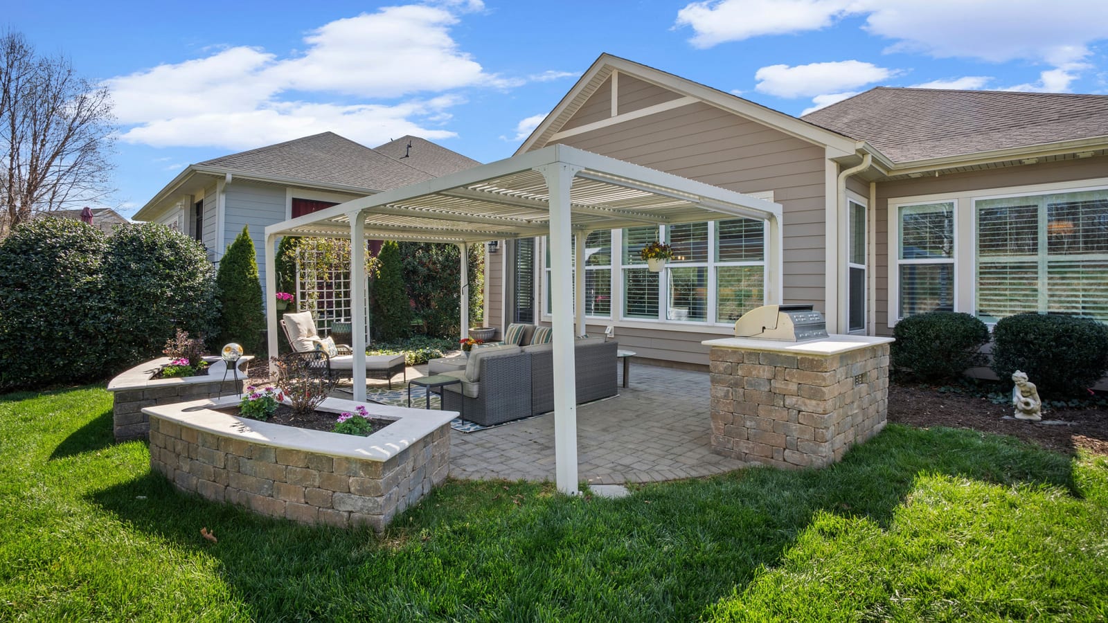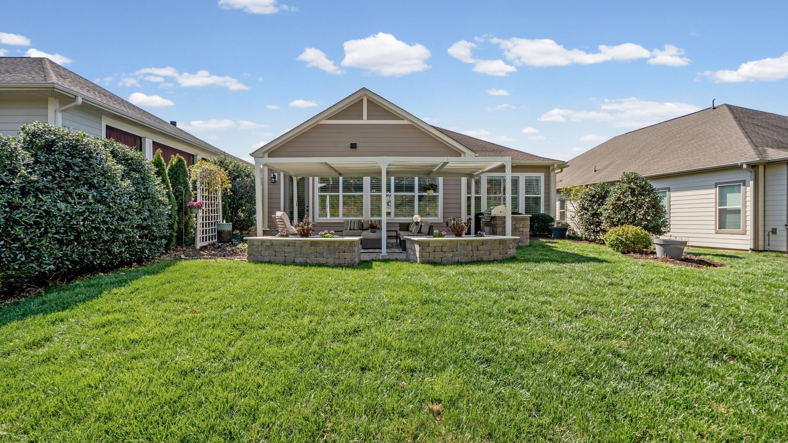 Out of a magazine this completely turn key craftsman style bungalow with sunroom is waiting for you. This home features an amazing outdoor entertaining area with built in grill station, water feature, raised planter beds for the gardening enthusiast with seating wall and patio with covered louvered pergola extending in and outdoor entertaining areas in a peaceful, quiet, natural setting. Custom wall treatments and drapery, plantation shutters, low maintenance LVP flooring and wood beams highlight the main living areas. Upgrades include: 10ft. ceilings, 8'doors, under/over cabinet kitchen lighting, tile back splash, solid surface counters, roll out drawers for easy access, large island with additional storage and decorator lighting. Primary suite features bump out bay window and a built in window seat for storage, ensuite bath with dual sink vanity, walk in closet and shower. Private split bedroom layout offers convenient drop zone storage and adjoining bath. Laundry room has additional upper and lower cabinetry with amazing counter work space. Finished garage with 4' extension. Great location on a cul de sac street with easy access to the community trails and the Twin Mills Club. Trilogy Membership includes Freedom Boat Club on Lake Norman plus award winning amenities.