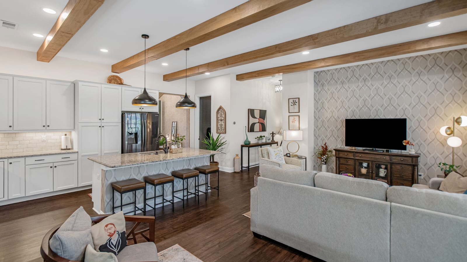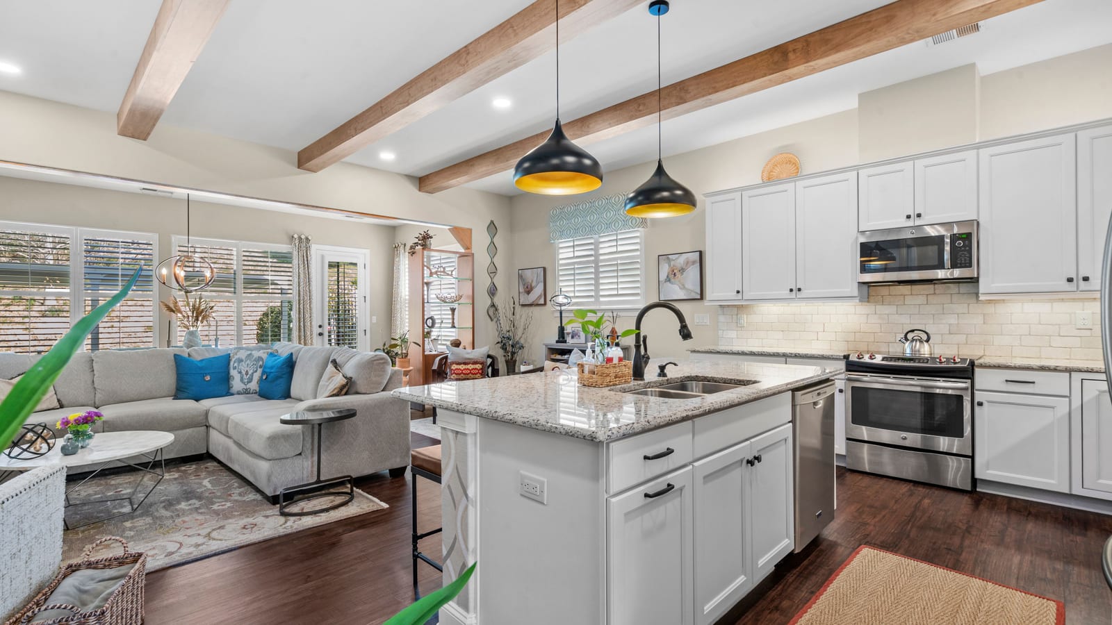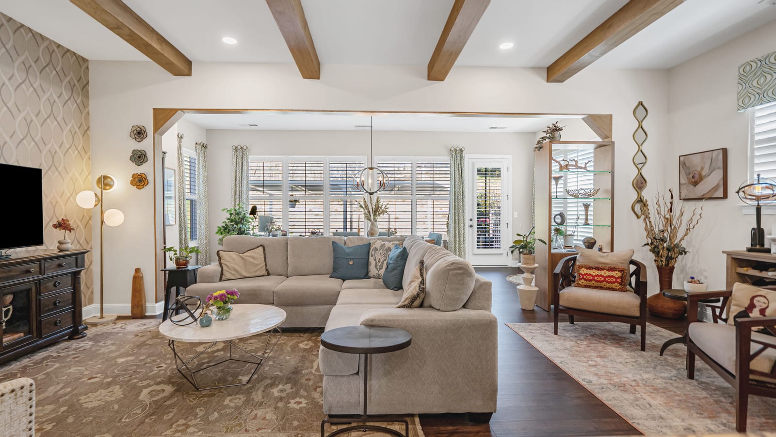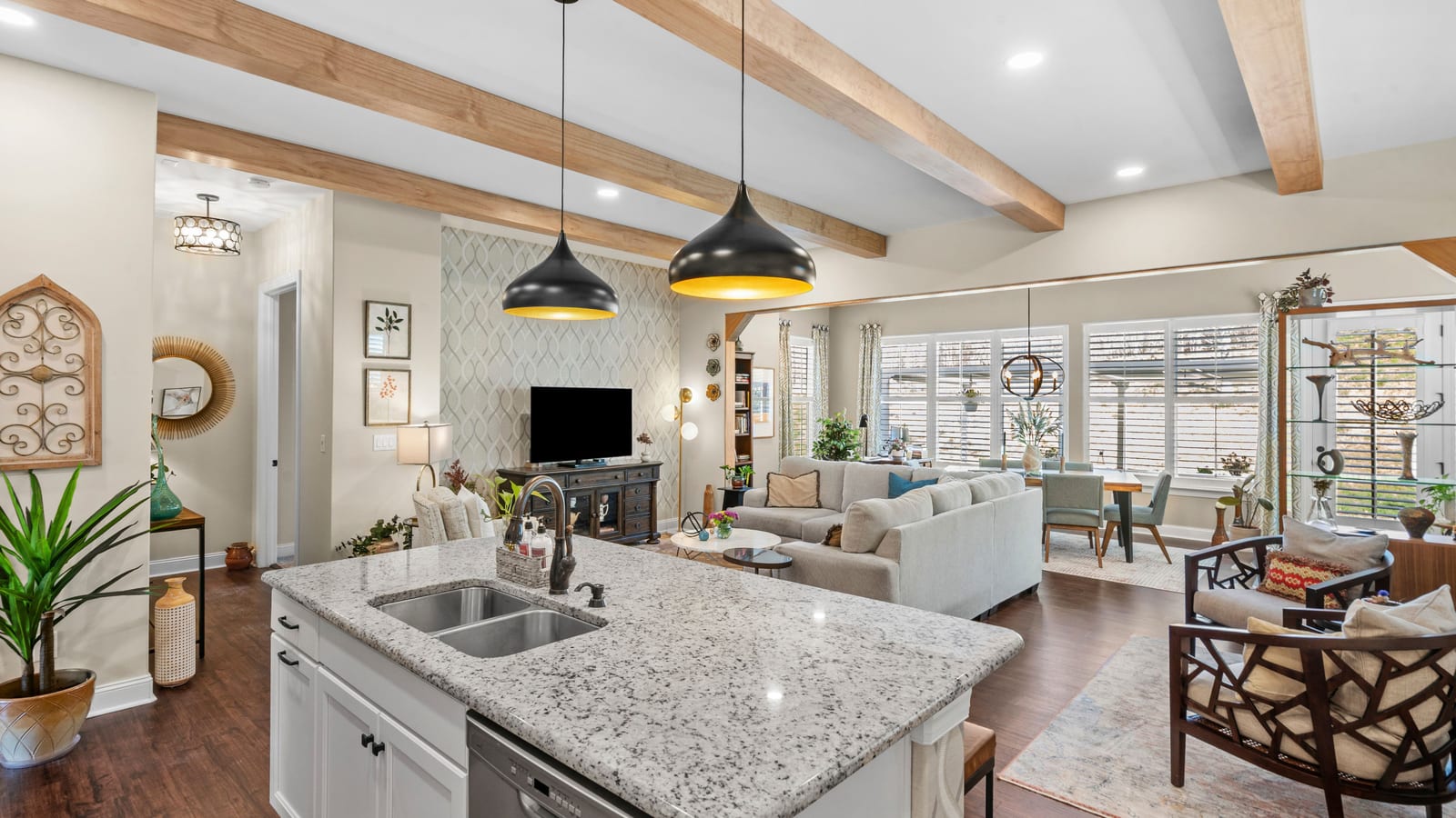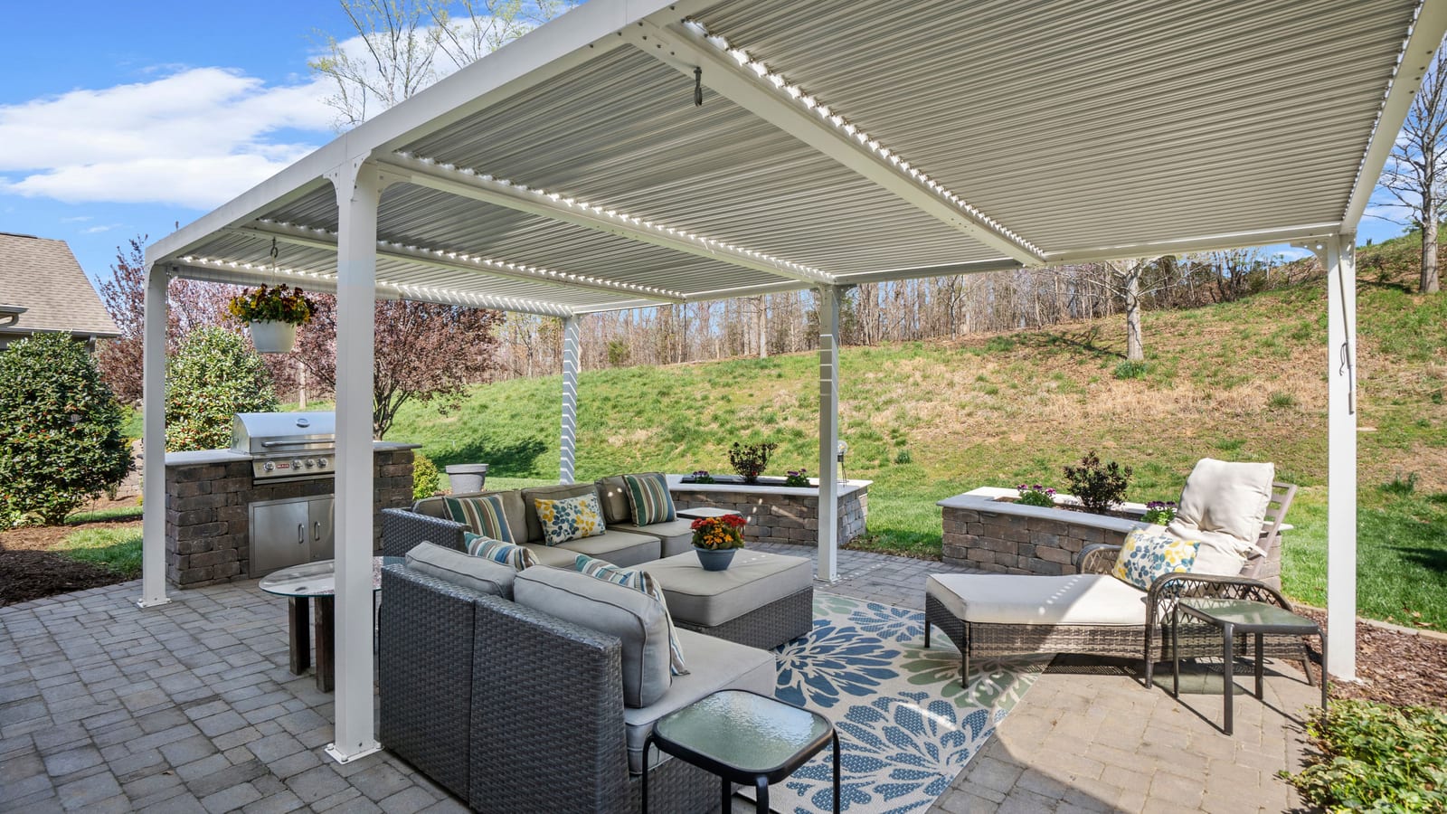 Out of a magazine this completely turn key craftsman style bungalow with sunroom is waiting for you. This home features an amazing outdoor entertaining area with built in grill station, water feature, raised planter beds for the gardening enthusiast with seating wall and patio with covered louvered pergola extending in and outdoor entertaining areas in a peaceful, quiet, natural setting. Custom wall treatments and drapery, plantation shutters, low maintenance LVP flooring and wood beams highlight the main living areas. Upgrades include: 10ft. ceilings, 8'doors, under/over cabinet kitchen lighting, tile back splash, solid surface counters, roll out drawers for easy access, large island with additional storage and decorator lighting. Primary suite features bump out bay window and a built in window seat for storage, ensuite bath with dual sink vanity, walk in closet and shower. Private split bedroom layout offers convenient drop zone storage and adjoining bath. Laundry room has additional upper and lower cabinetry with amazing counter work space. Finished garage with 4' extension. Great location on a cul de sac street with easy access to the community trails and the Twin Mills Club. Trilogy Membership includes Freedom Boat Club on Lake Norman plus award winning amenities.