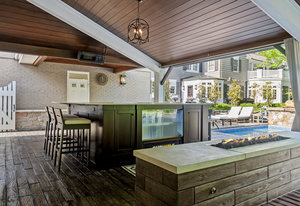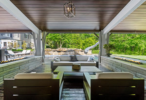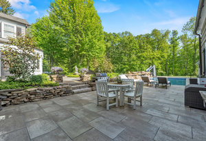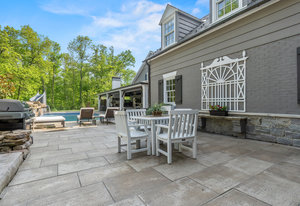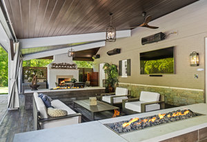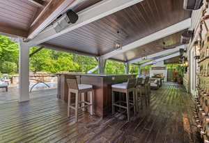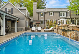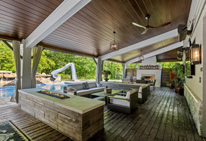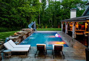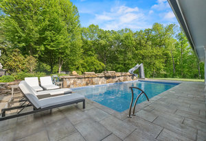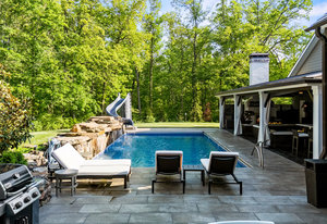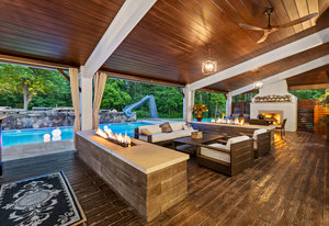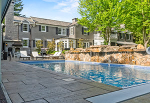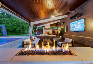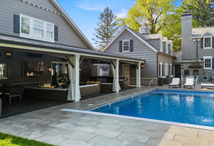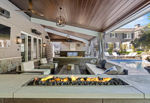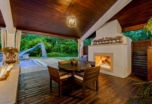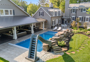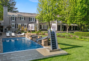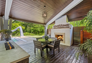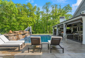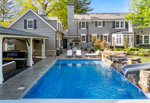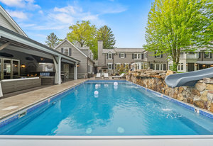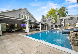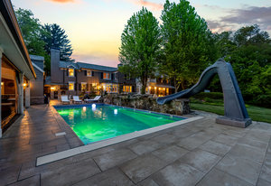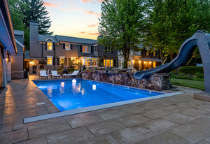 Outdoors, you’ll experience a luxury retreat oasis. The heated pool features a slide and a stone waterfall. The fully appointed pool house features a built-in bar, fireplace, full kitchen, luxury bathroom, and climate-controlled living space, making it perfect for entertaining year-round.