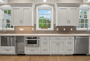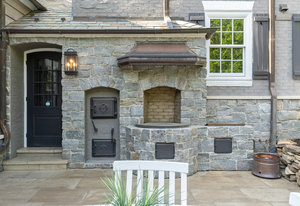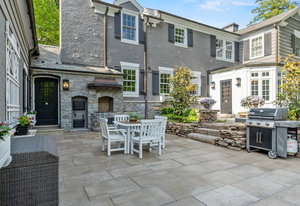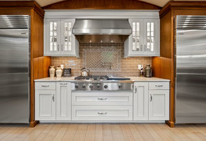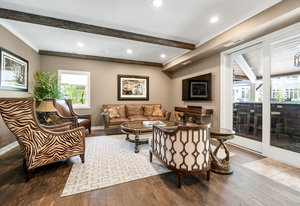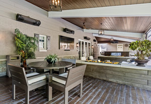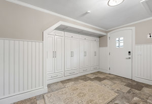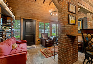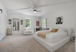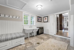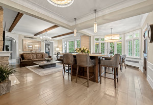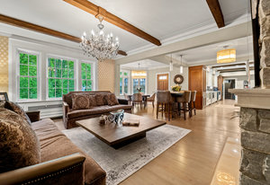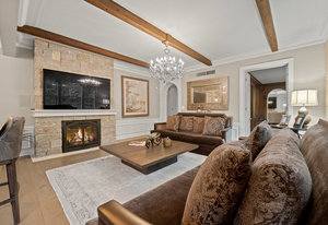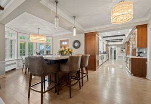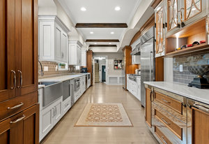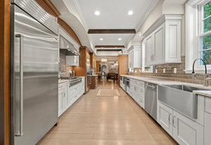 At the heart of the home, the chef’s kitchen blends form and function. Highlights include quartzite countertops, custom Dutch-made cabinetry, Fisher & Paykel appliances, dual Sub-Zero refrigeration, a Sub-Zero ice machine, and a spacious butler’s pantry for effortless organization. New exposed beams add rustic character to the open-concept design.