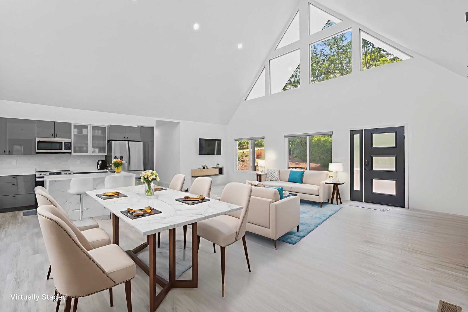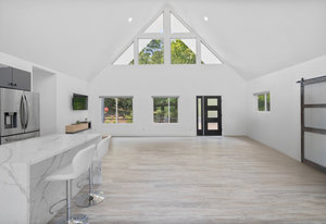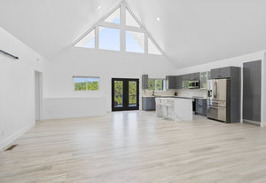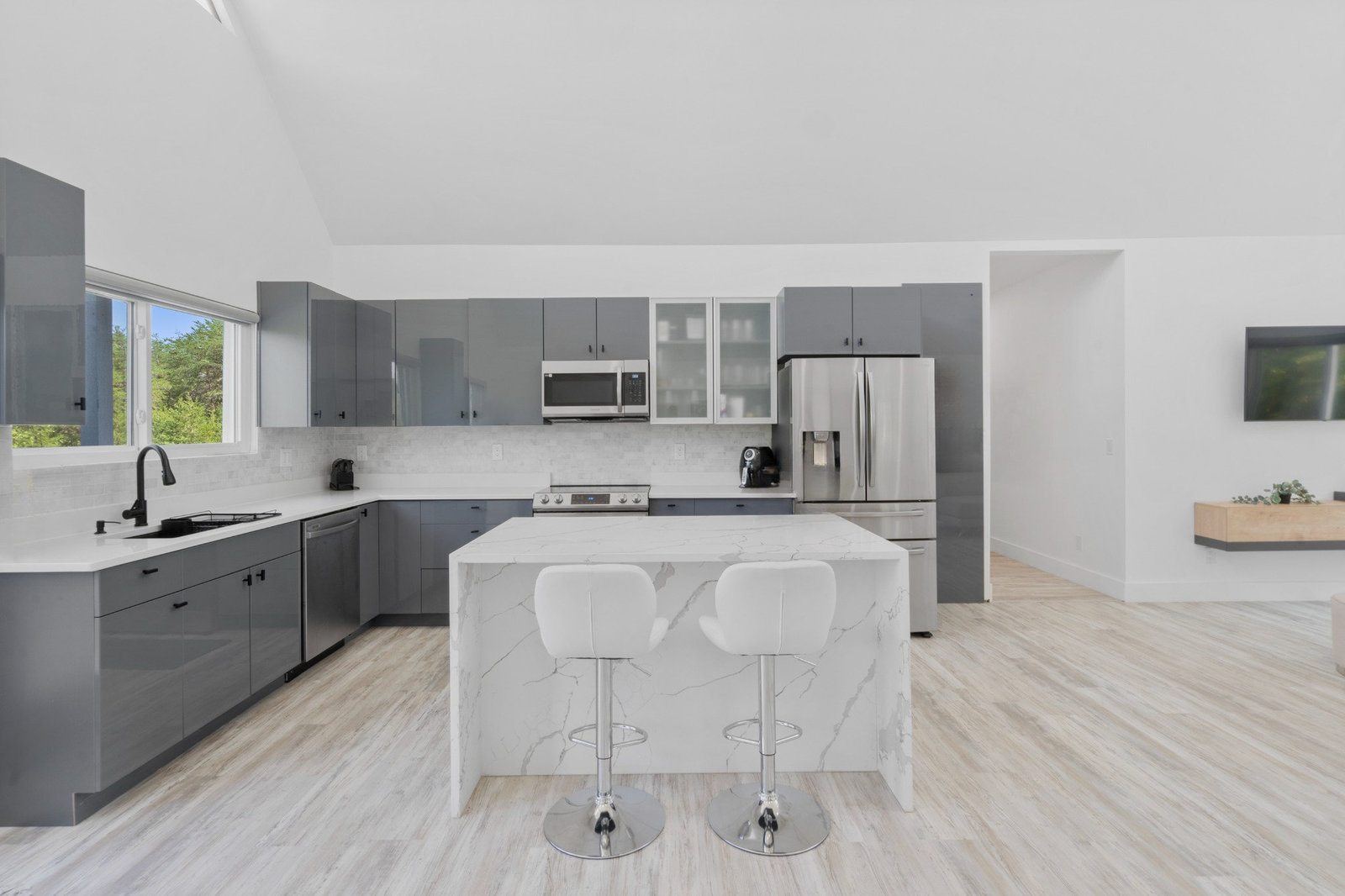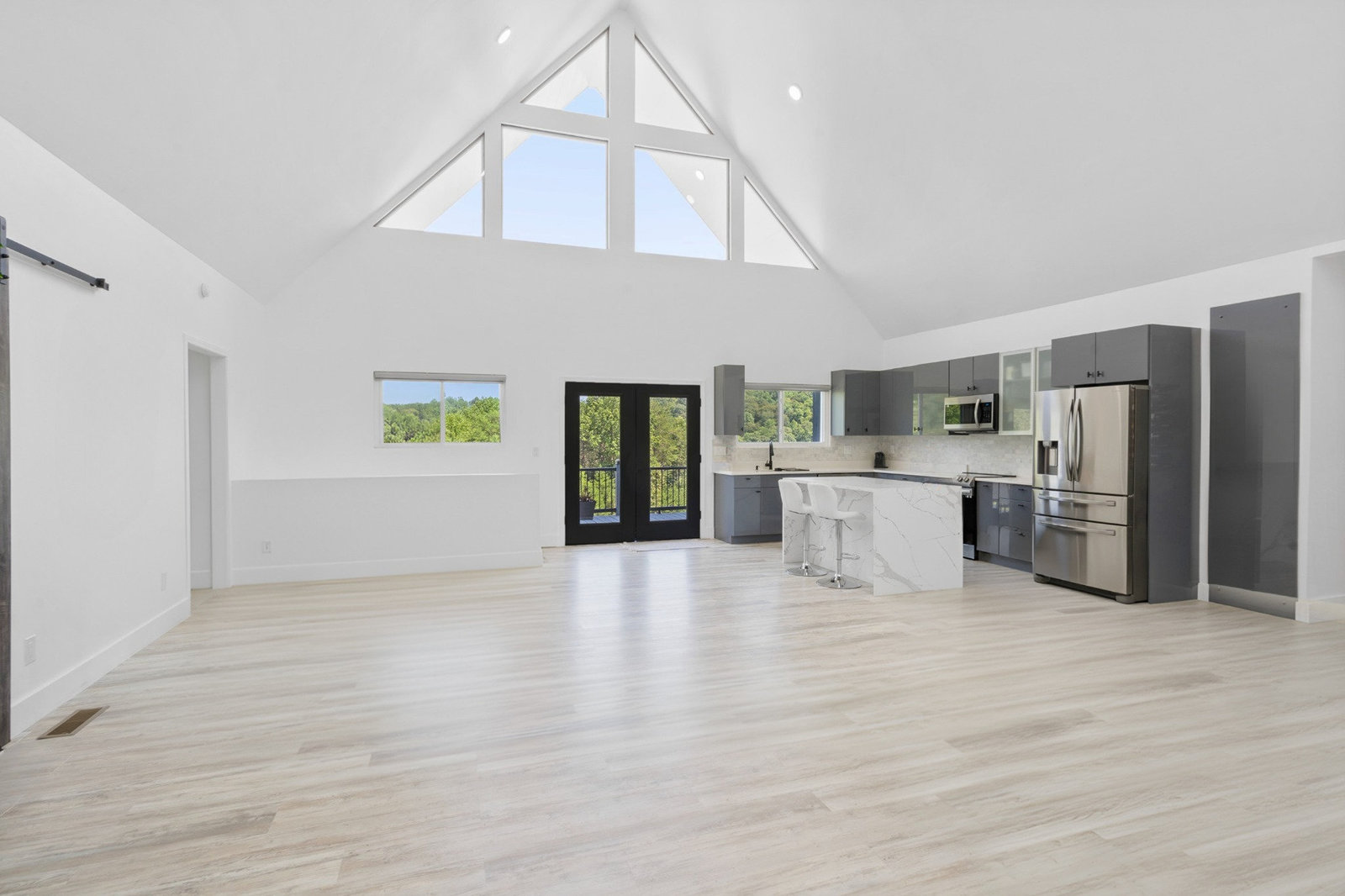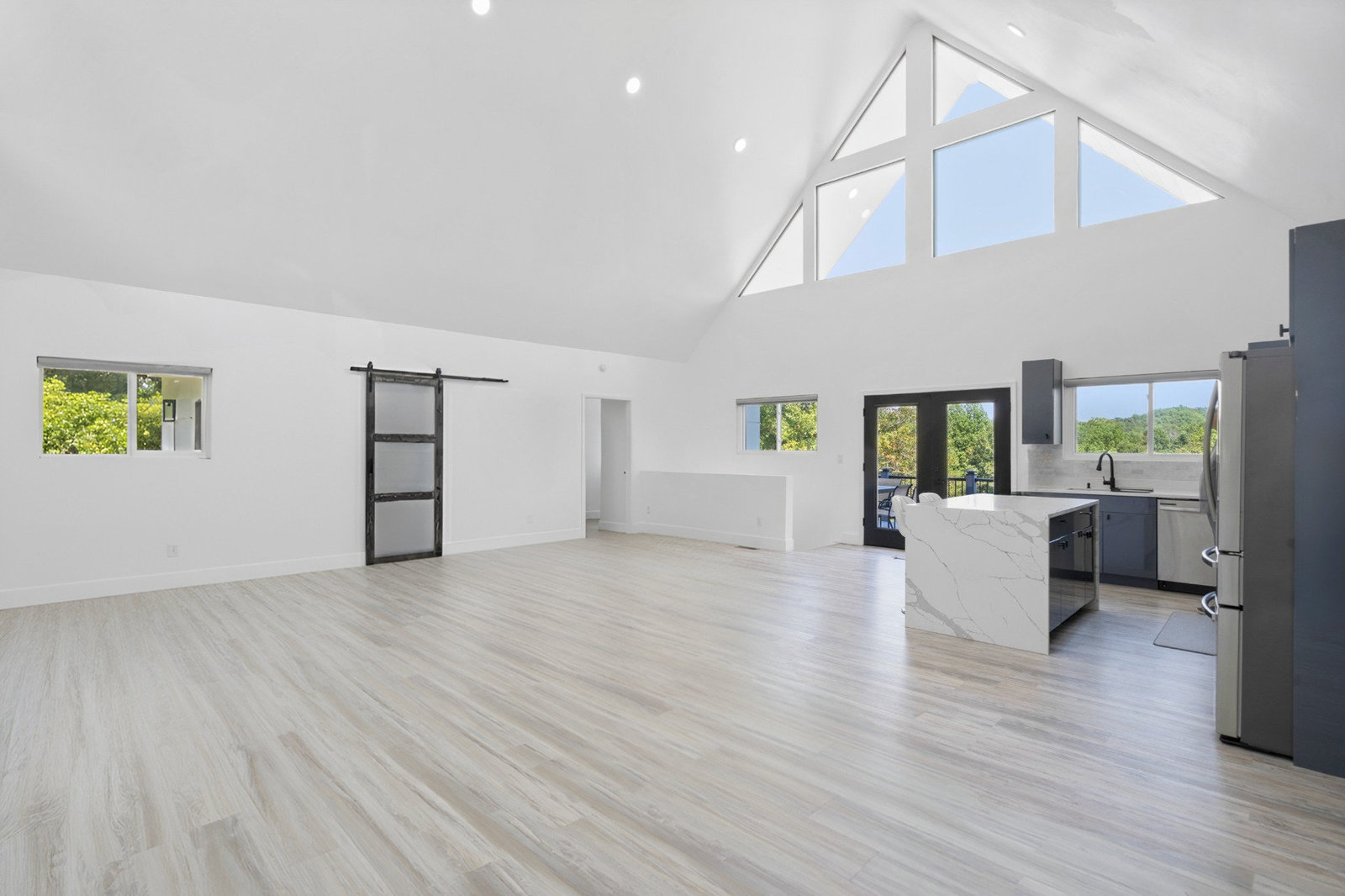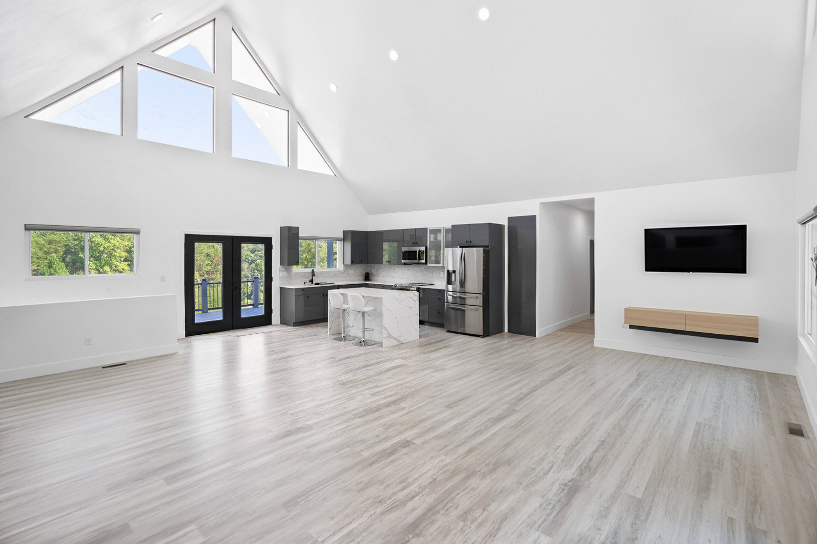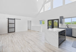 Inside, discover an airy, light-filled plan framed by dramatic triangular windows, a chef-inspired kitchen with solid quartz countertops and a massive extra-wide island—ideal for entertaining friends, family, or weekend guests in town for equestrian events. The spa-quality primary suite features an open-access tiled shower, sleek fixtures, and elegant finishes with defog mirrors for a touch of everyday indulgence.