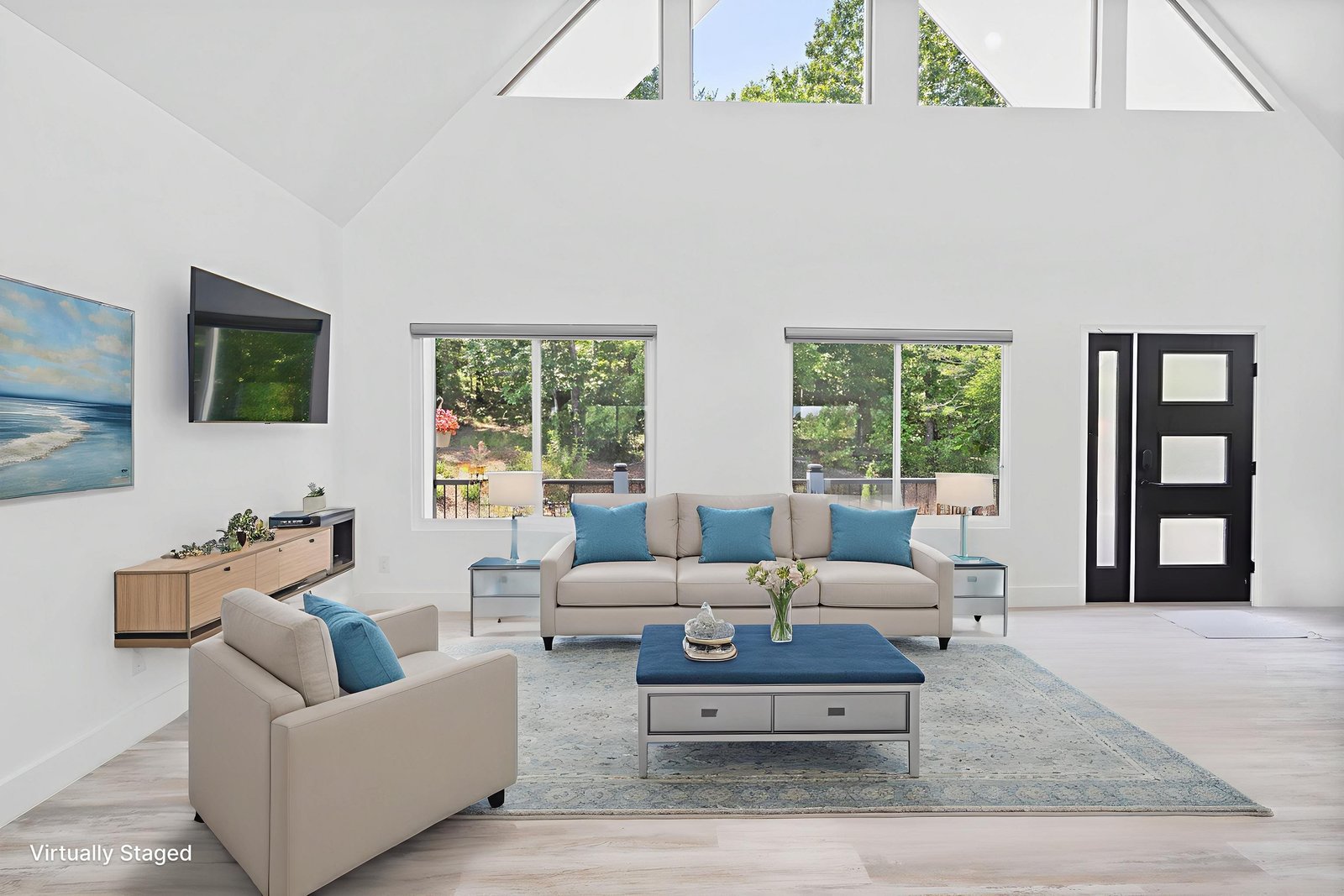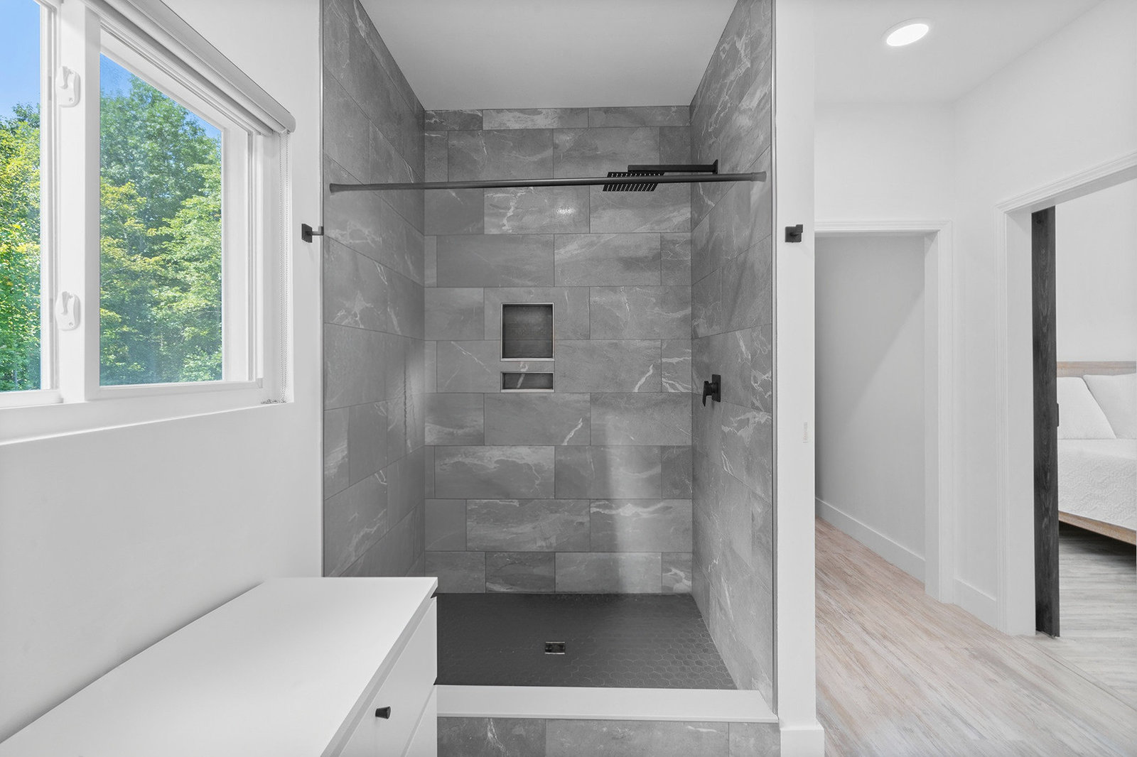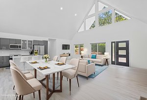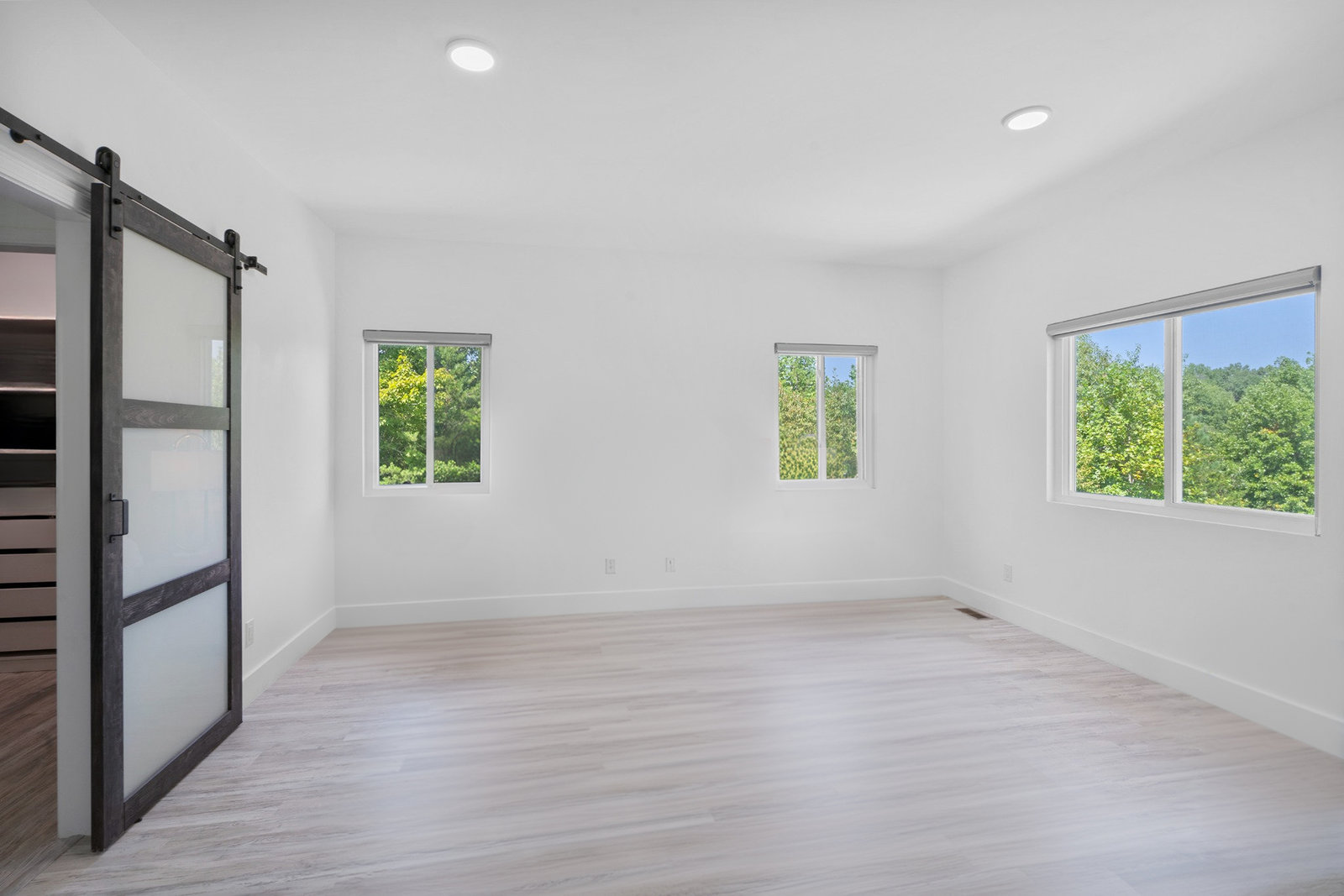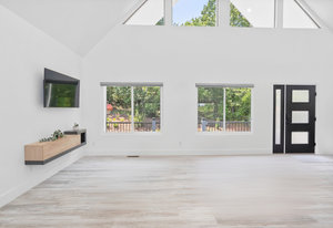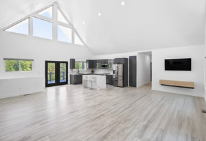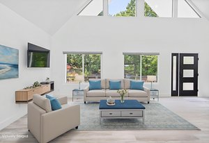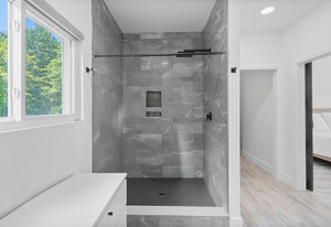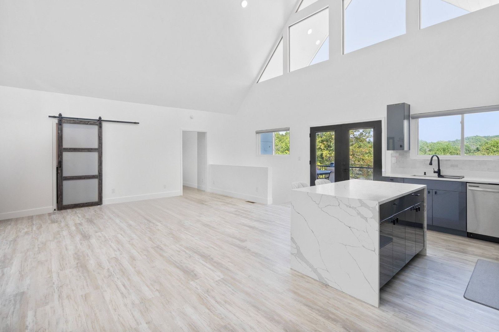 Inside, discover an airy, light-filled plan framed by dramatic triangular windows, a chef-inspired kitchen with solid quartz countertops and a massive extra-wide island—ideal for entertaining friends, family, or weekend guests in town for equestrian events. The spa-quality primary suite features an open-access tiled shower, sleek fixtures, and elegant finishes with defog mirrors for a touch of everyday indulgence.