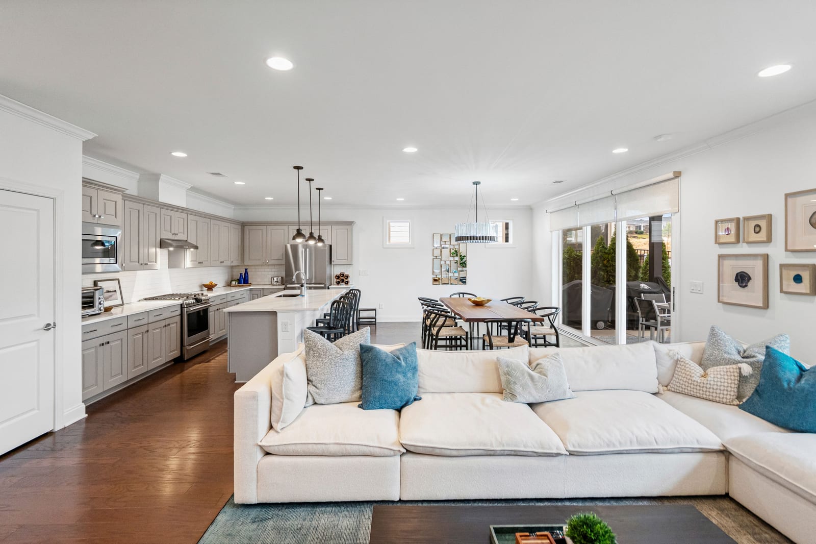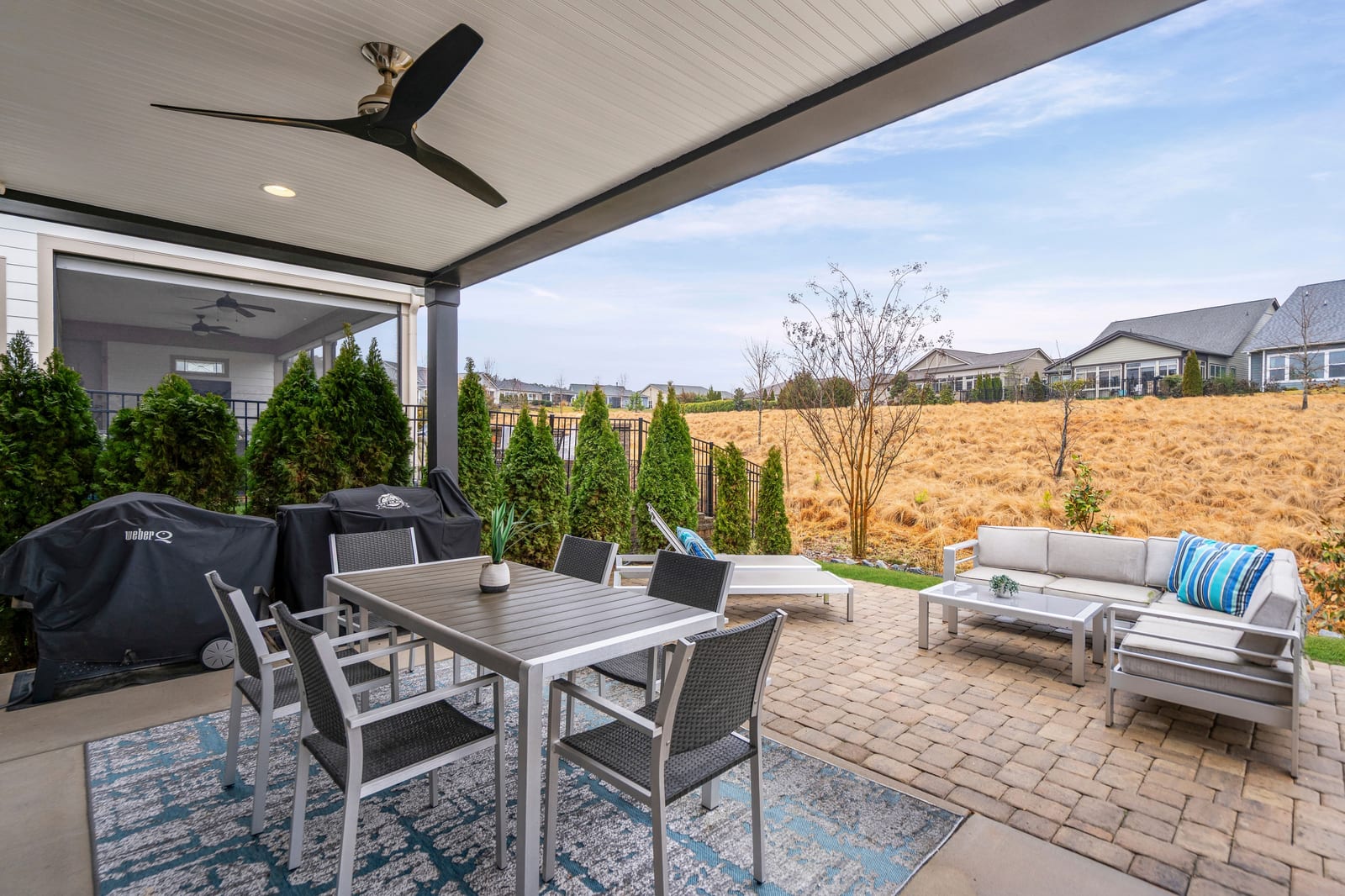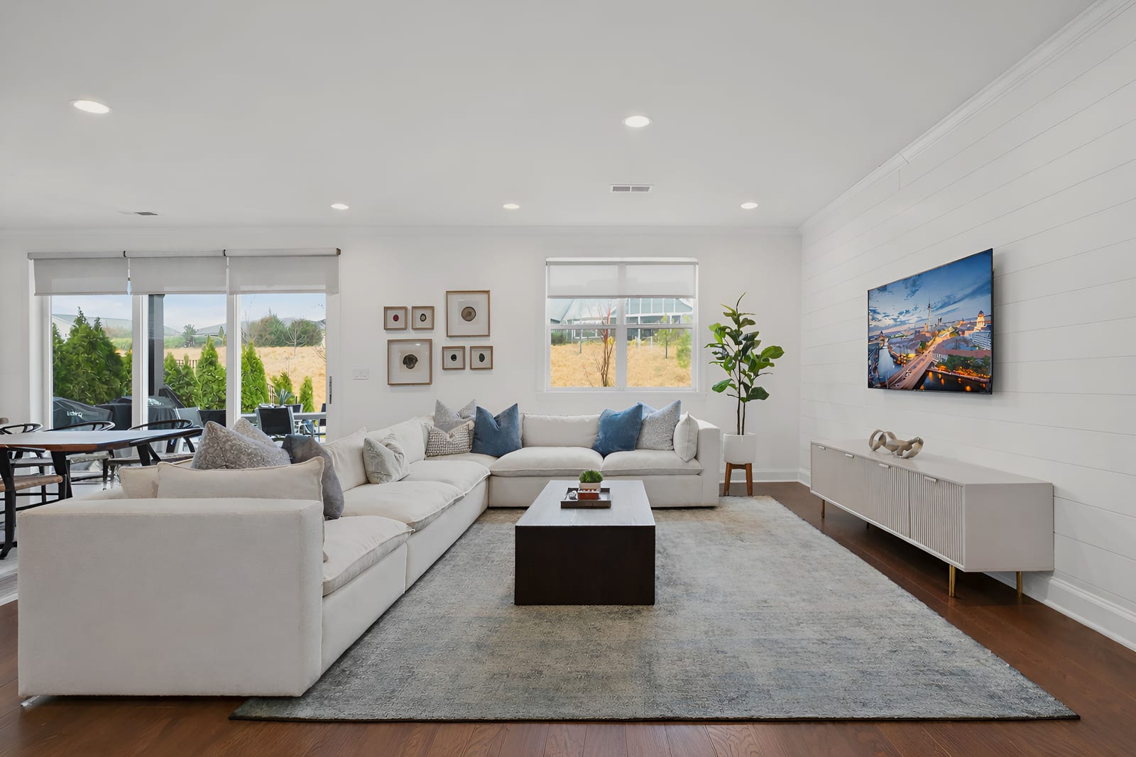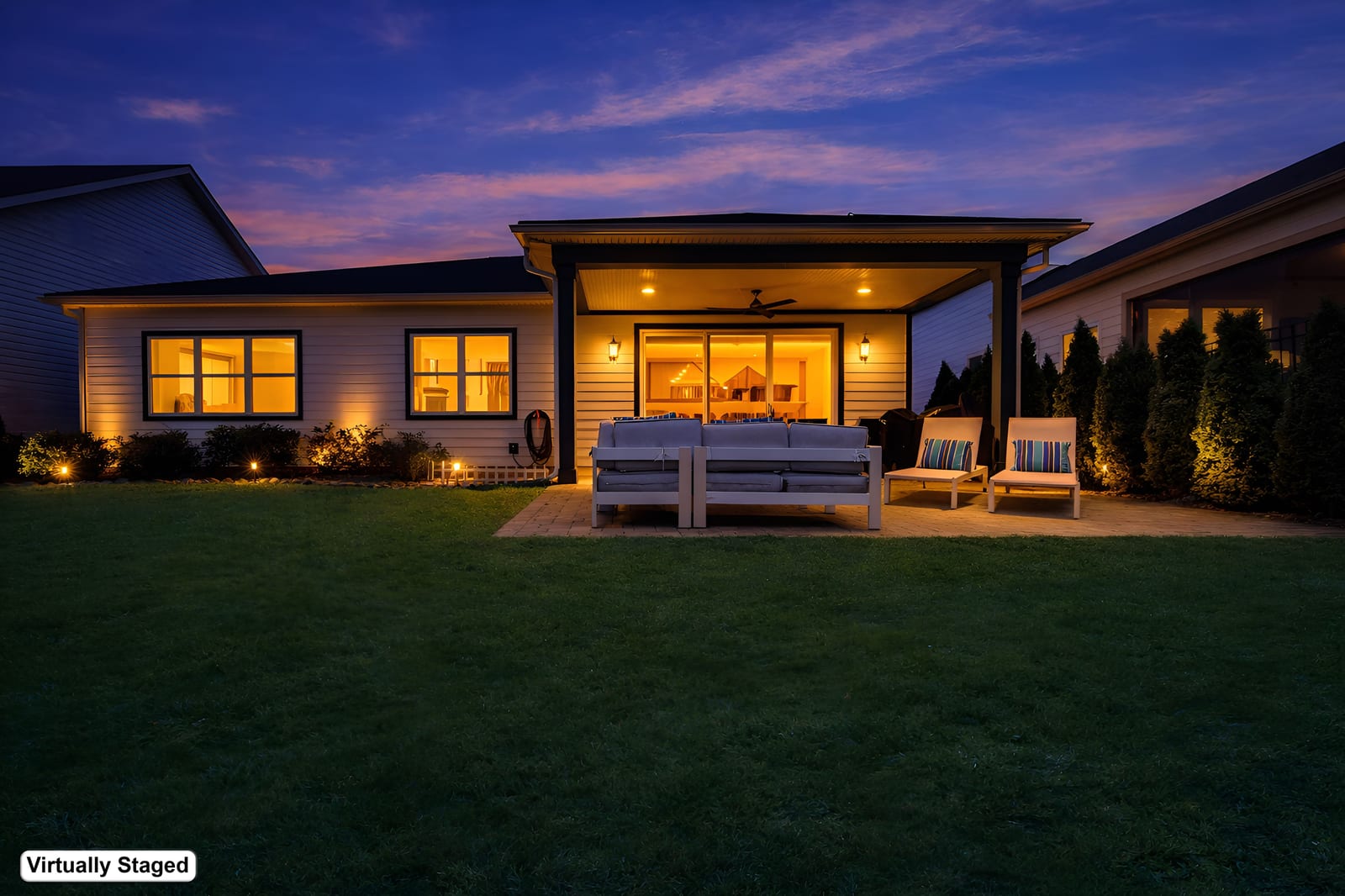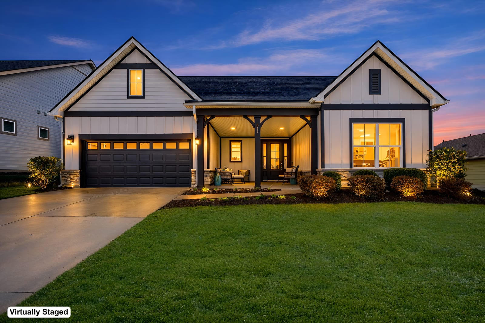 Enjoy wonderful sunset greenway views in this truly custom Liberty plan that has been thoughtfully designed with a meticulous attention to detail, barely lived in, and offers many different living configurations. Entry foyer with ship-lap accent walls leads you into this open-concept residence that has an amazing use of function & space plus decorator colors, lighting & finishes. A well appointed kitchen anchors the main living area & includes SS GE Cafe appliances, solid surface countertops, tile backsplash, Bosch refrigerator & cabinets w/soft close drawers. Dining area w/wall of glass opens and flows seamlessly to the covered Lanai & extended paver patio with privacy landscaping expanding in and outdoor entertaining areas. Great room offers electric shades for added privacy. Office/flex space features glass doors creating a serene setting. A substantial primary suite completes this home w/dual sink vanity, tile floors and shower plus a generous custom walk-in closet. Low maintenance wood & tile floors throughout. Additional bedroom with ensuite bath and walk in closet. Third bedroom with adjacent bath and central laundry room includes washing machine and dryer. Water filtration system. Oversized 2 car garage with golf cart storage. Trilogy Membership includes Freedom Boat Club on Lake Norman plus award winning amenities