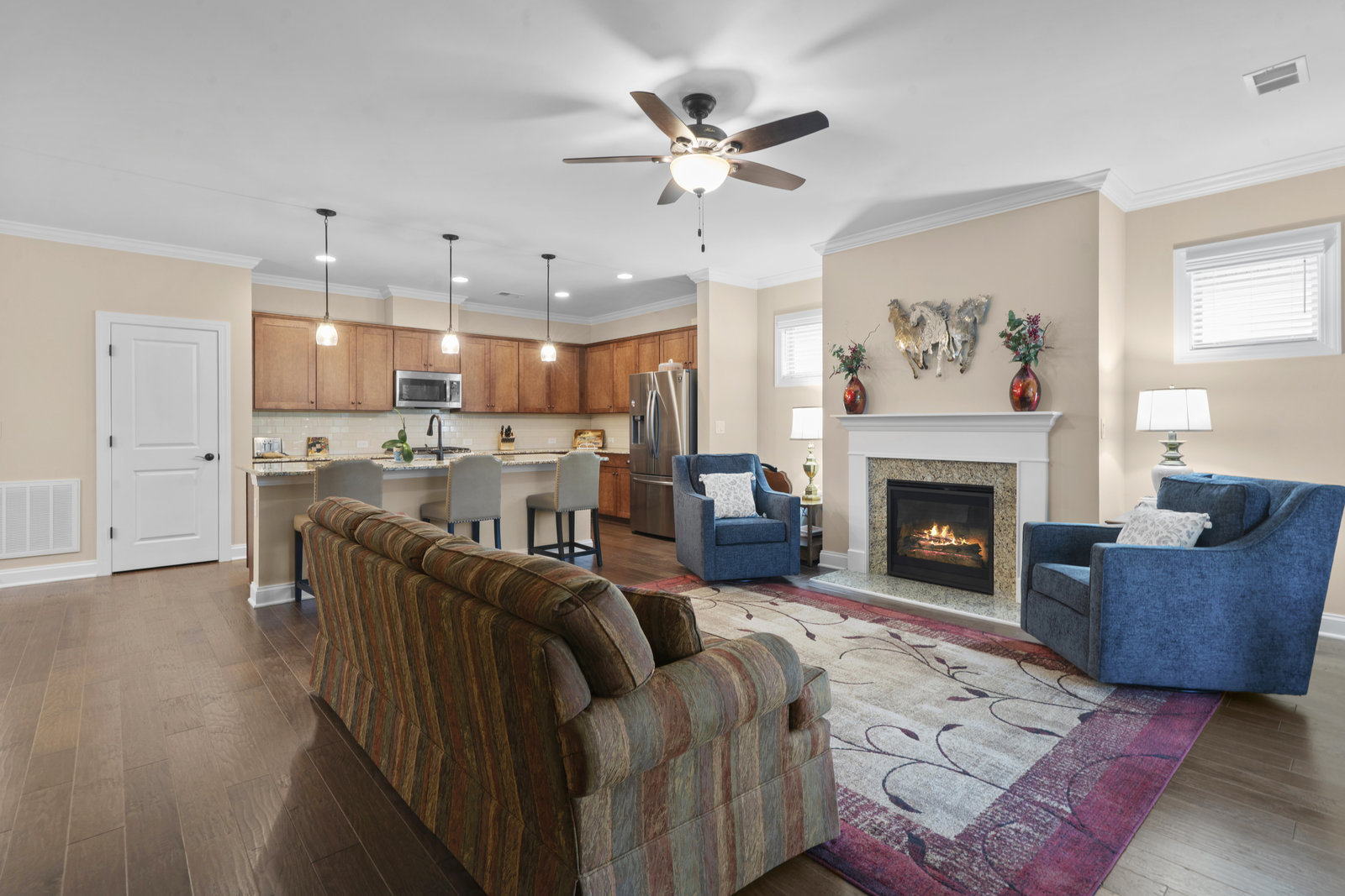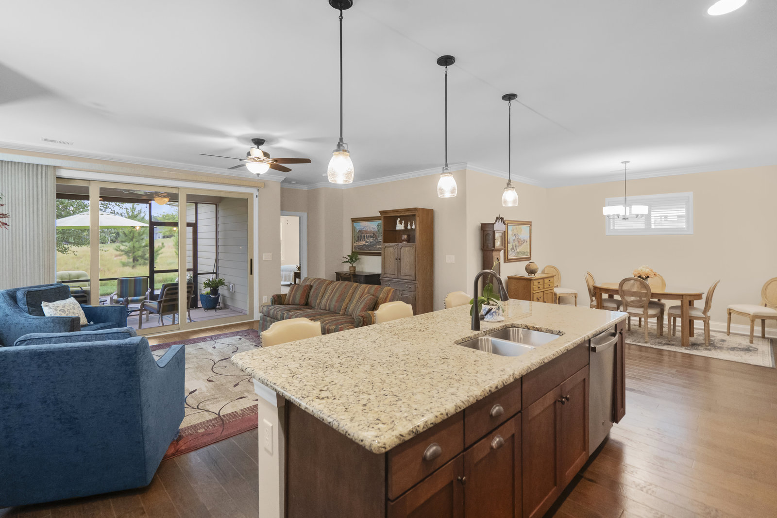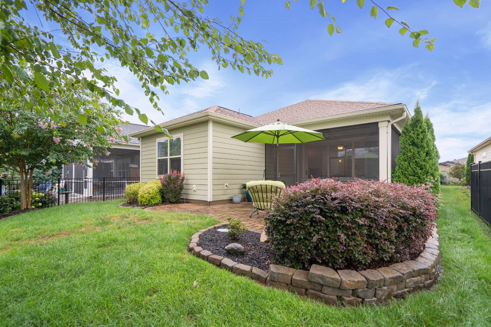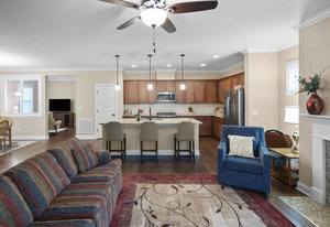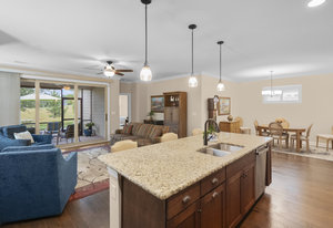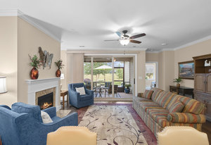 This split 2BR, 2B home with a 2 Car garage features decorator colors, lighting & finishes. Make yourself comfortable and enjoy the open-concept, beautifully landscaped Glory floorplan that has an amazing use of function and space. A well-appointed kitchen anchors the main living area and includes stainless steel appliances, gas range, granite countertops, pendant lighting, light craftsman style cabinetry and island breakfast bar. The great room has a gas fireplace that flows thru the wall of glass to a private screened lanai & onto an extended paver patio with unobstructed common area views. A serene master suite completes this home & ensuite bath with dual sink vanity, tile floor and a generous walk-in closet & tiled shower. Low maintenance wood and tile flooring main living areas and carpeted bedrooms plus crown molding throughout the home. Large laundry room with additional cabinetry/storage. Trilogy Membership includes Freedom Boat Club on Lake Norman plus award winning amenities...