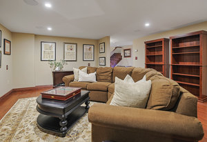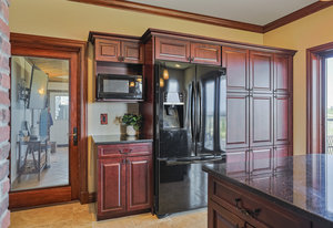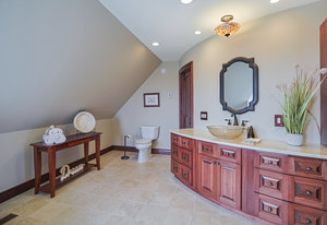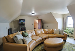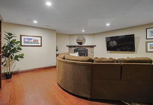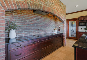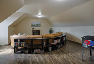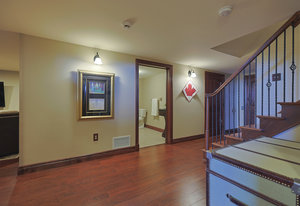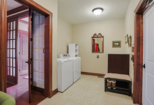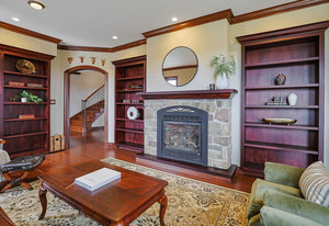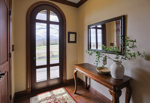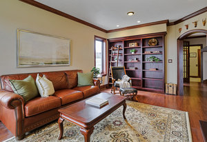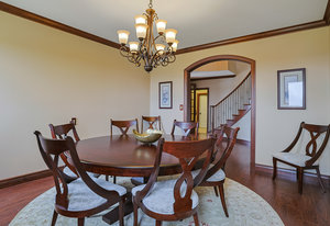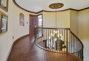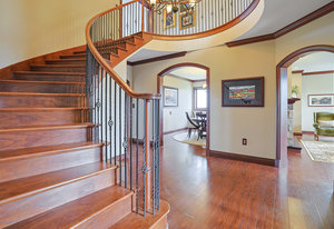 As you step inside, you'll be greeted by the grandeur of the two-story entryway adorned with a stunning chandelier that elegantly matches the fixtures throughout the house. The curved walls and wood trim arches create a sense of warmth and sophistication.