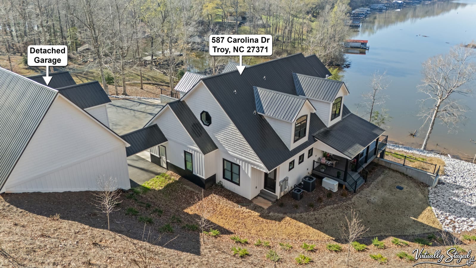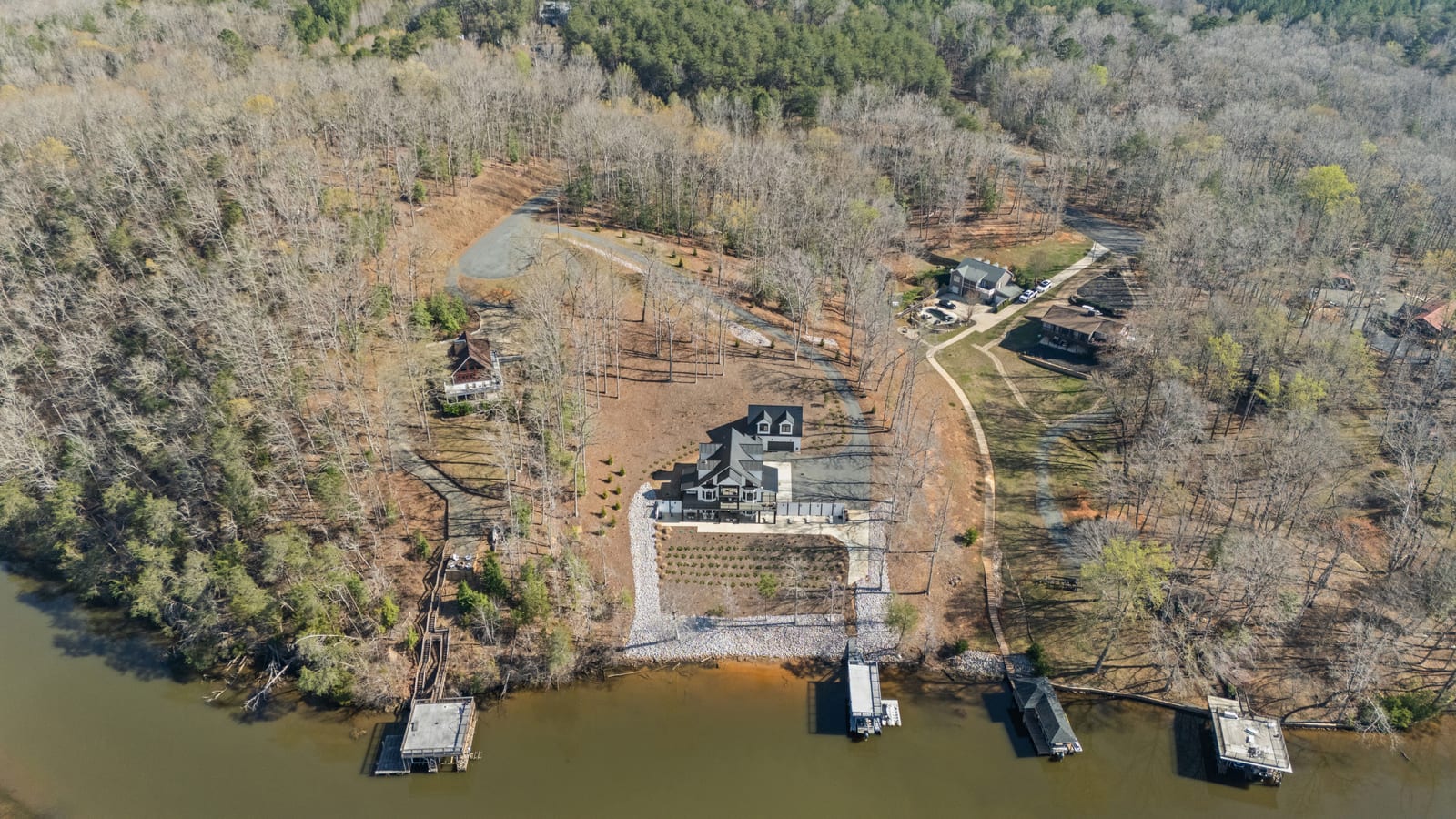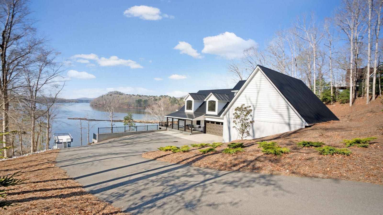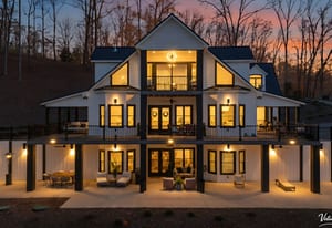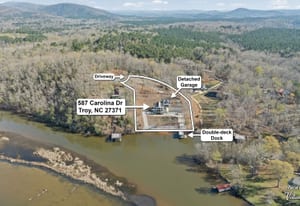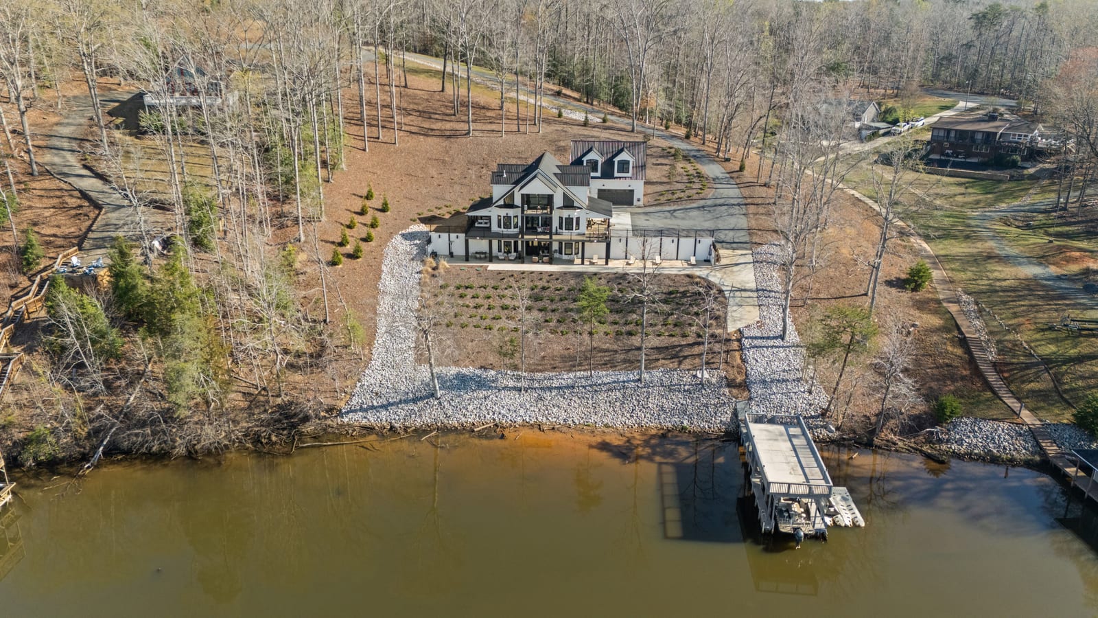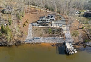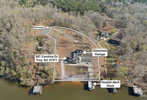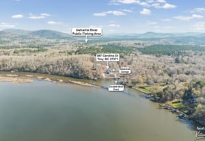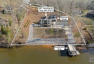 Set along the shoreline of Lake Tillery, this 3-bedroom, 3-bath custom-built residence (2024) offers 3,362 square feet of refined living on 1.43 private acres, where architecture and setting come together to create a truly striking waterfront retreat. Clean lines, curated finishes, and expansive glass frame uninterrupted lake views, bringing natural light into every level of the home. Designed for both everyday living and entertaining, the open layout flows effortlessly onto spacious covered porches and outdoor living areas that overlook the water. The kitchen blends form and function with sleek quartz surfaces, custom cabinetry, and premium appliances, while thoughtfully selected details carry throughout the home for a cohesive, high-end aesthetic. The primary suite is designed as a private escape, featuring a spacious layout and a spa-style bath with elevated finishes and a modern, tranquil feel. The lower level expands the living space with a fully finished area ideal for entertaining, complete with a custom bar and direct access to the outdoors. A private dock extends your living experience onto the water, making it easy to enjoy everything Lake Tillery has to offer. The surrounding landscape provides a peaceful, natural backdrop with long-range views that change beautifully with the seasons. A distinctive, newly constructed waterfront home offering a rare combination of design, setting, and lifestyle.