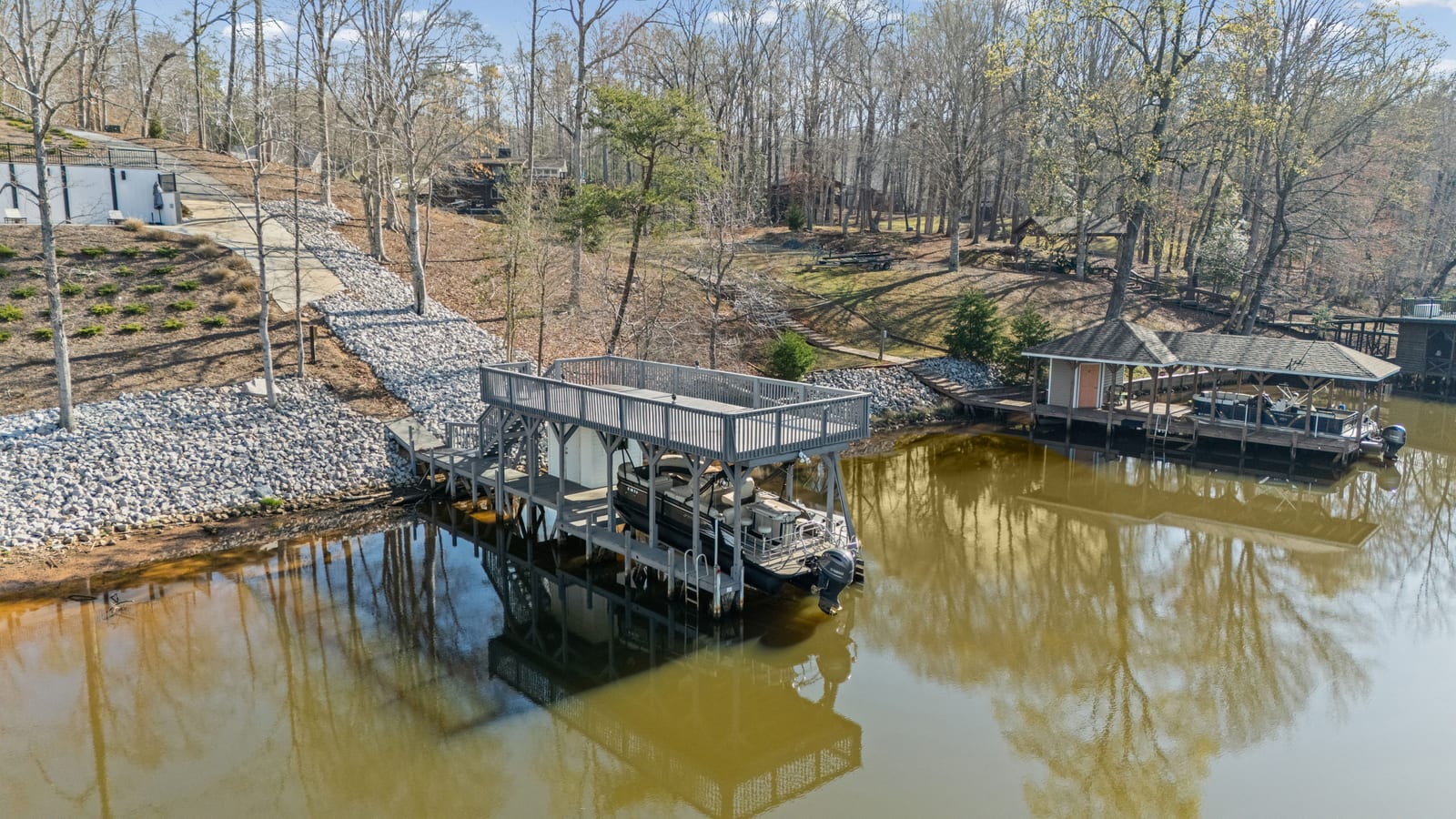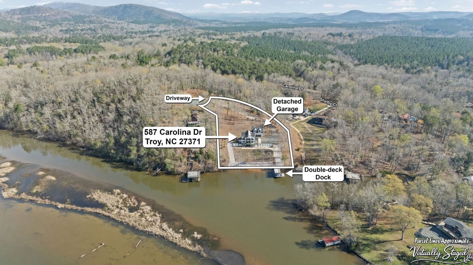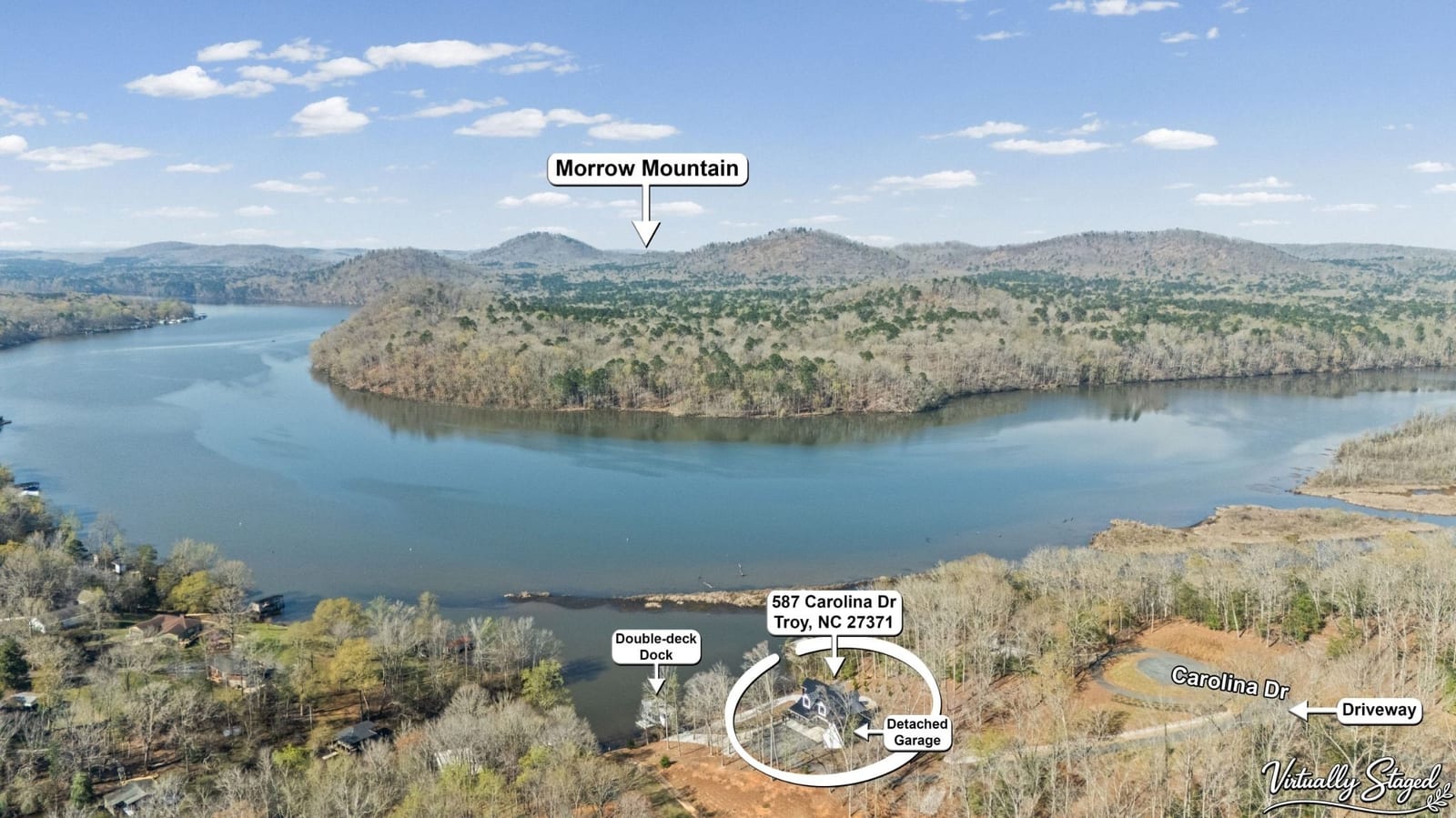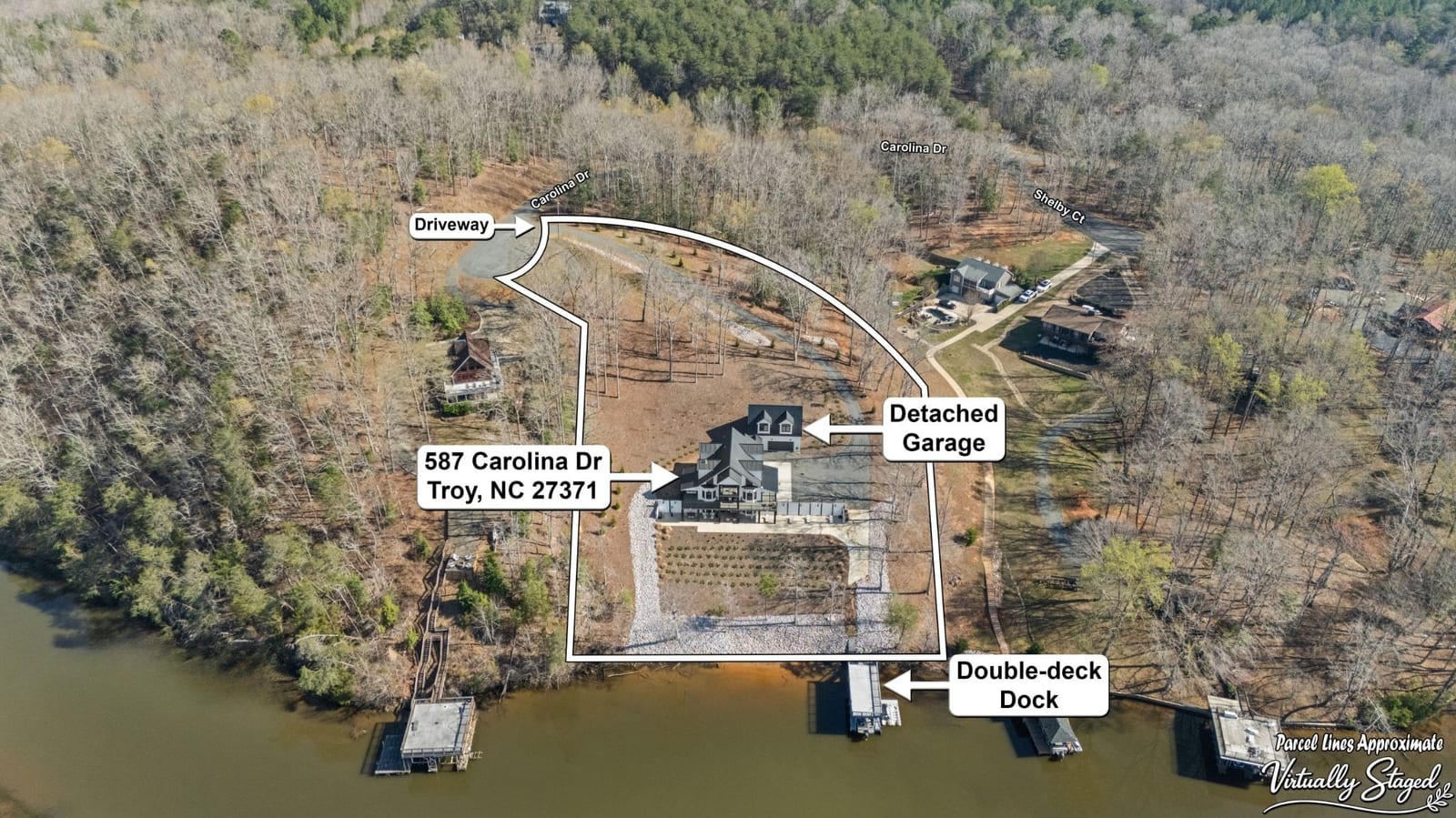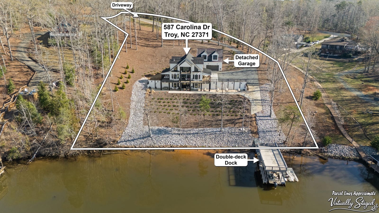 Set along the shoreline of Lake Tillery, this 3-bedroom, 3-bath custom-built residence (2024) offers 3,362 square feet of refined living on 1.43 private acres, where architecture and setting come together to create a truly striking waterfront retreat. Clean lines, curated finishes, and expansive glass frame uninterrupted lake views, bringing natural light into every level of the home. Designed for both everyday living and entertaining, the open layout flows effortlessly onto spacious covered porches and outdoor living areas that overlook the water. The kitchen blends form and function with sleek quartz surfaces, custom cabinetry, and premium appliances, while thoughtfully selected details carry throughout the home for a cohesive, high-end aesthetic. The primary suite is designed as a private escape, featuring a spacious layout and a spa-style bath with elevated finishes and a modern, tranquil feel. The lower level expands the living space with a fully finished area ideal for entertaining, complete with a custom bar and direct access to the outdoors. A private dock extends your living experience onto the water, making it easy to enjoy everything Lake Tillery has to offer. The surrounding landscape provides a peaceful, natural backdrop with long-range views that change beautifully with the seasons. A distinctive, newly constructed waterfront home offering a rare combination of design, setting, and lifestyle.