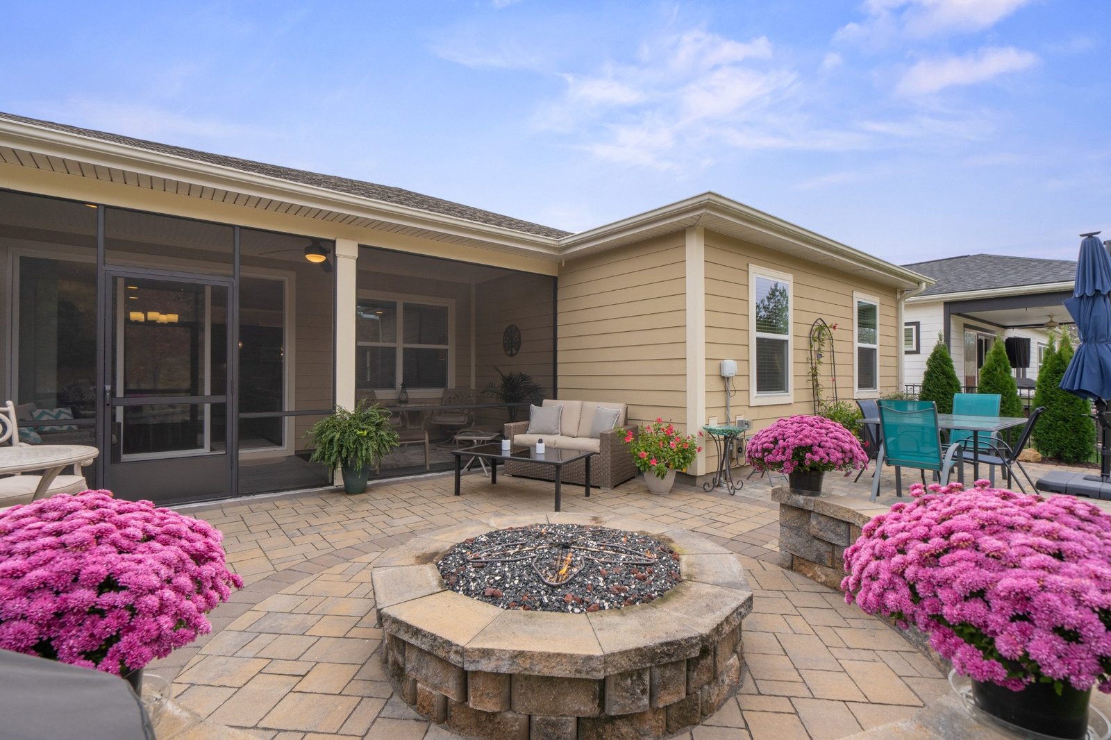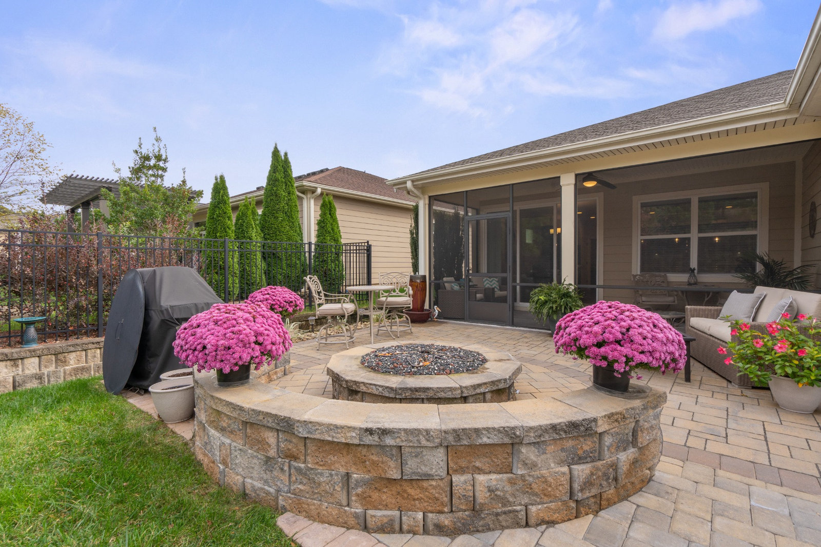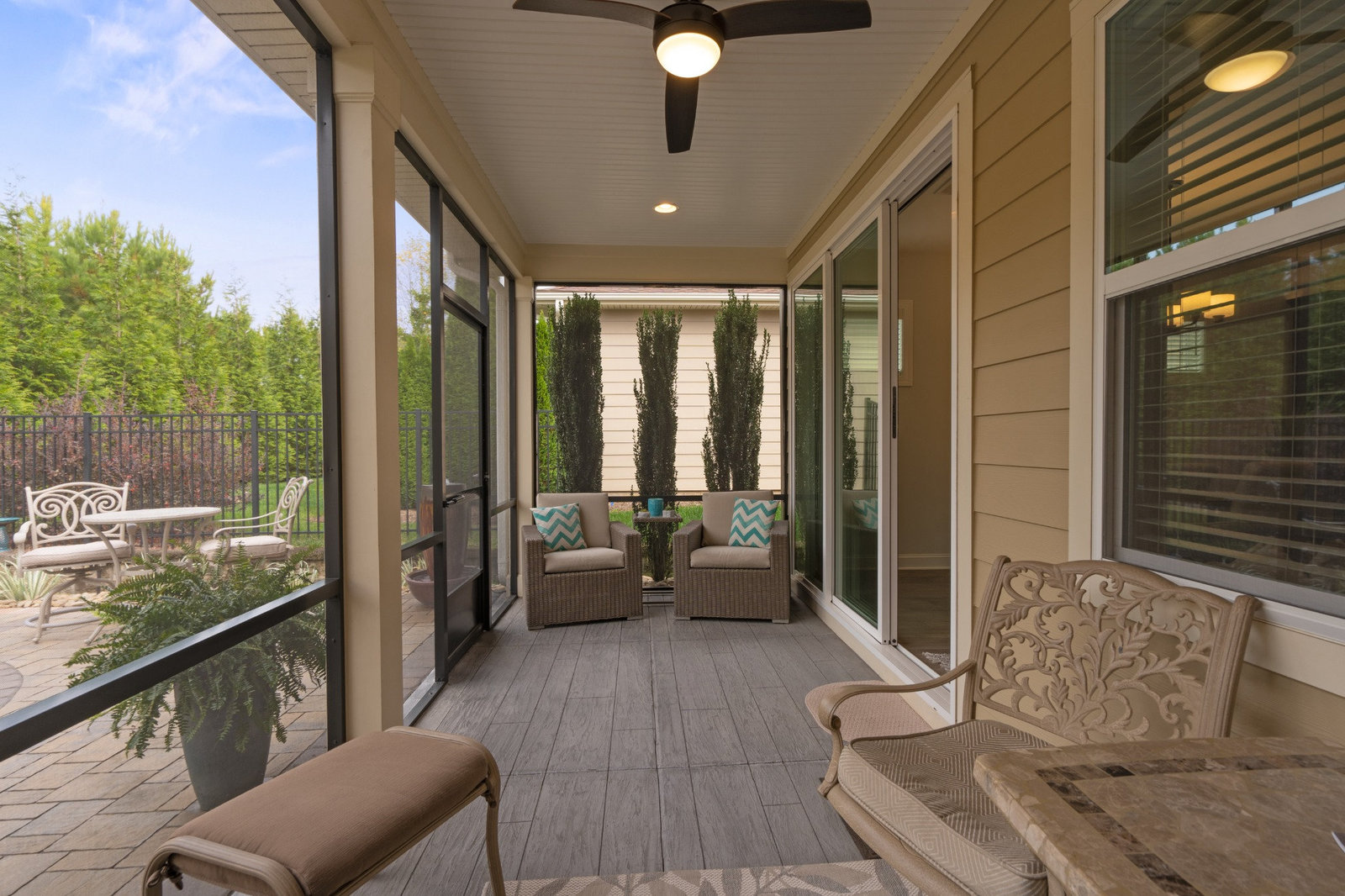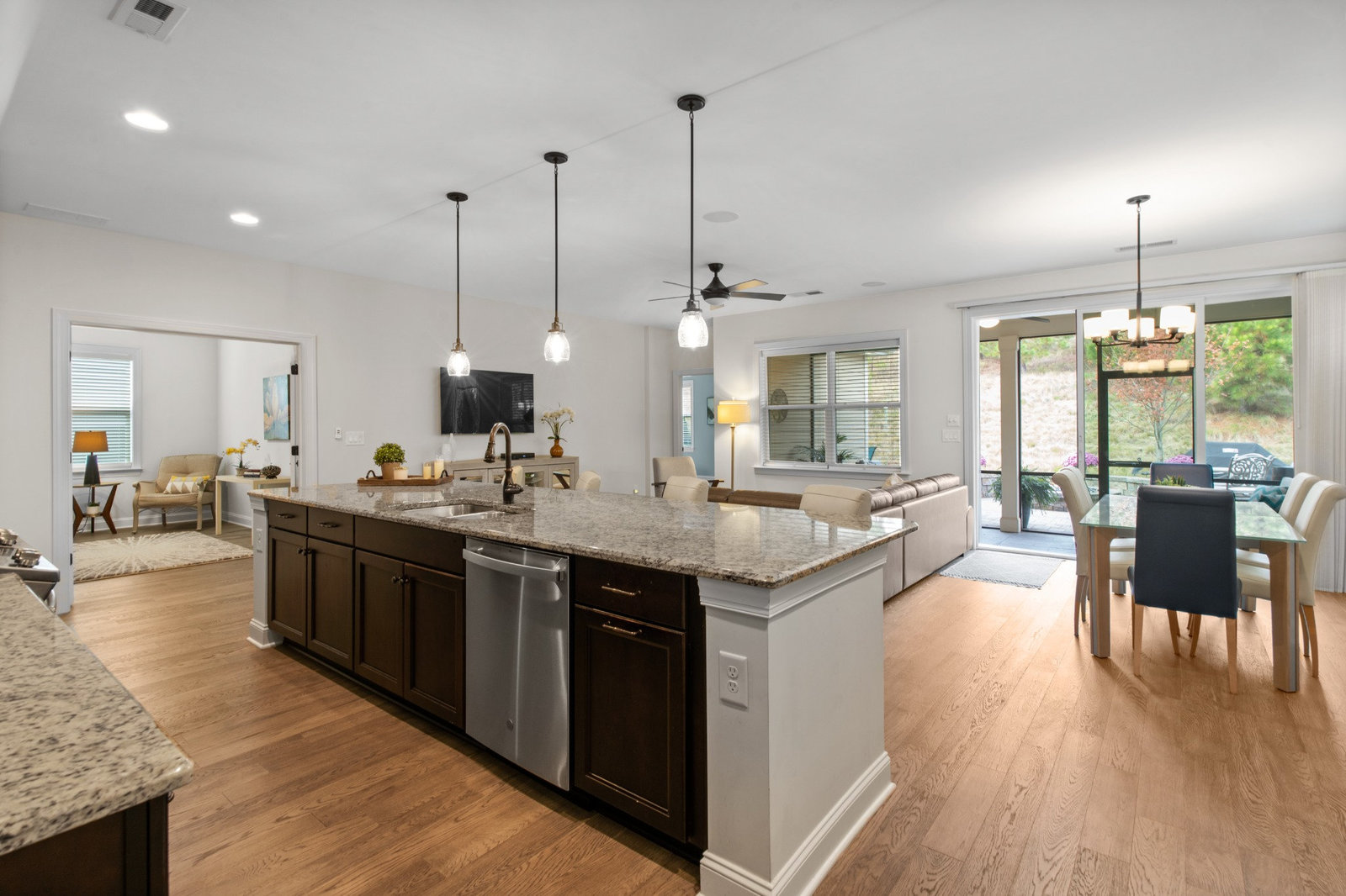 Enjoy the private, park like, wooded, grassy knoll views from this well maintained Connect w/open concept living and multi use floor plan. Wood and tile floors for easy maintenance. Exceptional kitchen features amazing storage and counter space, plus a gas range, tile back splash, over cabinet lighting and huge island complete with solid surface counter tops. Adjoining dining area for large gatherings opens to the covered screened Lanai that features an extended paver patio plus a relaxing stone fire pit with seating wall for added entertaining options. Great room has built in speakers, recessed and designer lighting. Grand primary bedroom and en-suite bath with dual sink vanity, tiled shower, walk in and linen closets. Added bonus: office/den flex room offers imaginative use of the space for your creative endeavors. 2 ample guest bedrooms with central bath. Custom blinds throughout. Trilogy Membership include Freedom Boat Club on Lake Norman plus award winning amenities