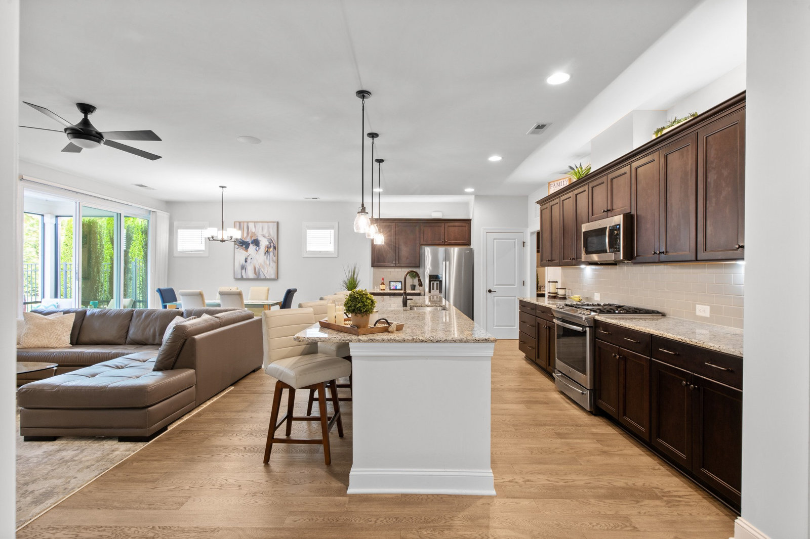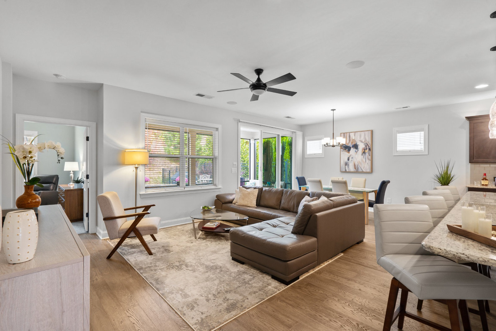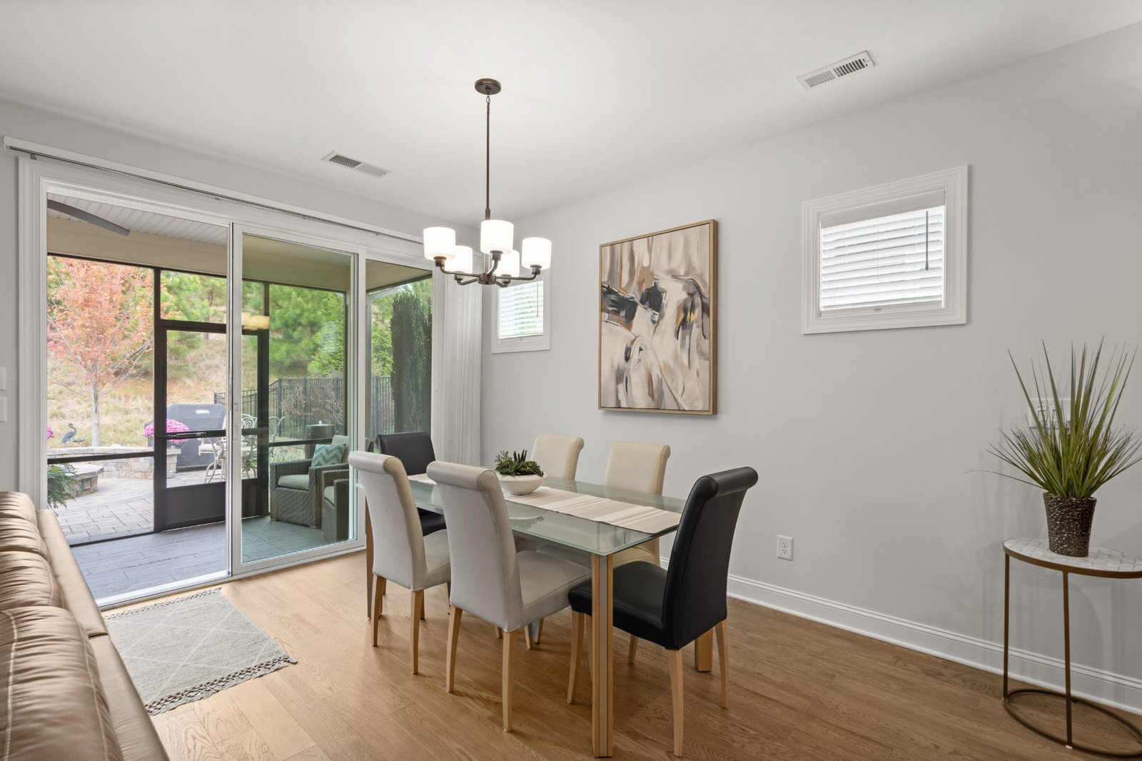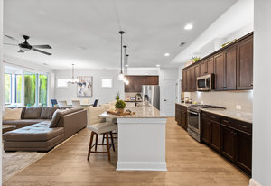 Enjoy the private, park like, wooded, grassy knoll views from this well maintained Connect w/open concept living and multi use floor plan. Wood and tile floors for easy maintenance. Exceptional kitchen features amazing storage and counter space, plus a gas range, tile back splash, over cabinet lighting and huge island complete with solid surface counter tops. Adjoining dining area for large gatherings opens to the covered screened Lanai that features an extended paver patio plus a relaxing stone fire pit with seating wall for added entertaining options. Great room has built in speakers, recessed and designer lighting. Grand primary bedroom and en-suite bath with dual sink vanity, tiled shower, walk in and linen closets. Added bonus: office/den flex room offers imaginative use of the space for your creative endeavors. 2 ample guest bedrooms with central bath. Custom blinds throughout. Trilogy Membership include Freedom Boat Club on Lake Norman plus award winning amenities