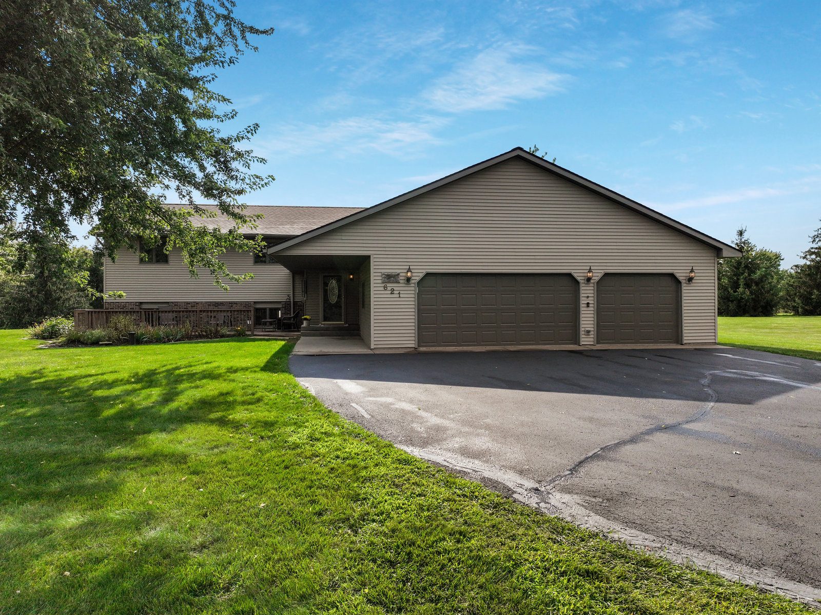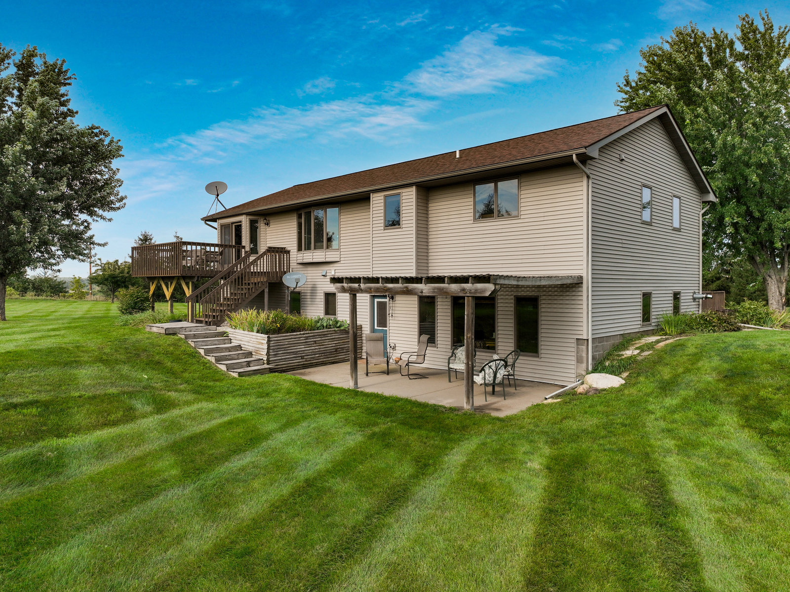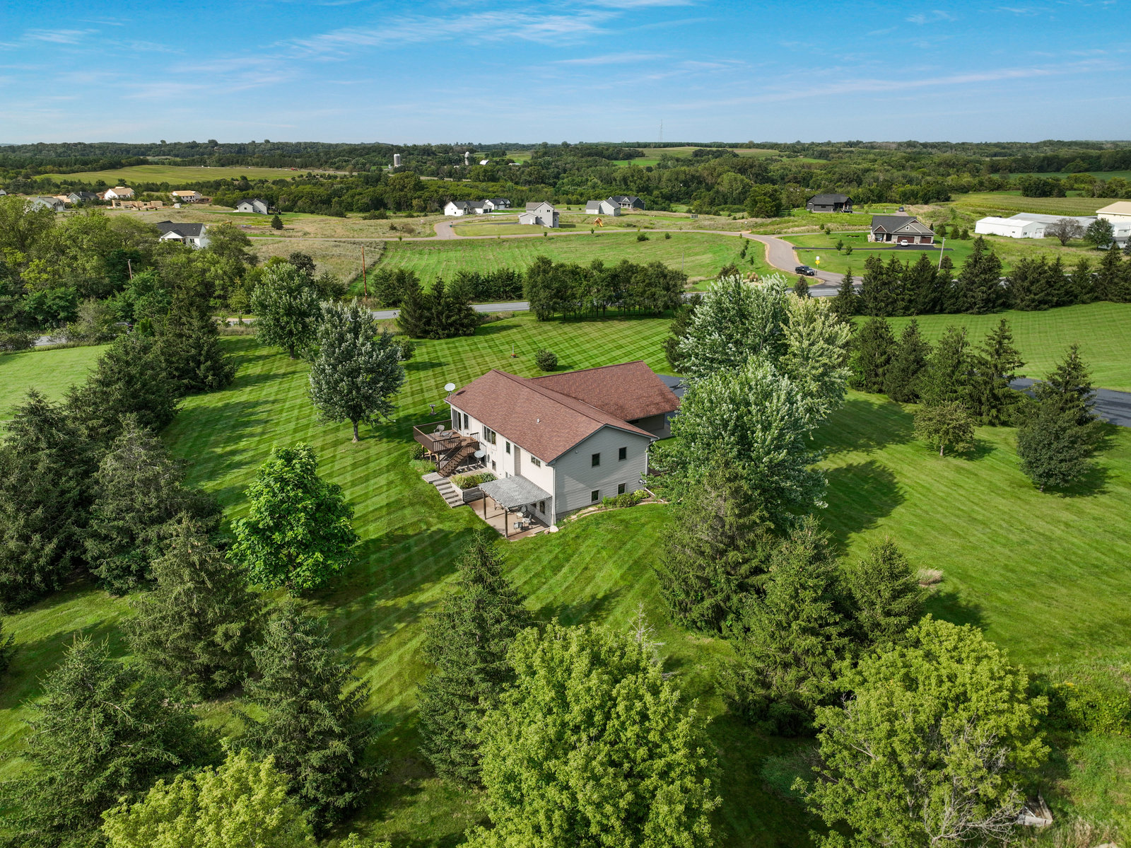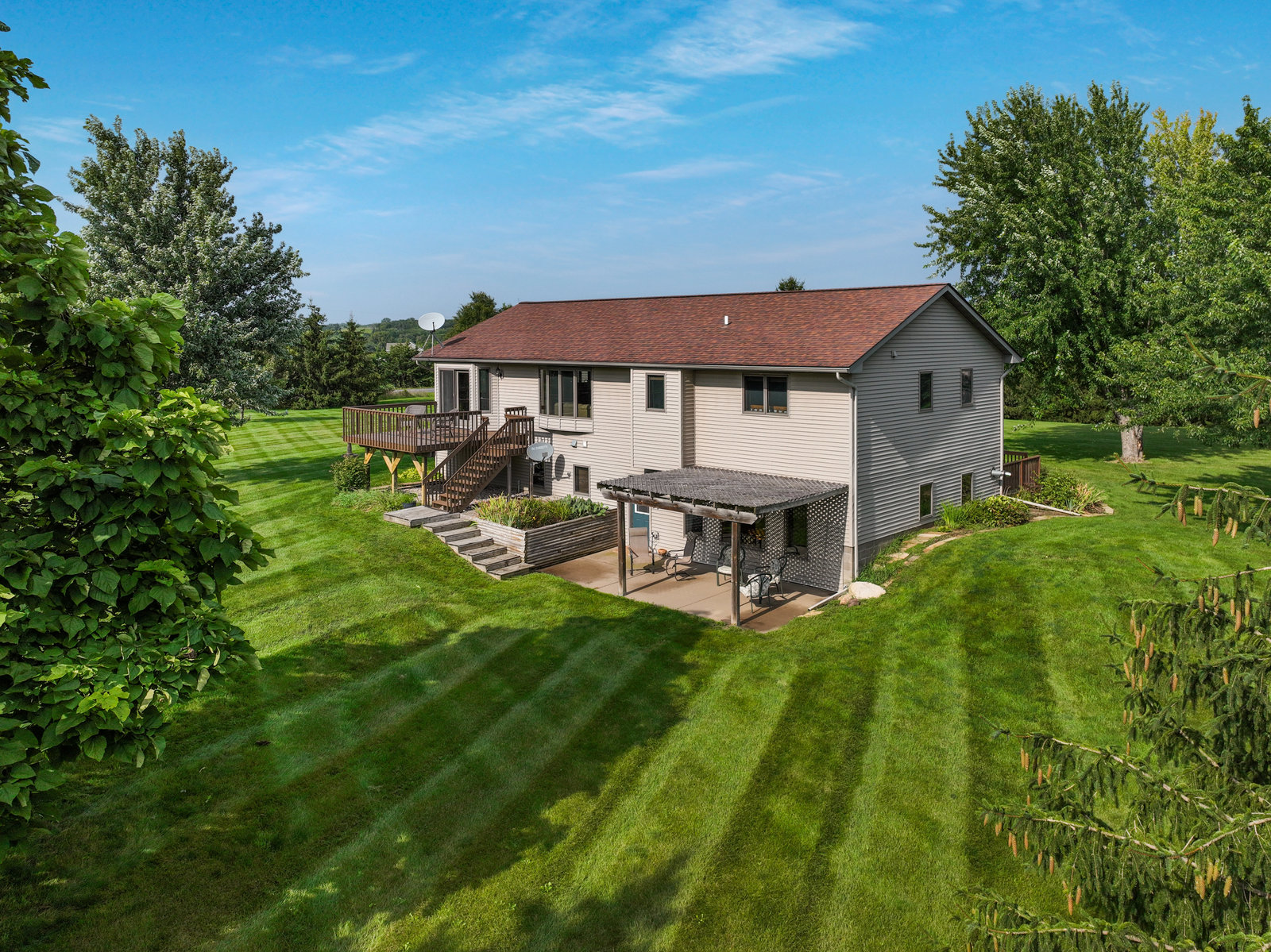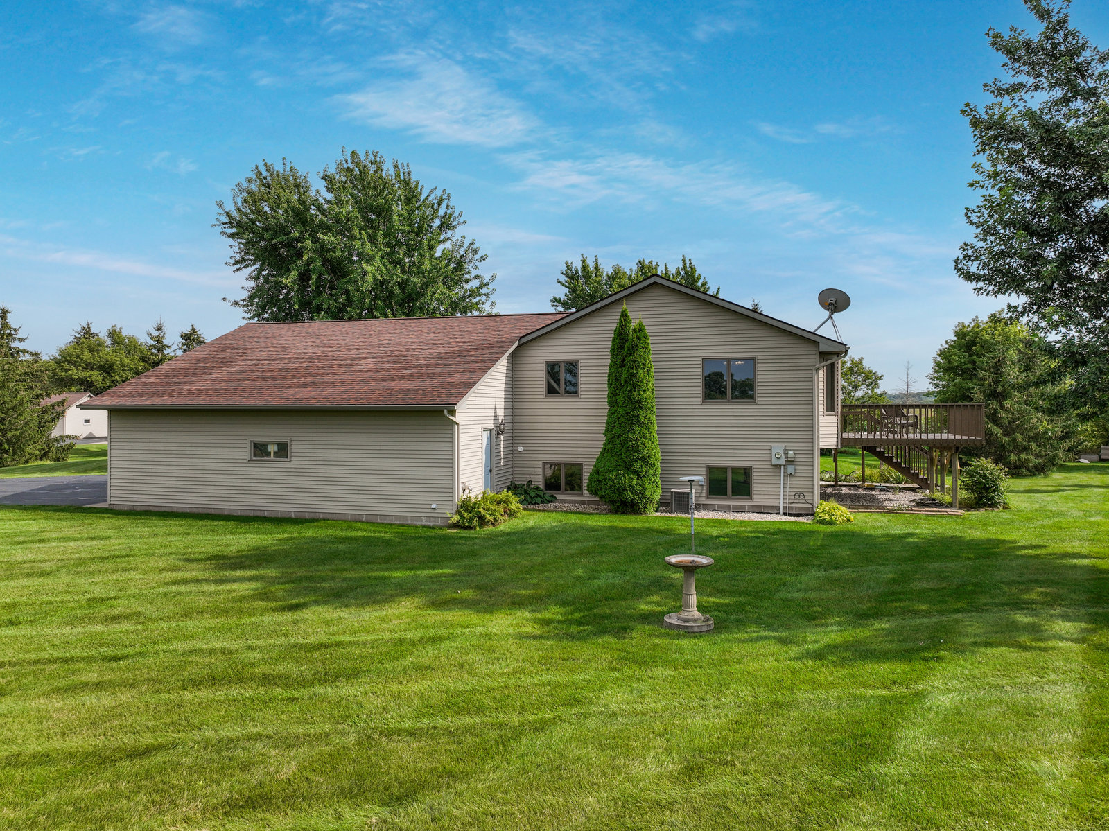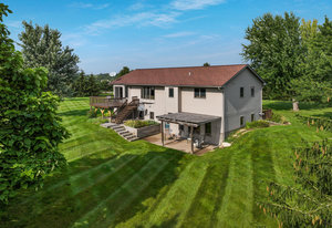 Terrific 4 BR, 3 BA home on almost 2, park-like acres in Troy Township! Enjoy convenience and comfort everywhere you go: a spacious foyer to welcome guests; open concept main-floor living that walks out to outdoor recreational spaces; a kitchen with lovely and easy-to-clean marble countertops and tile floors; 3 BR on the main level, including the primary with en suite bathroom; a handy main-floor laundry; a huge, lower-level family room with pellet/corn stove, wet bar, and walkout; a lower level 4th BR and office; and storage galore, even an outdoor storage shed! Outdoor entertainment spaces abound: large, newly stained deck; concrete patio with pergola; and huge front deck offer places to read, relax, grill or party—whatever the mood or occasion merits! Fantastic, oversized 3-car garage with a large overhang is insulated and heated with a second pellet stove and has plenty of room for work and play! Close to Hudson and the Twin Cities, this property is peaceful and private, with gorgeous evergreens, perennials, and a lovely yard with plenty of open space for gardens, fun and games! This home truly has something for everyone!