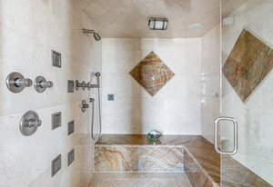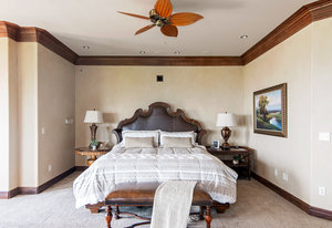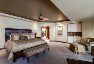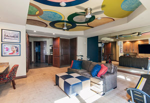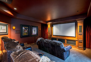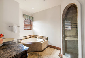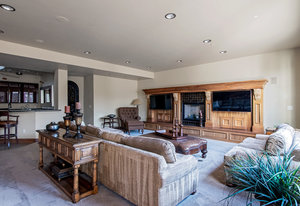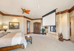 Ascend the center staircase and escape to the expansive primary bedroom suite, featuring a cozy sitting area, a spa-like bathroom with a center infinity tub and steam shower, a walk-in closet with custom shelving, an in-ceiling projector screen, a convenient coffee bar, and a private balcony. Two additional bedrooms on the upper level and two suites on the lower level offer privacy, en-suite bathrooms, and ample closet space.