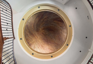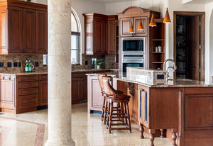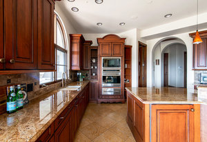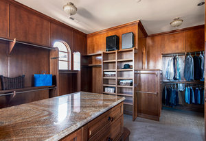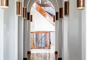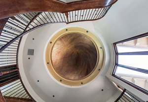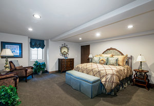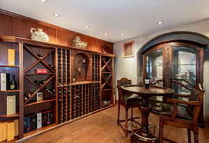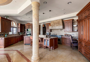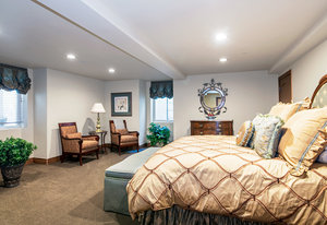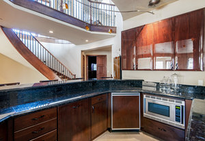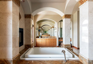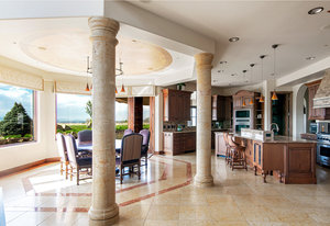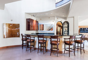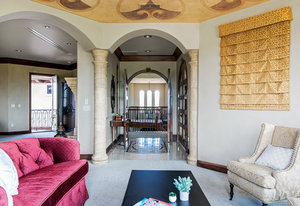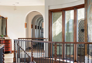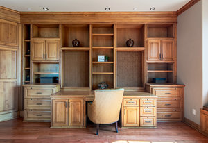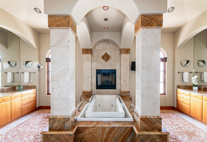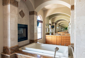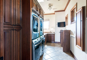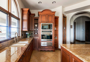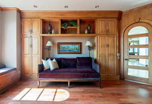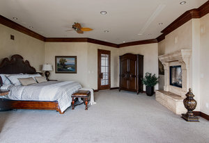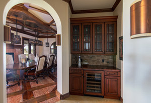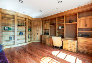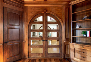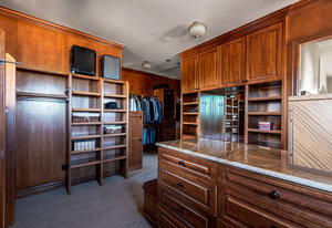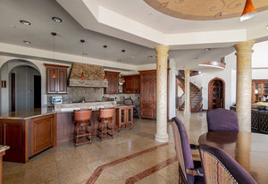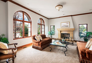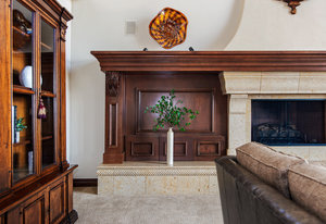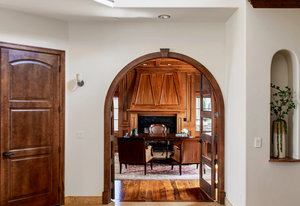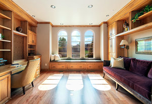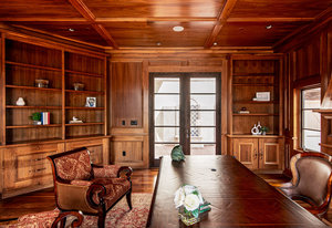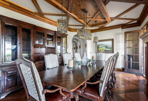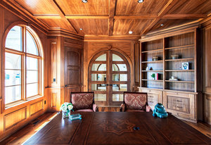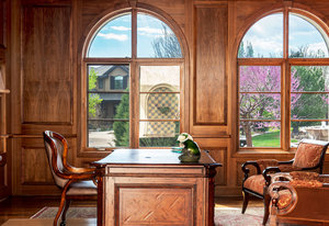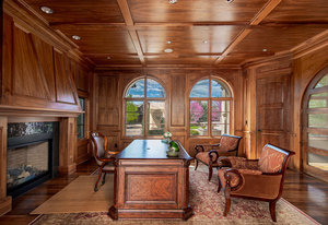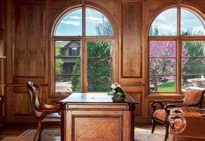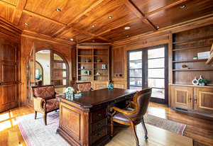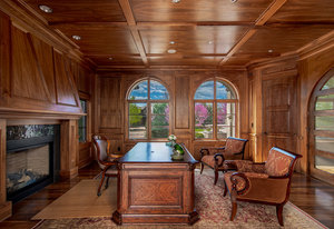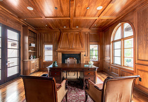 Engage your productivity with two expansive main floor offices. One is adorned with walnut cabinets, flooring, coffered ceilings, and a cozy gas fireplace. The other boasts Rosewood flooring, a built-in desk, and a comfortable window seat under arched windows.
