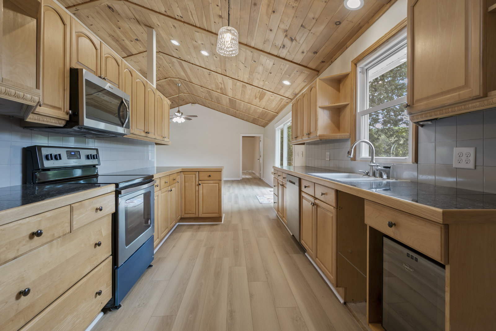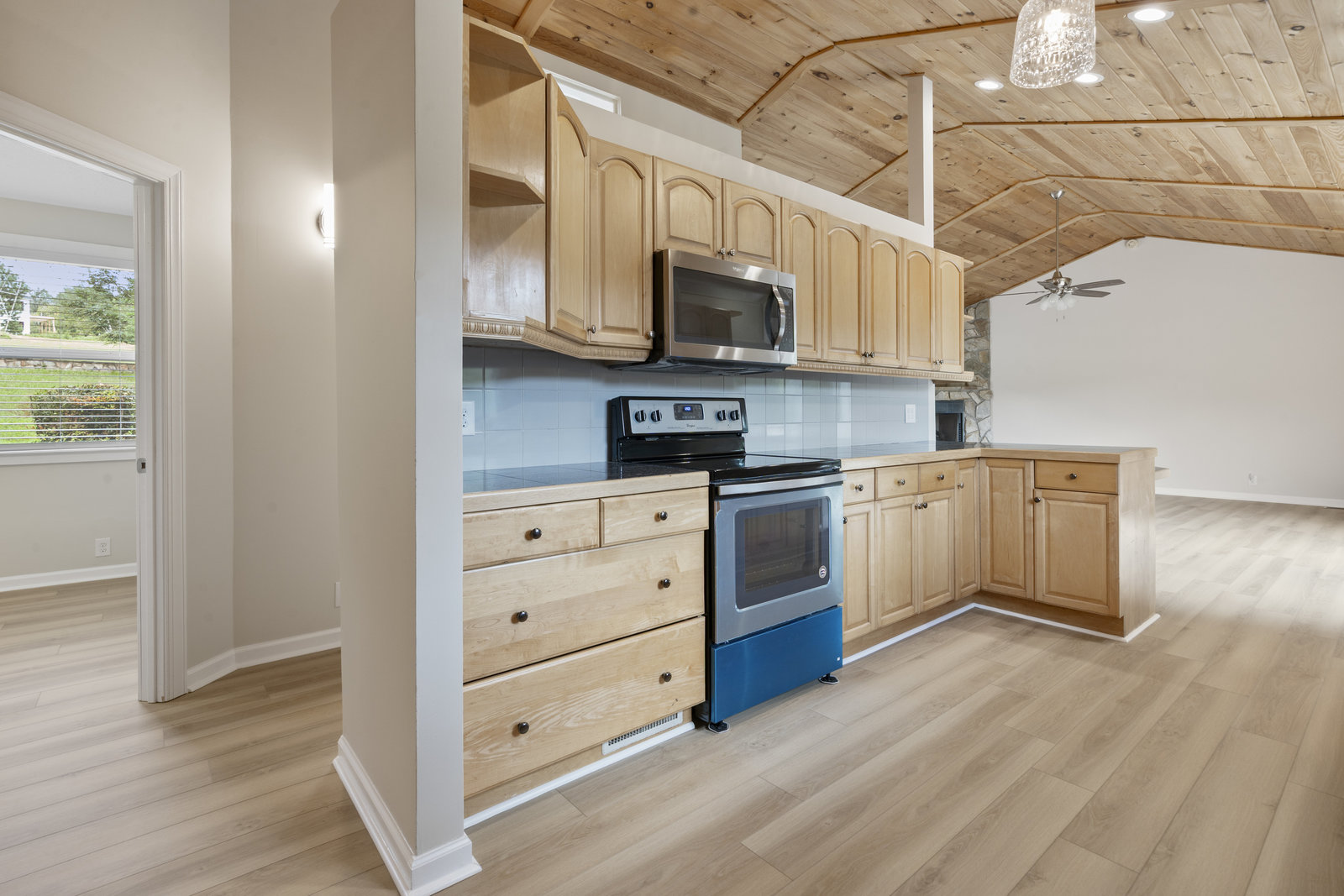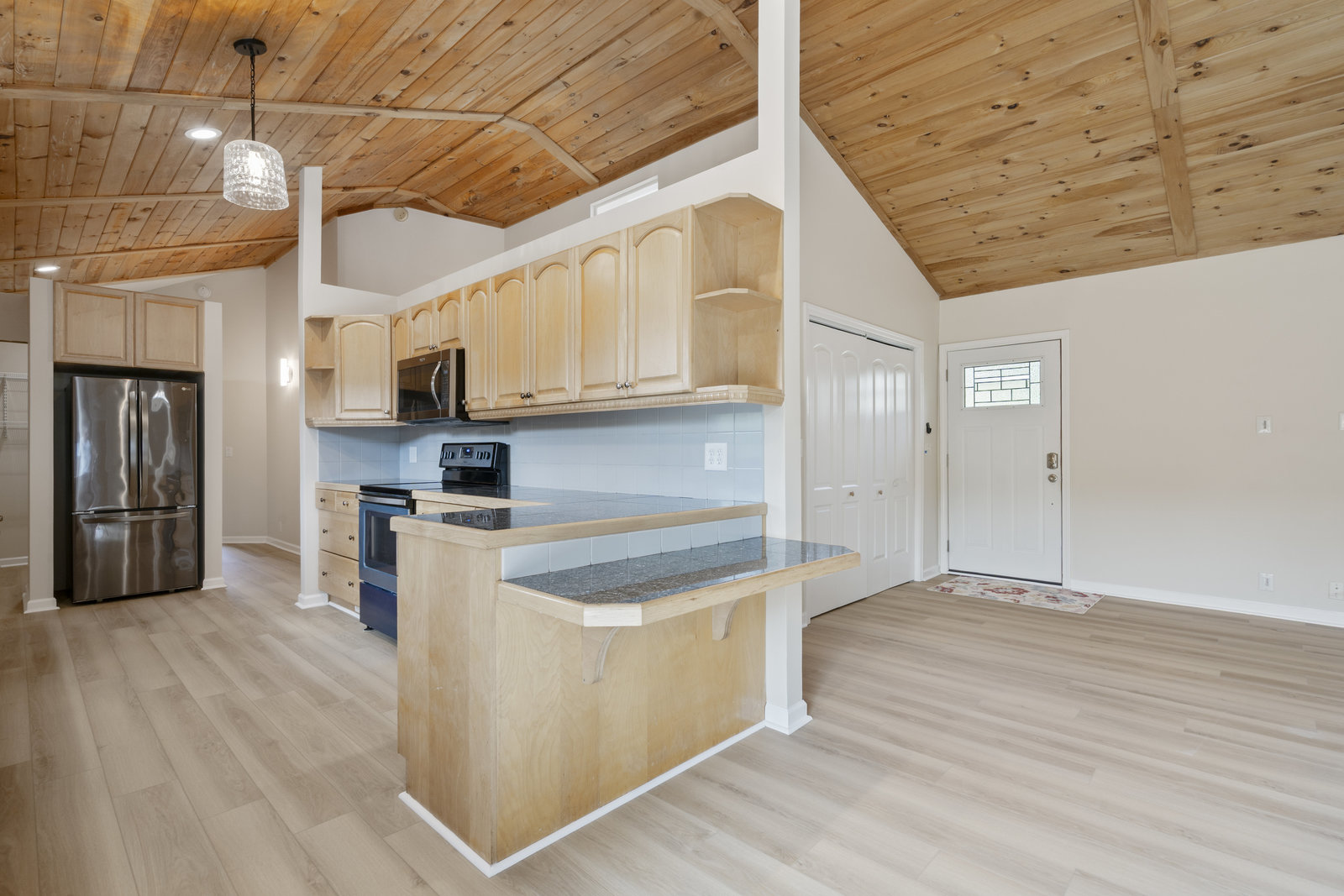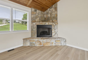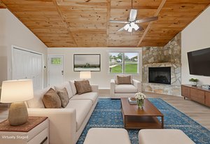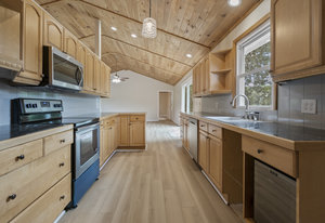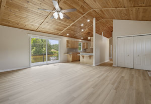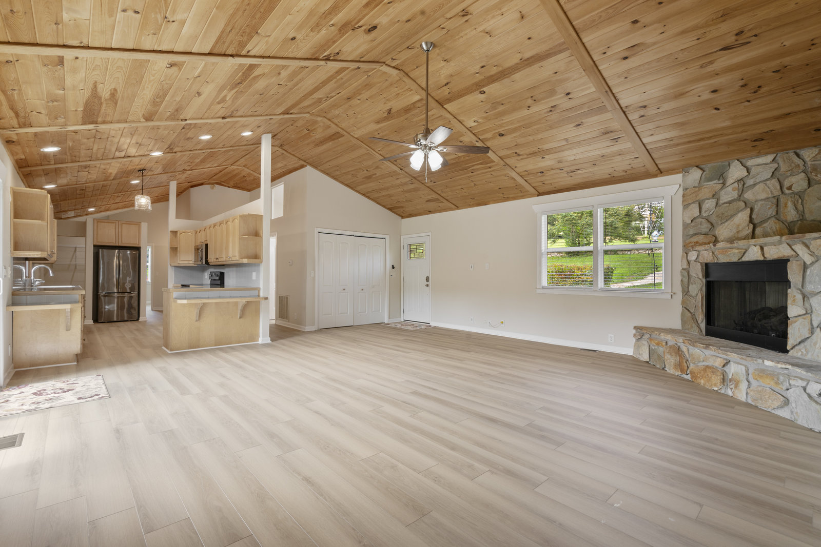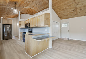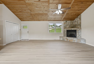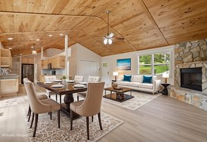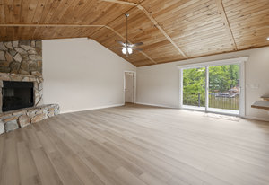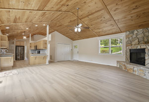 (1178 s/f). The great room is highlighted with a wood tongue & groove ceiling, cozy gas log stone fireplace & LKN views. A