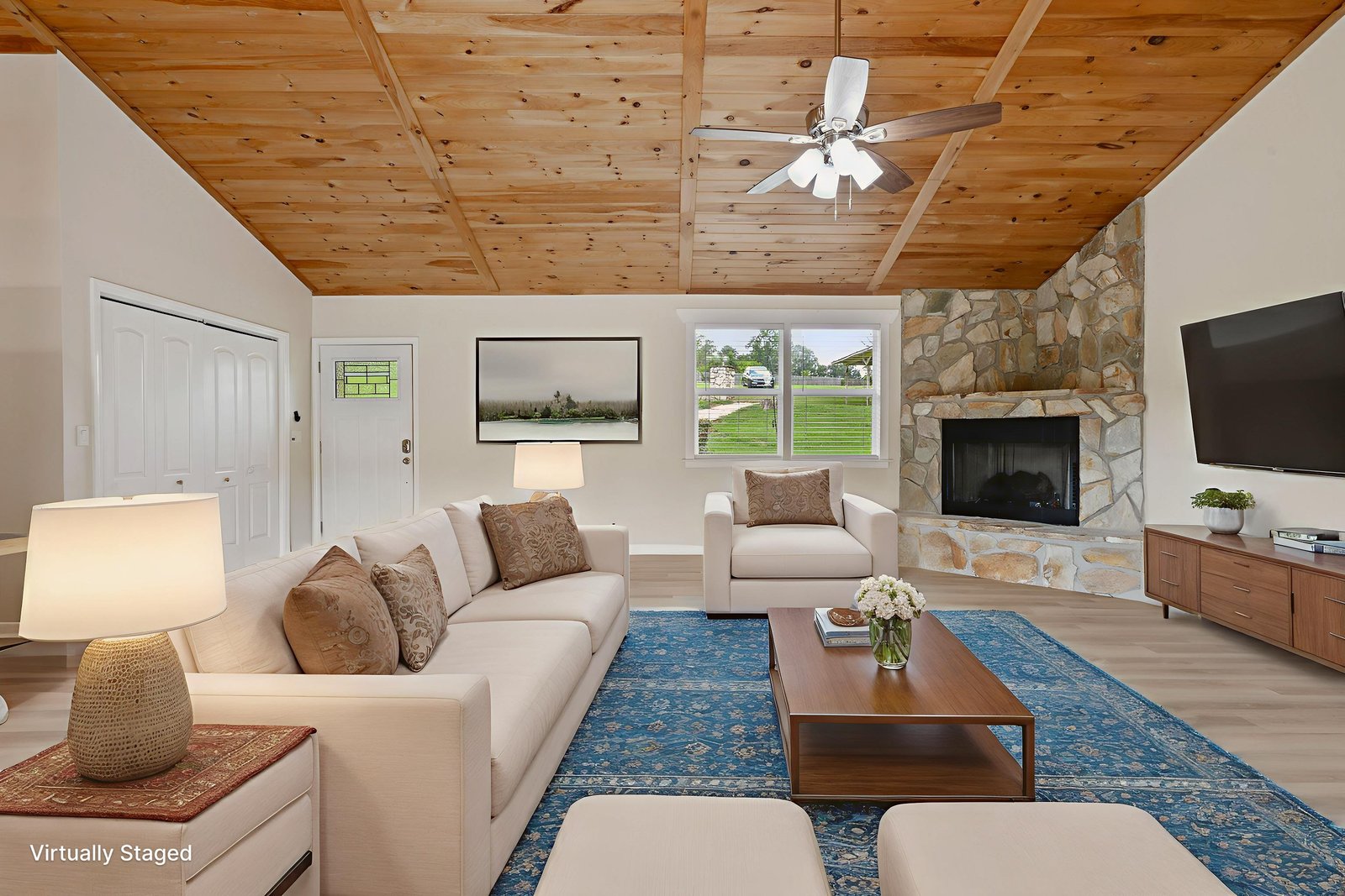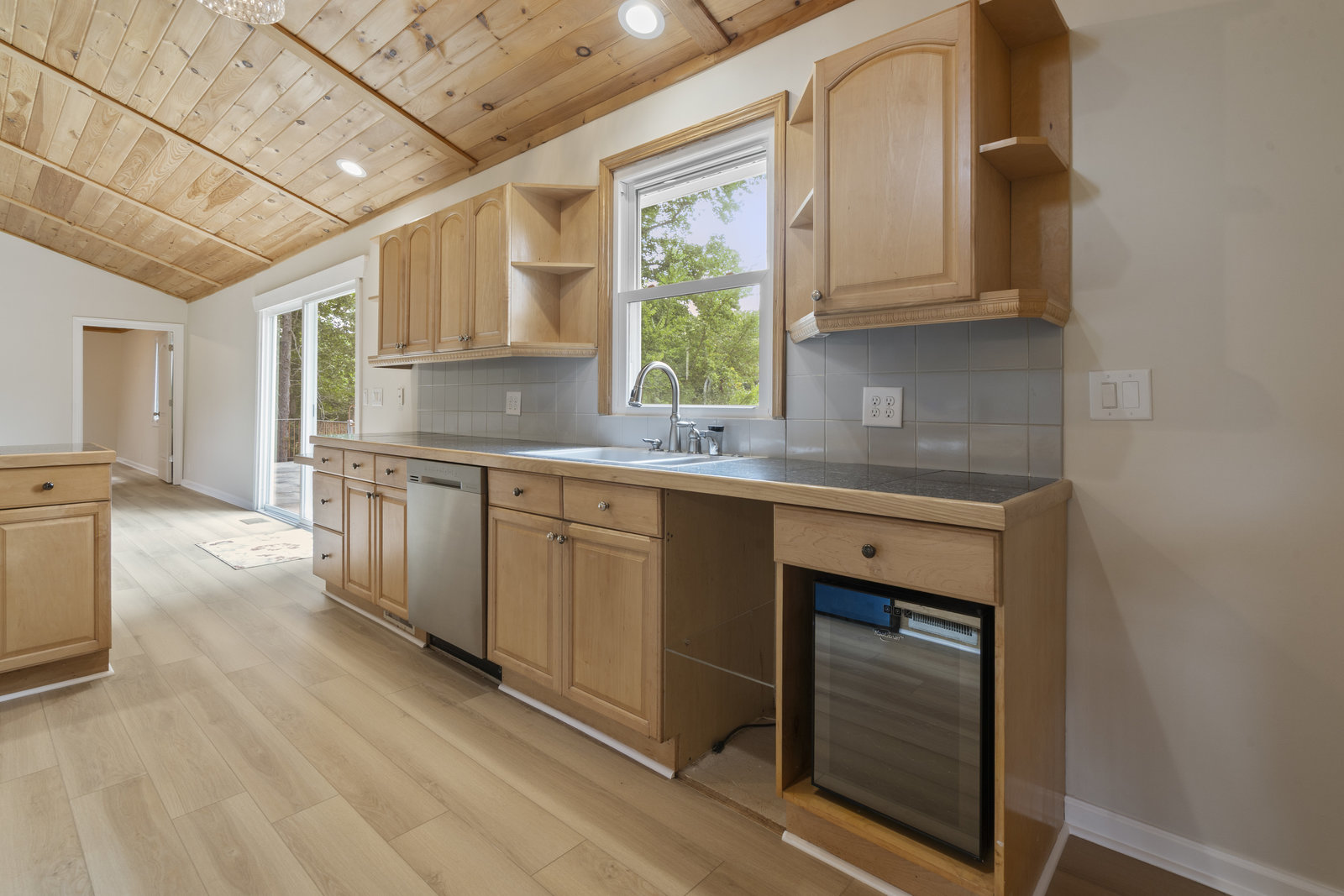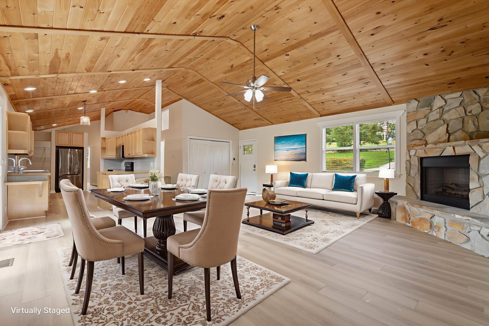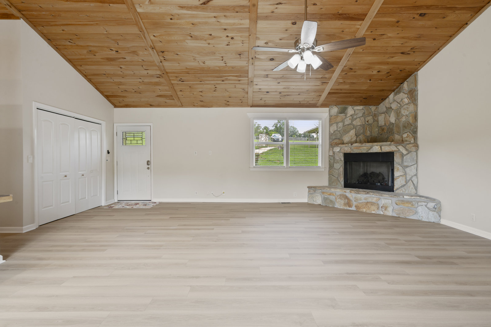 (1178 s/f). The great room is highlighted with a wood tongue & groove ceiling, cozy gas log stone fireplace & LKN views. A