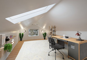 The upper level features a loft-style design with...