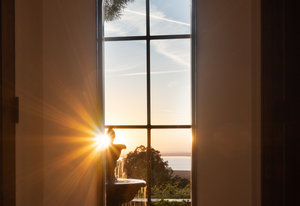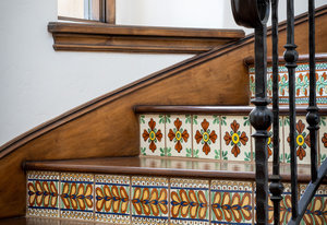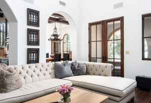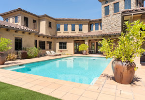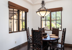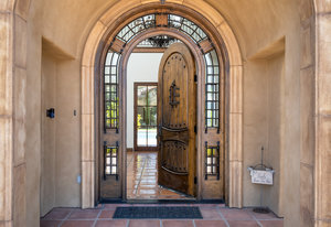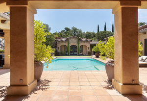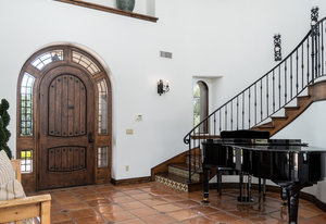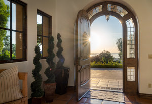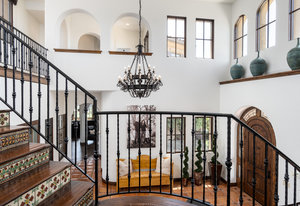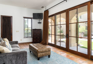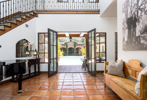 The bold entrance is unrivaled with Old Hollywood Romance: Cinematic staircase of wrought iron and hand-painted Talavera tiles lead to a split-level Master Bedroom facing the setting sun with his/hers bathroom, glassed shower, and pedestal tub. Lobby French doors frame with stunning symmetry the rectangular pool and Pool House with kitchenette, full bath and glass doors inviting the cooling breeze. Outdoor living has been designed with remarkable thought to privacy and shade from the covered entertaining space with rustic stone fireplace and built in BBQ with sink and fridge, as well as full bathroom for those starlit swims.