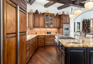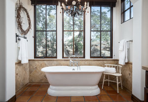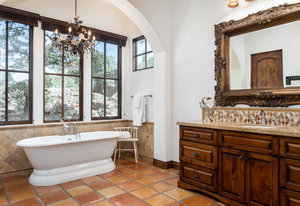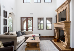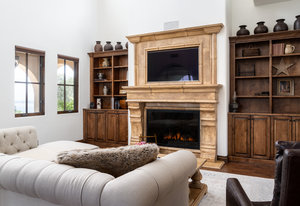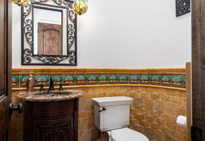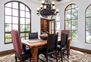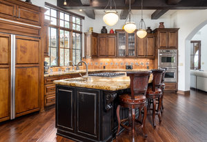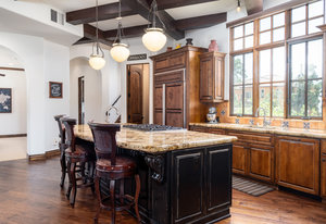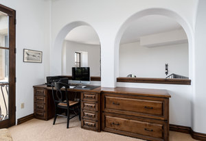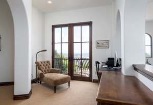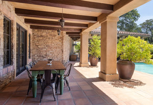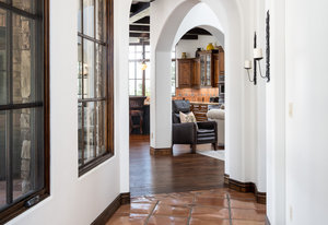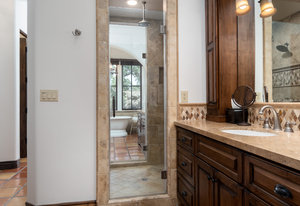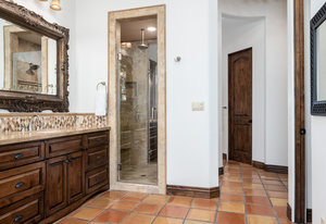 The ground floor presents the great room with built-in cabinetry, stone framed fireplace and TV, intimate family room with privacy, formal dining room with walk-in wine closet, breakfast nook, laundry room, full bath, and powder room. The open concept kitchen with stone countertops and GE Monogram professional kitchen appliances welcomes all to gather around. Hand-crafted terra-cotta tiles from Saltillo, Mexico add warmth and practicality throughout the home and pool area. Archways lead the way to the second floor bedrooms - 3 with ensuite baths, plus a study - then upward to the third floor office.