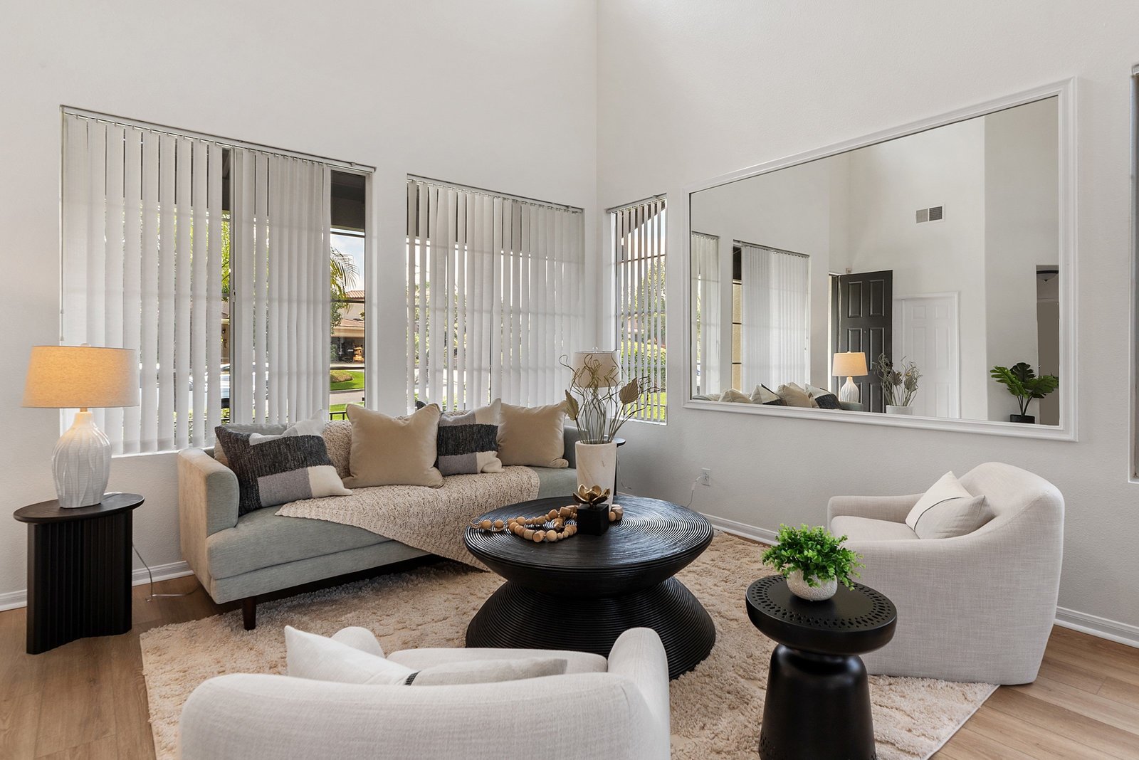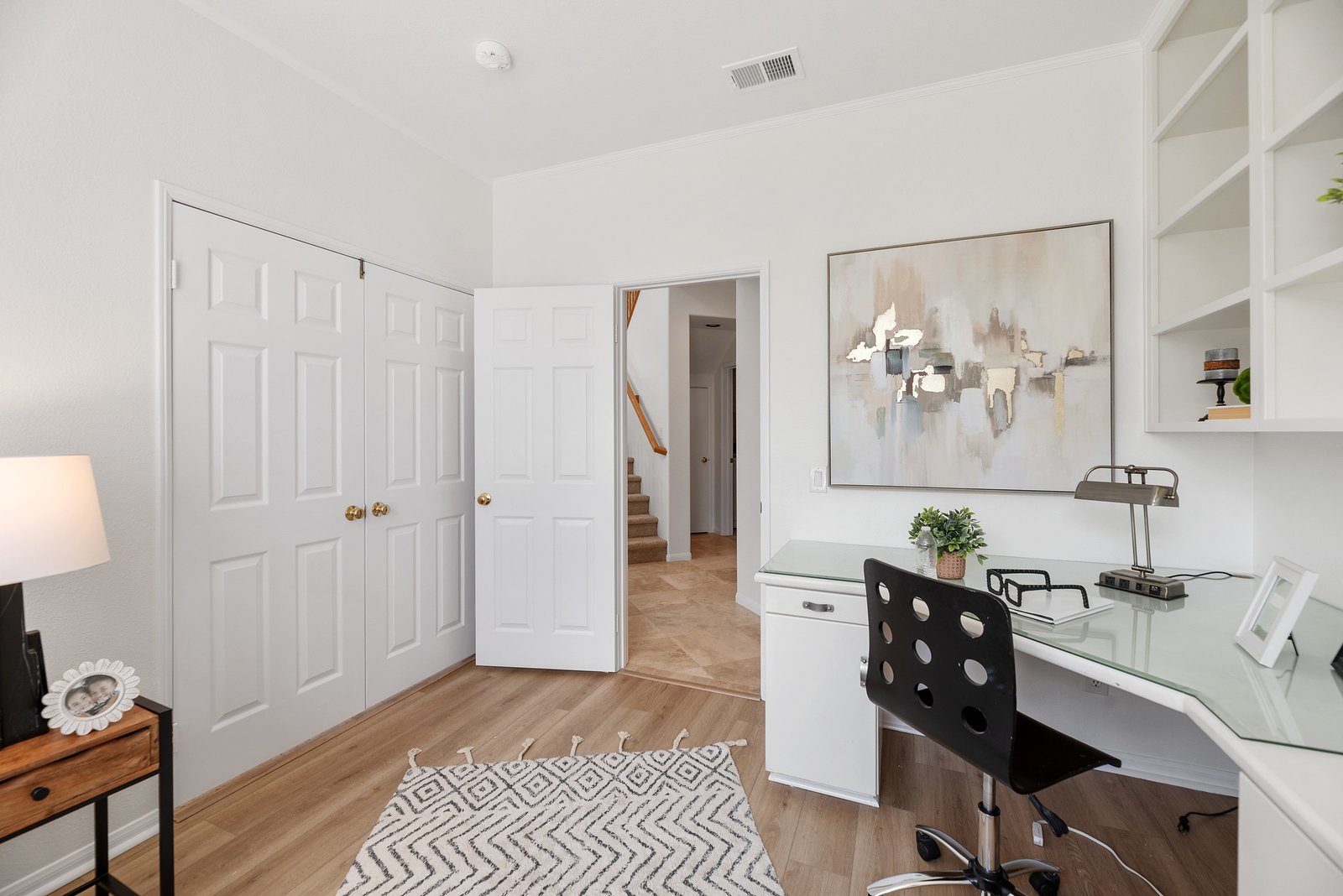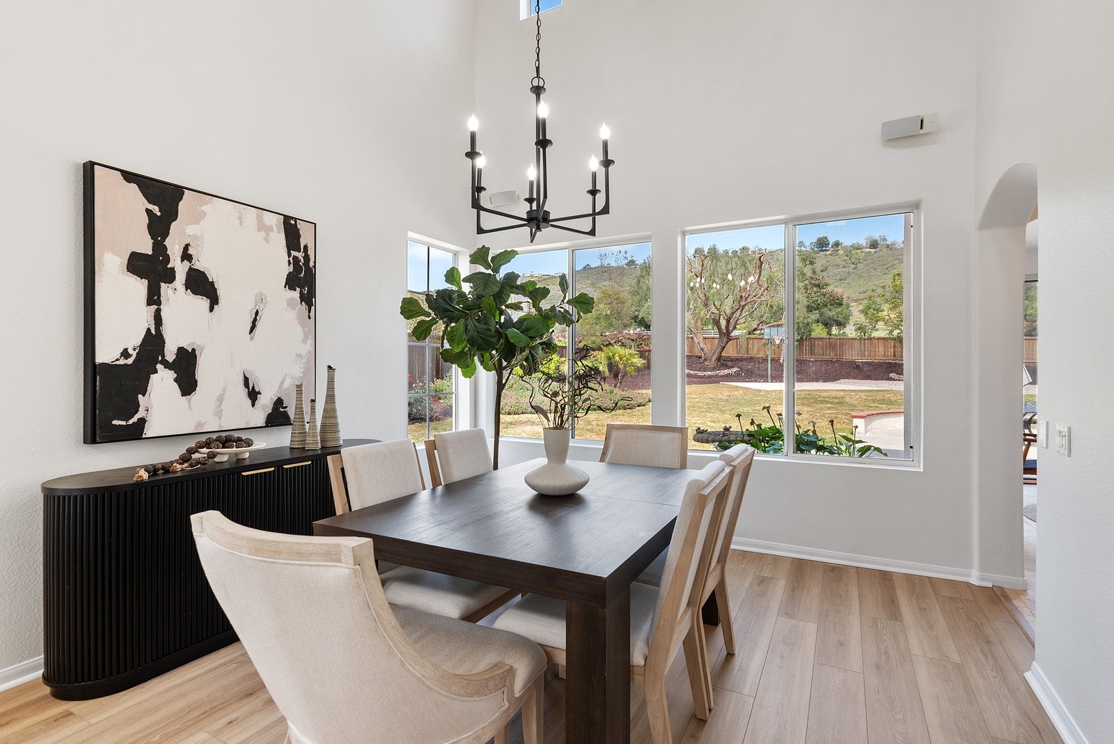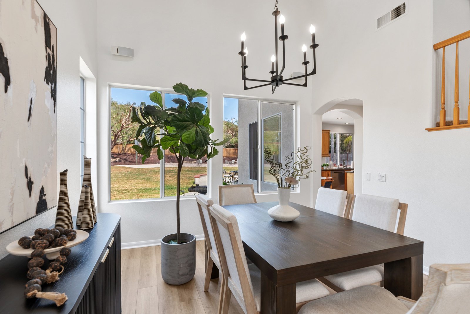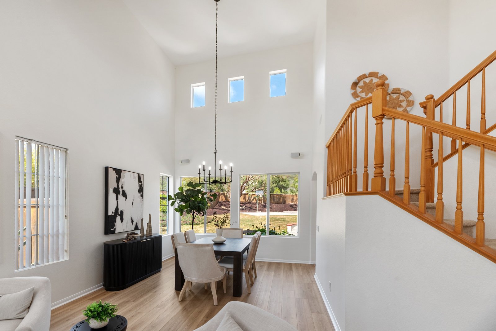 Welcome to your retreat in the highly sought-after Rose Ranch community on a quiet cul-de-sac. With an open layout and large backyard, this home offers endless space and ample ways to make it your own. Freshly painted inside and out, it welcomes you with a crisp, updated look that complements the peaceful outdoor setting. New vinyl floors and carpet have been installed throughout. Natural light fills the home, enhanced by impressive high ceilings. The 3BR/3BA layout includes an office that can double as a guest room, den, or craft space. The office and full bath are downstairs, offering convenience and privacy for guests. The living/dining room combo boasts 19-foot ceilings and plenty of room for large gatherings.