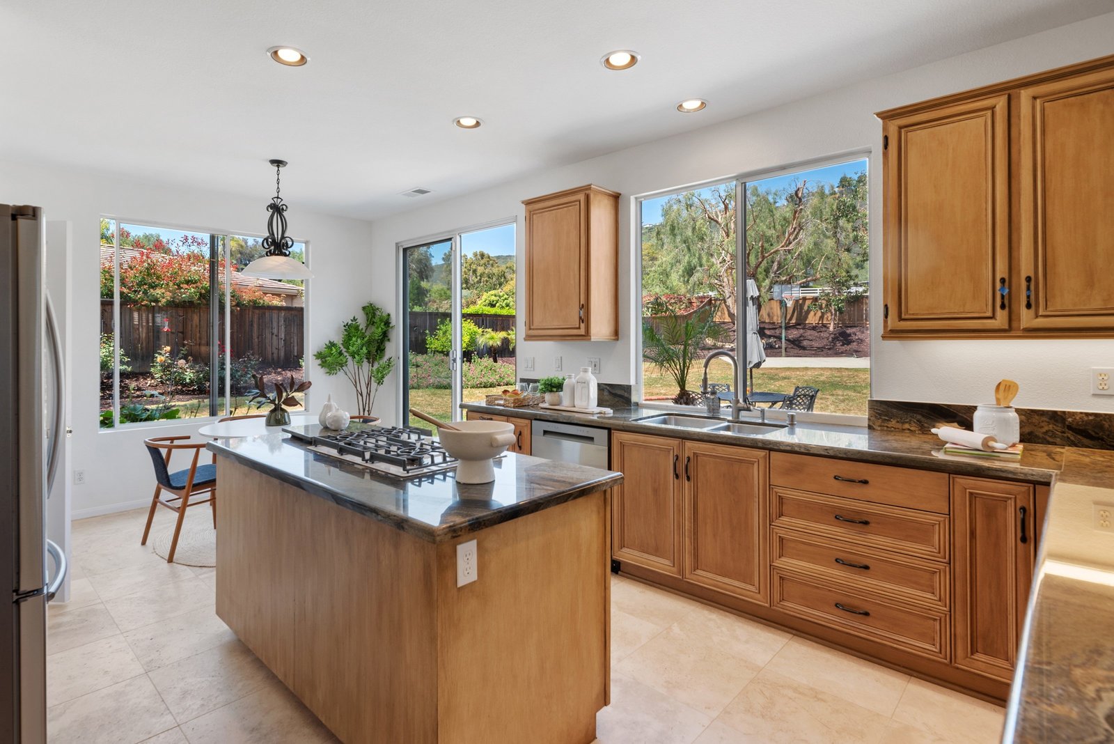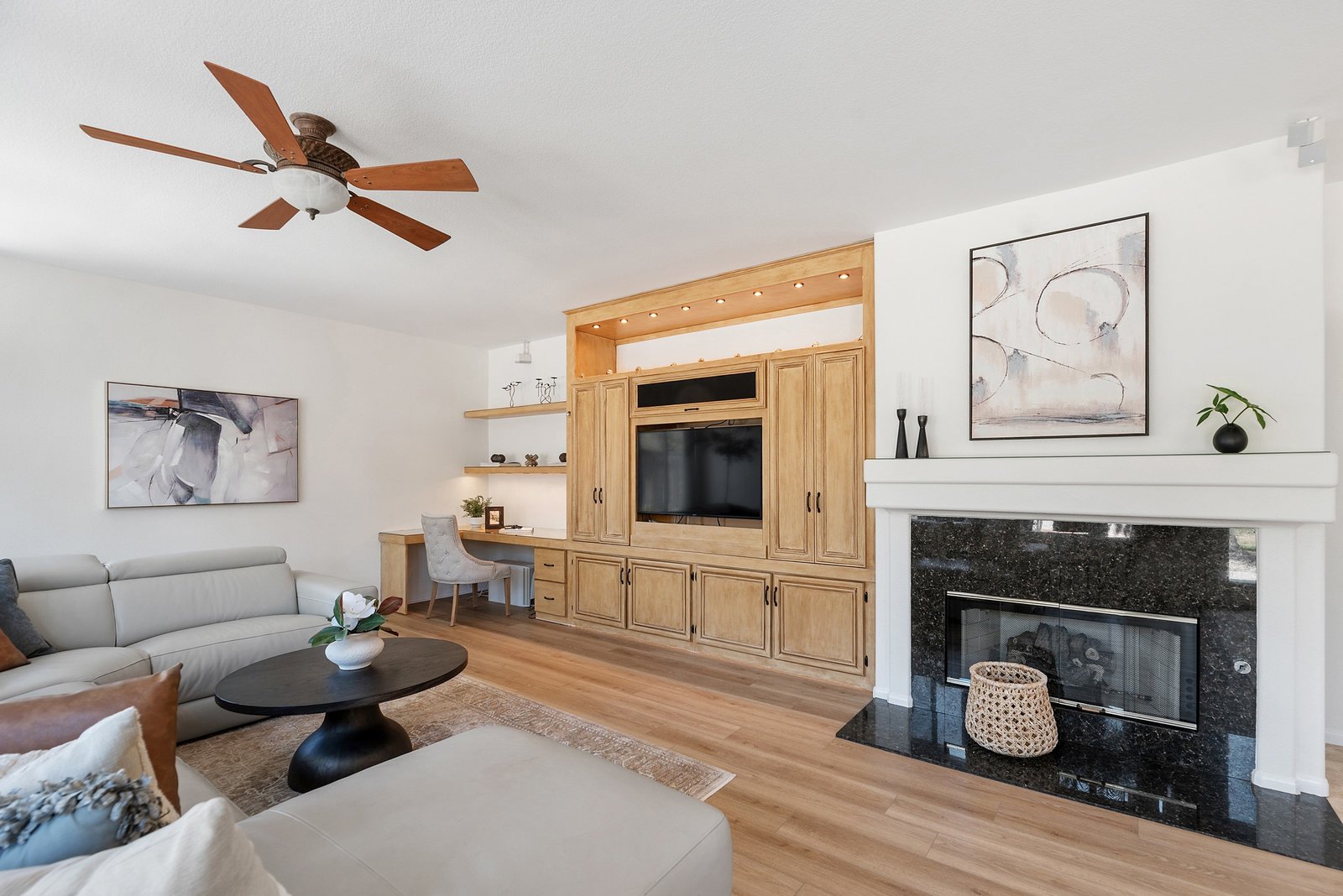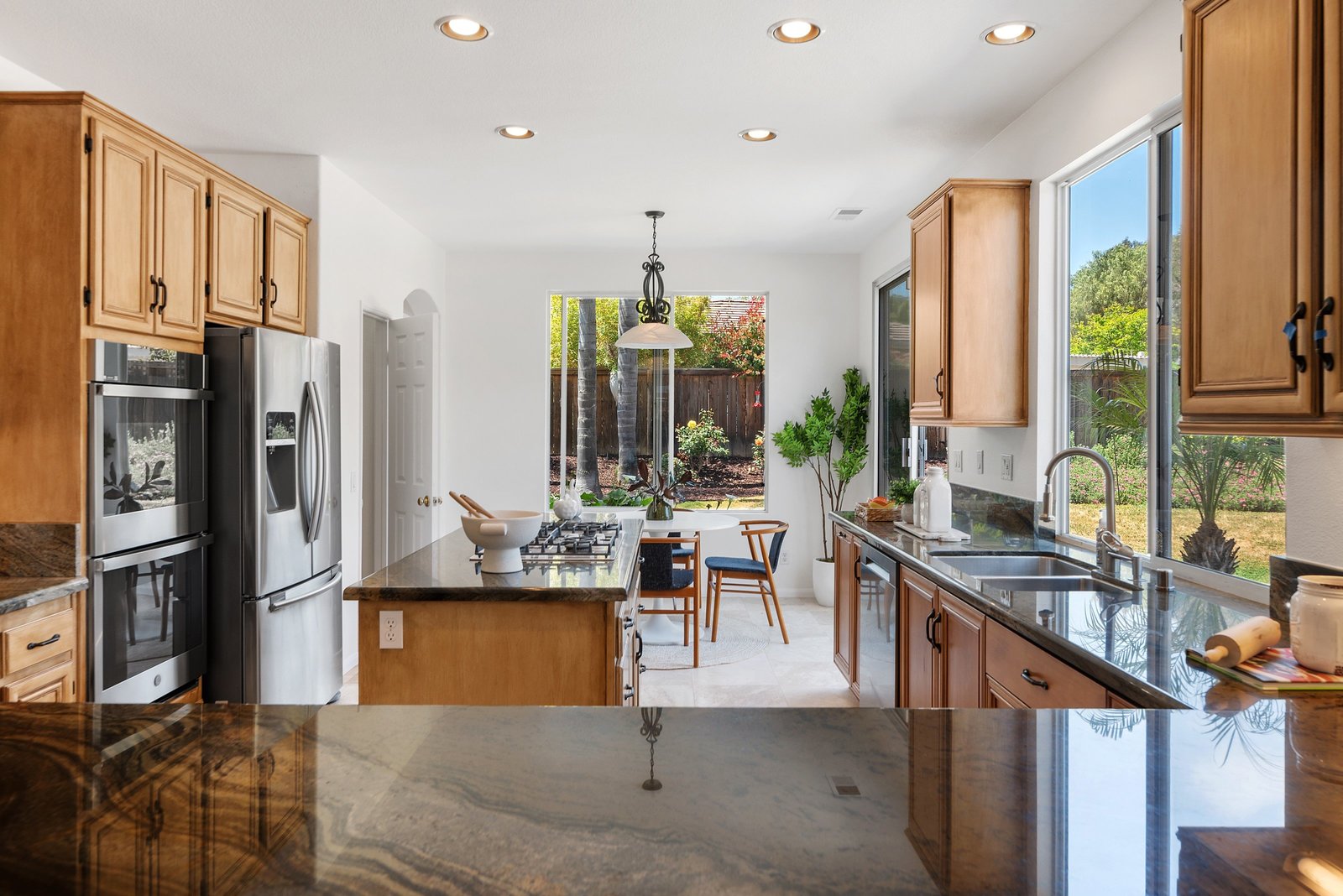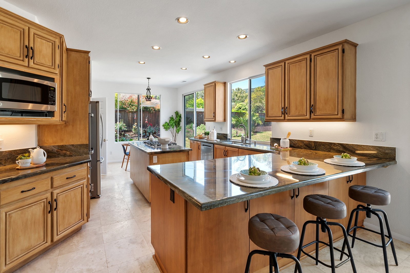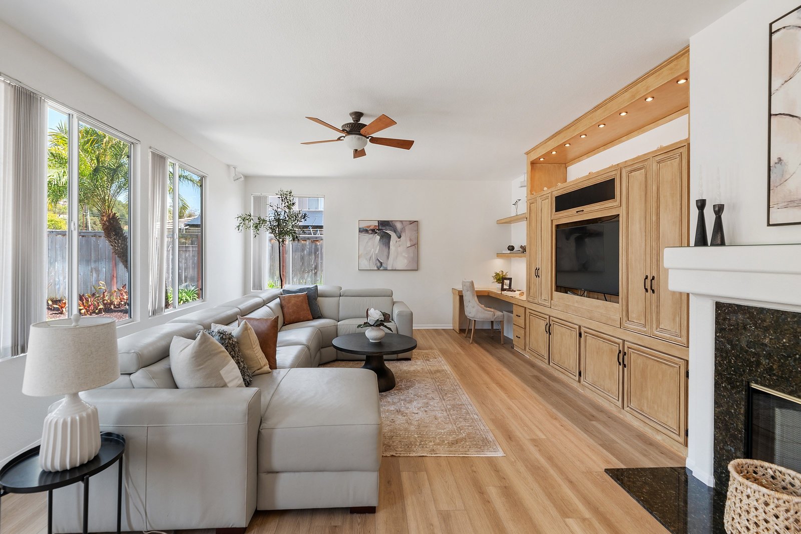 The family-style kitchen features a large island with granite countertops, a cooktop, stainless steel appliances, double ovens, a dry bar, and peninsula seating for four. Abundant cabinetry provides plenty of storage. The spacious family room, wired for surround sound, includes a built-in niche with cabinets - perfect for games, music, or movie night essentials. A cozy fireplace adds warmth for quiet evenings in.