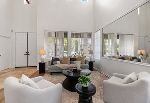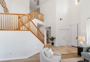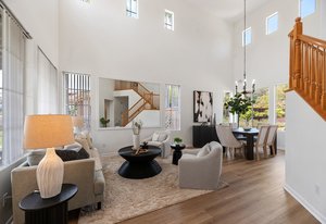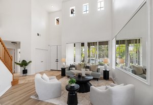 Welcome to your retreat in the highly sought-after Rose Ranch community on a quiet cul-de-sac. With an open layout and large backyard, this home offers endless space and ample ways to make it your own. Freshly painted inside and out, it welcomes you with a crisp, updated look that complements the peaceful outdoor setting. New vinyl floors and carpet have been installed throughout. Natural light fills the home, enhanced by impressive high ceilings. The 3BR/3BA layout includes an office that can double as a guest room, den, or craft space. The office and full bath are downstairs, offering convenience and privacy for guests. The living/dining room combo boasts 19-foot ceilings and plenty of room for large gatherings.
